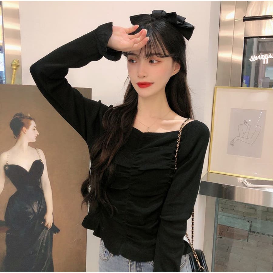 ざっくりと開いたネックでデコルテをすっきりと見せ、大人っぽいシルエットを演出します。