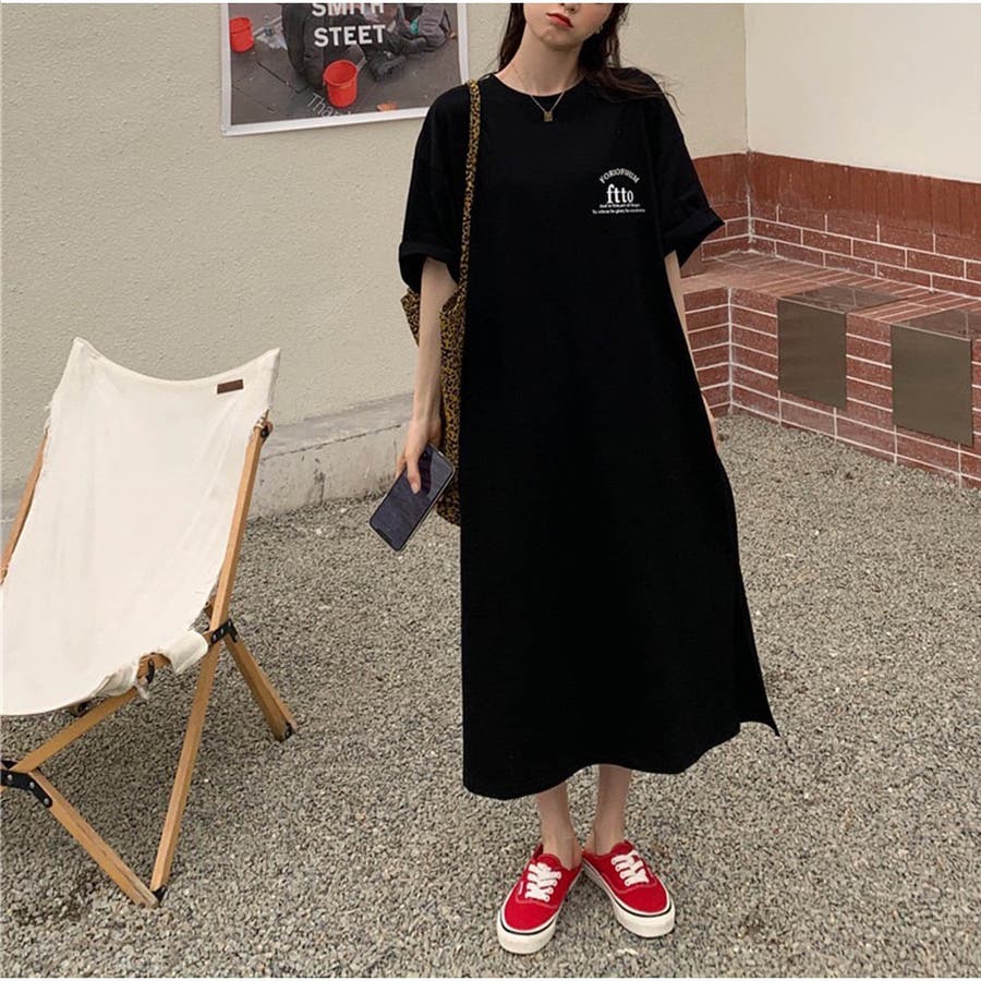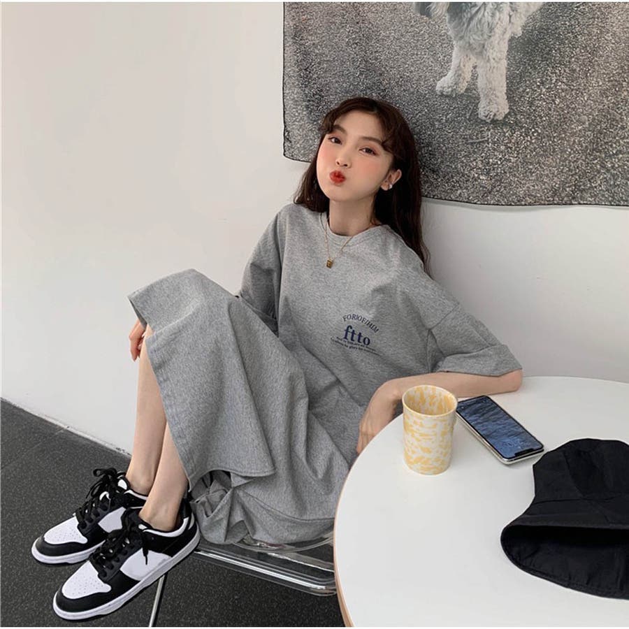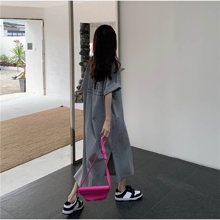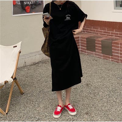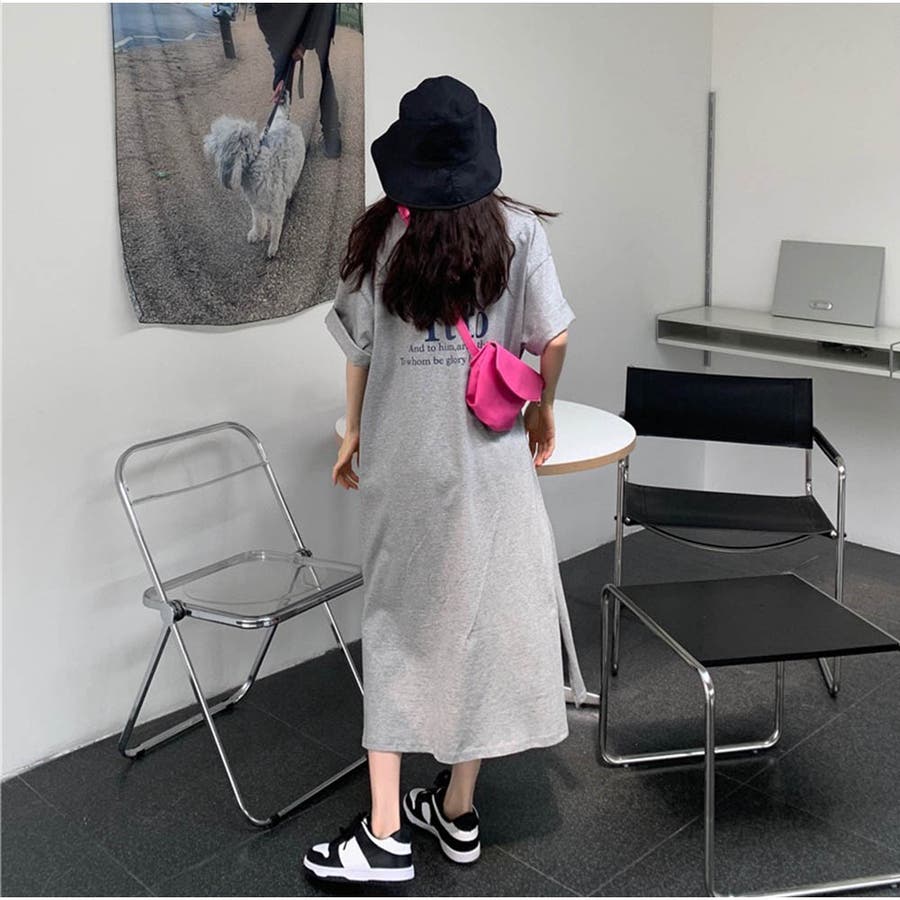 Tシャツワンピース 前後ロゴプリント ミモレワンピ