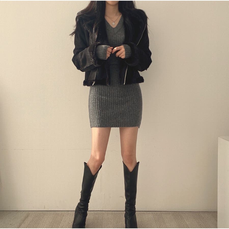 膝上のミニ丈が足元を魅力的に見せ、Vネックデザインが華奢見え効果をもたらします