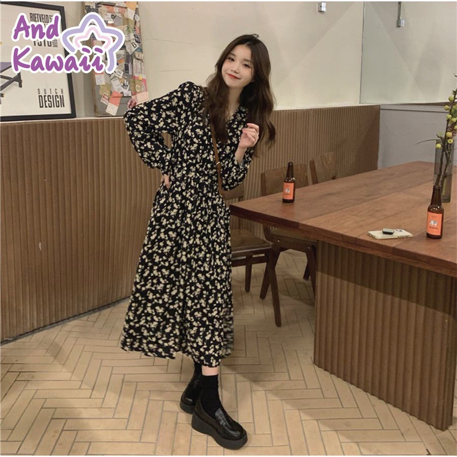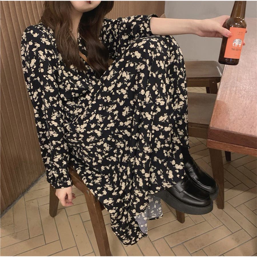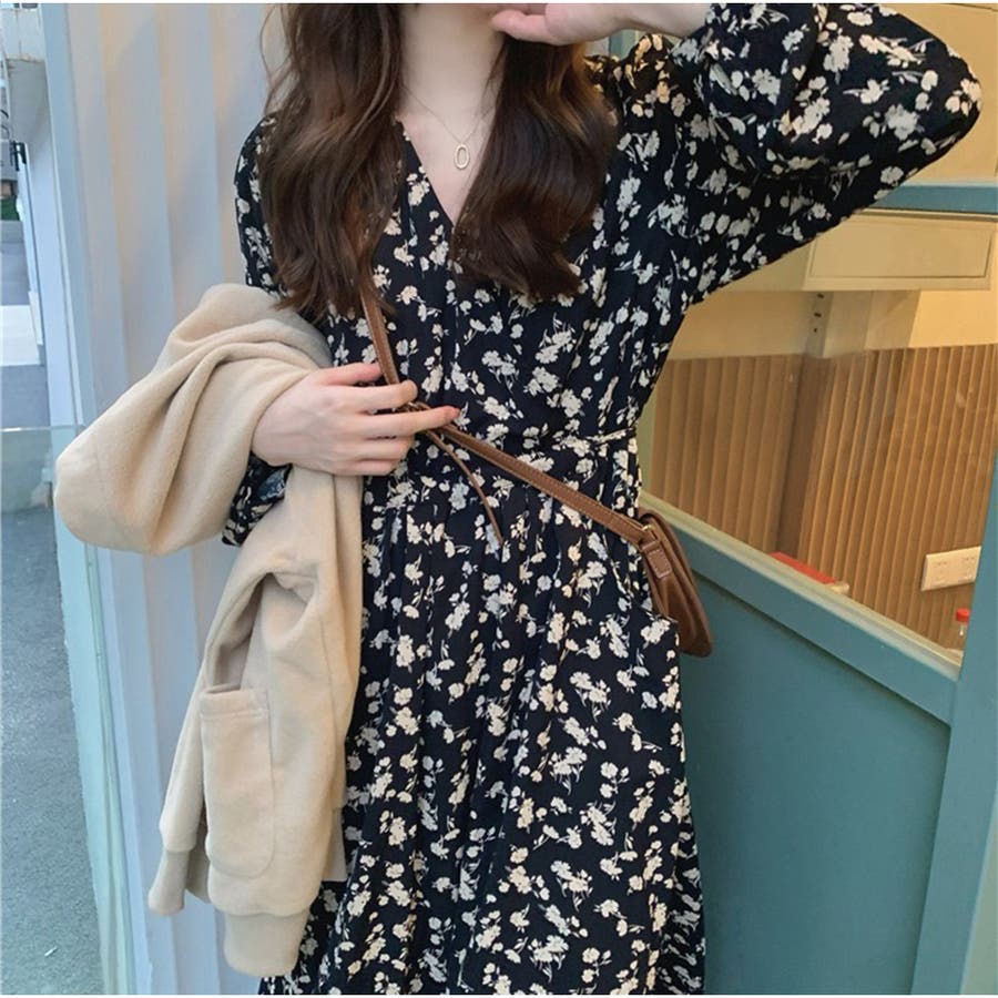花柄 ロングワンピース Vネック 長袖 花柄カジュアルワンピース 韓国風