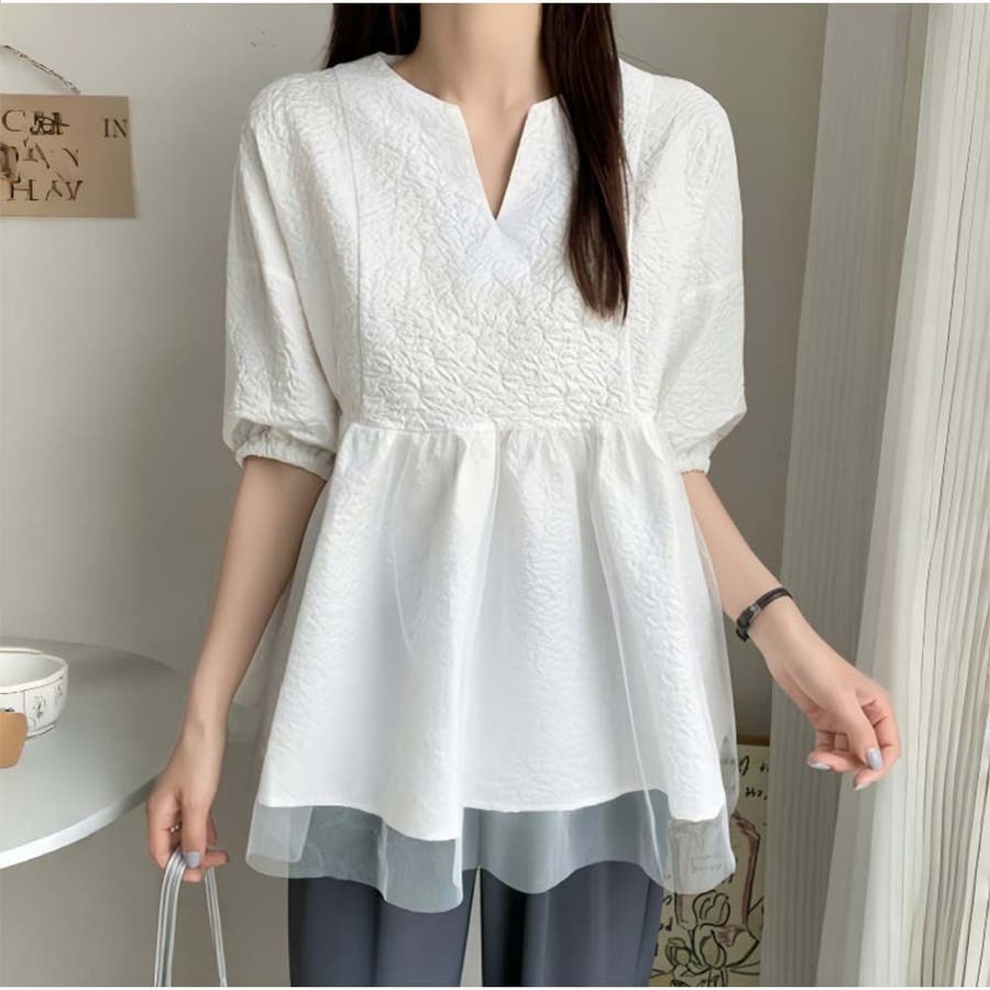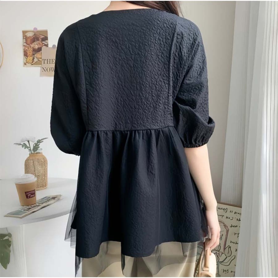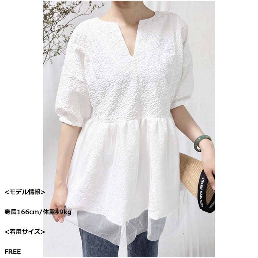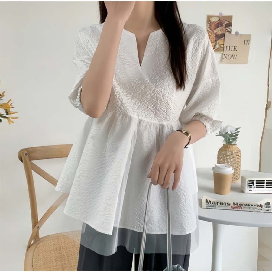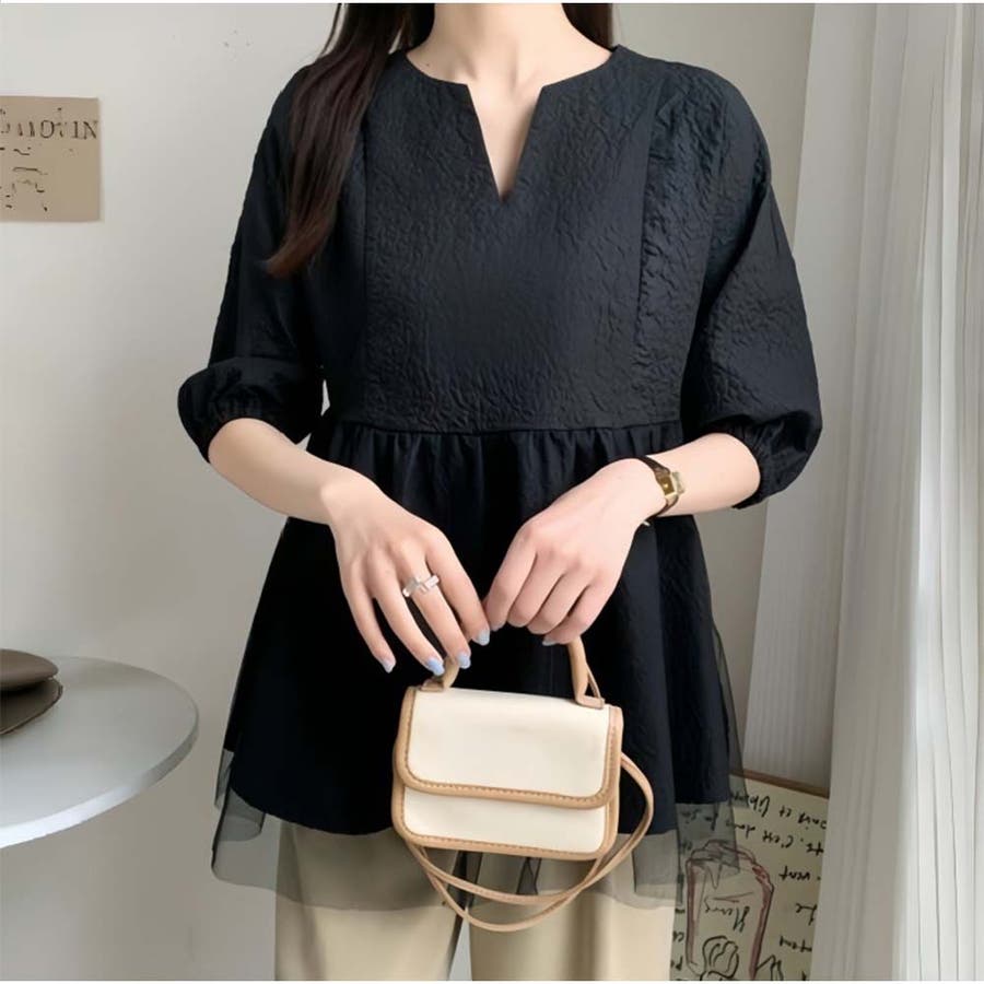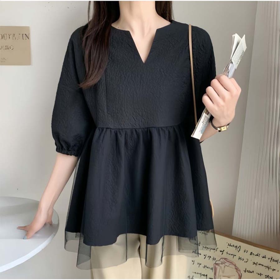 韓国ファッションチュールドッキング五分袖キーネックペプラムブラウス 切替BIGブ…