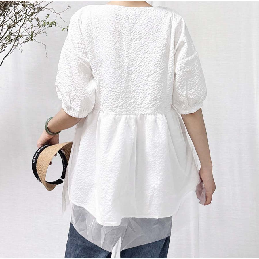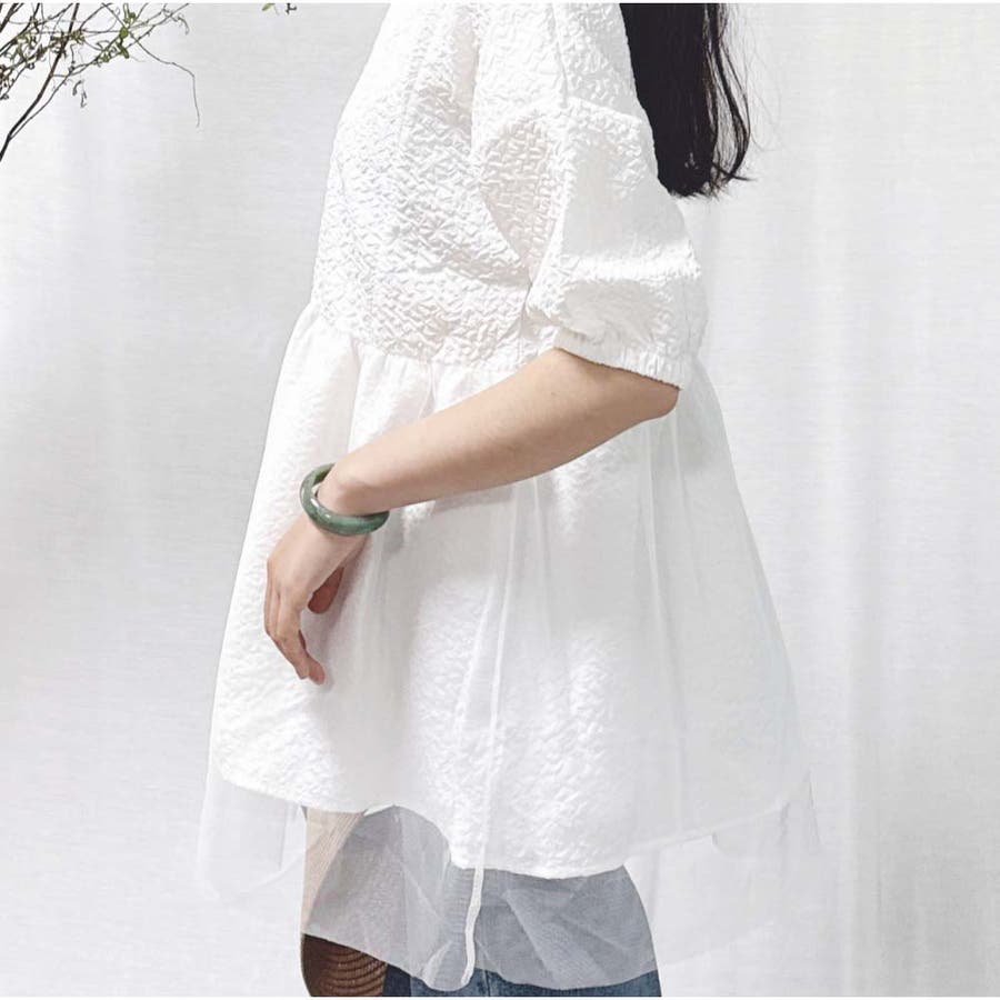 今季トレンドのチュールをペプラムブラウスにドッキングした女性らしい1枚が完成しました。