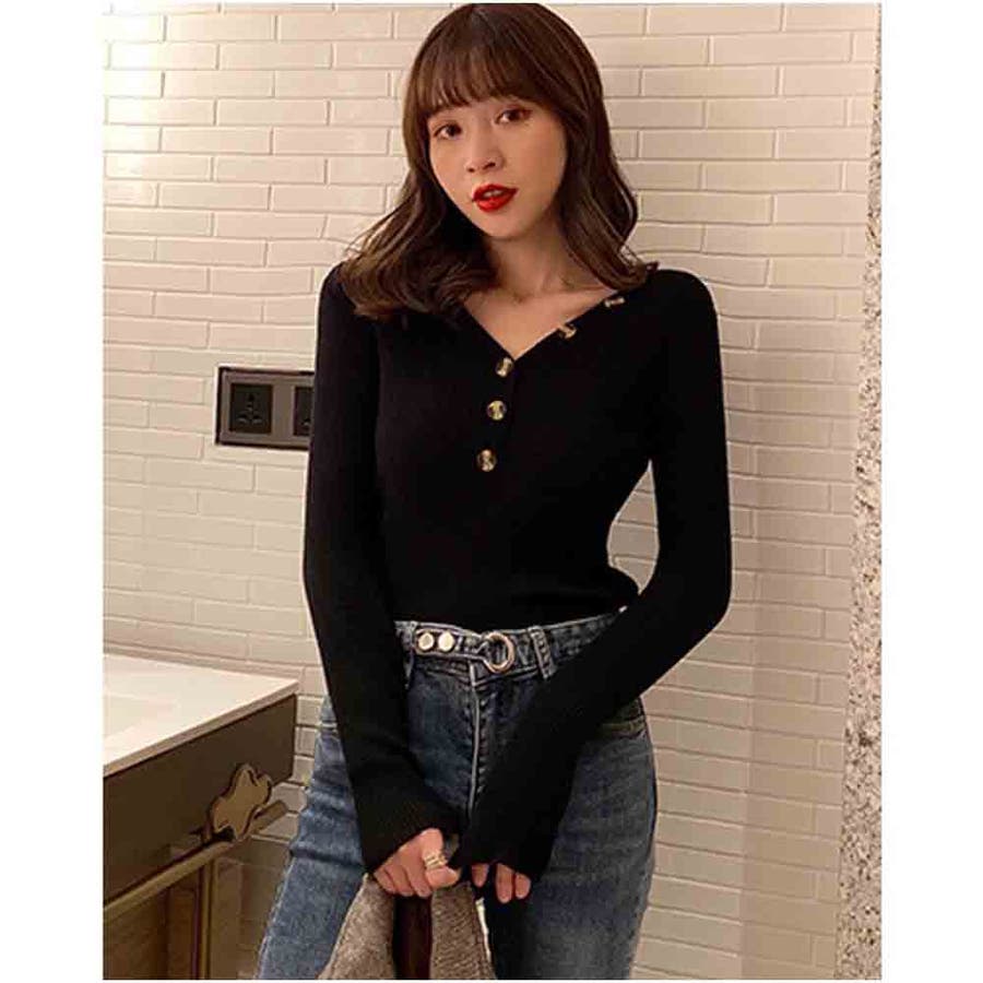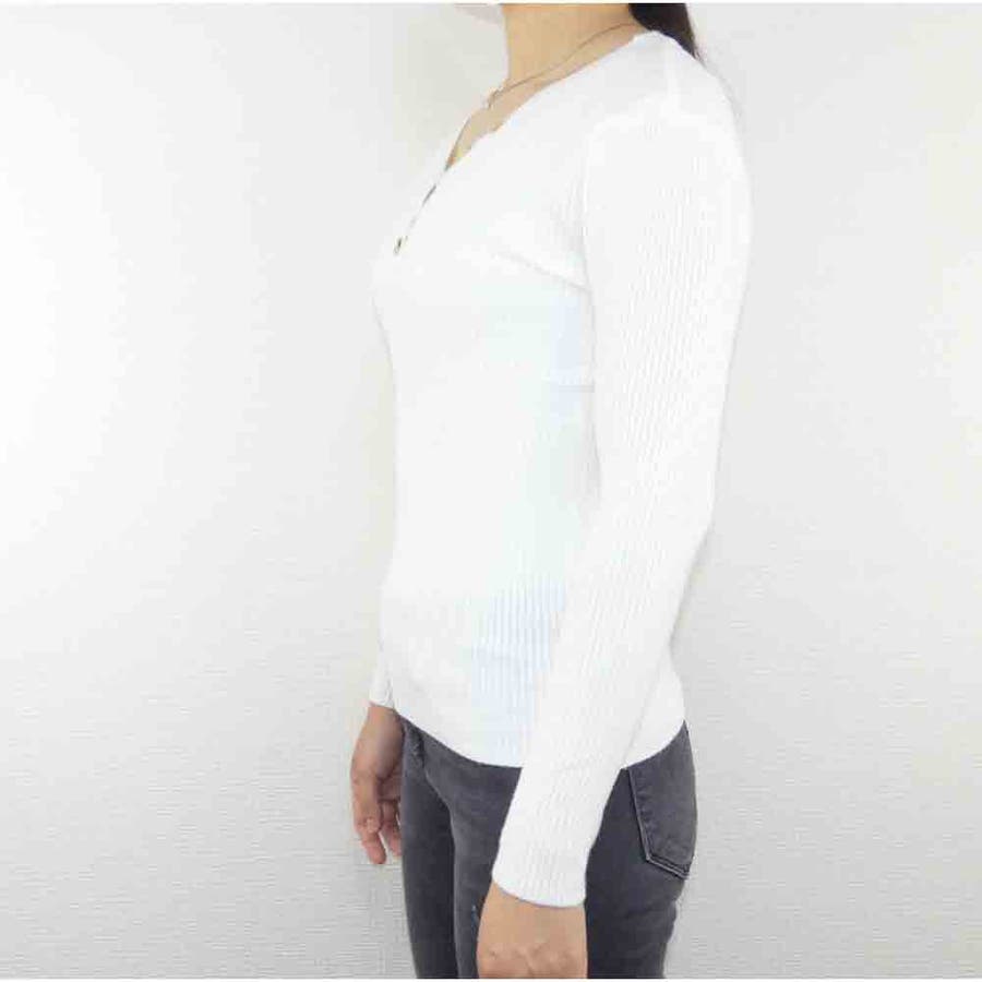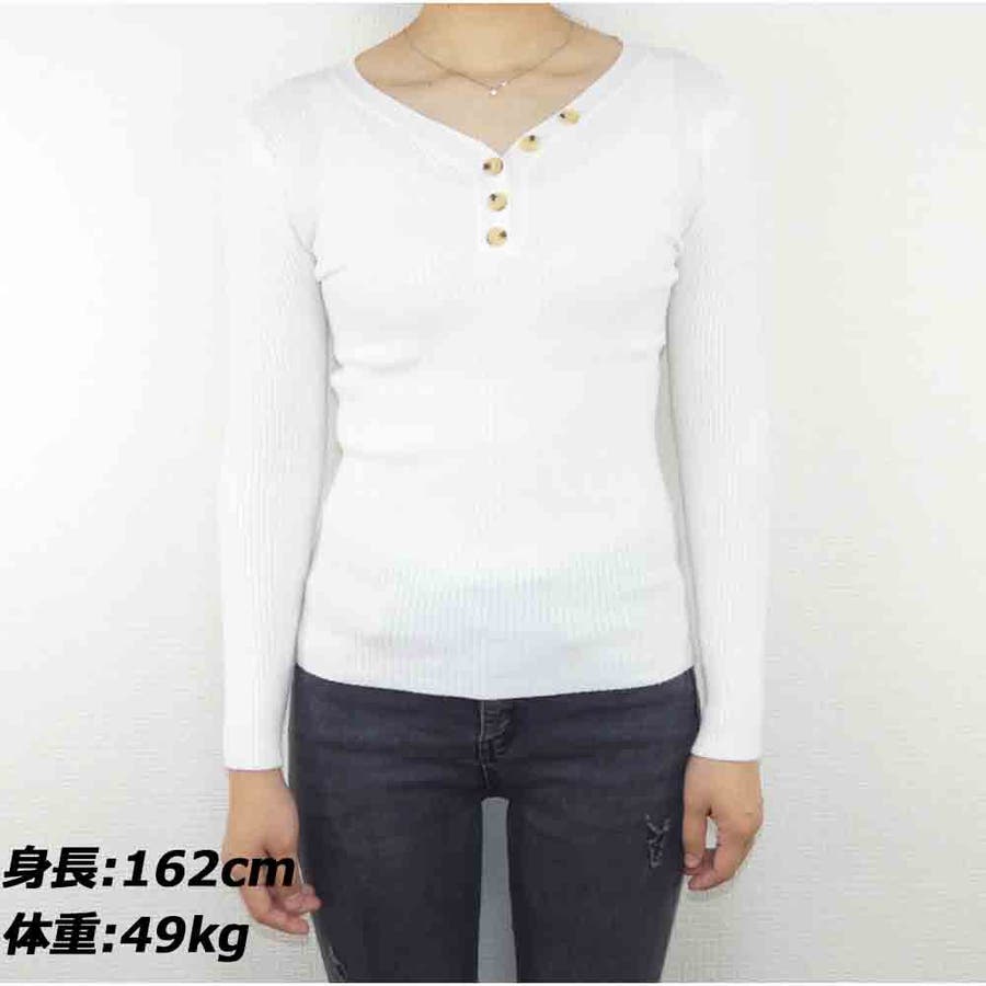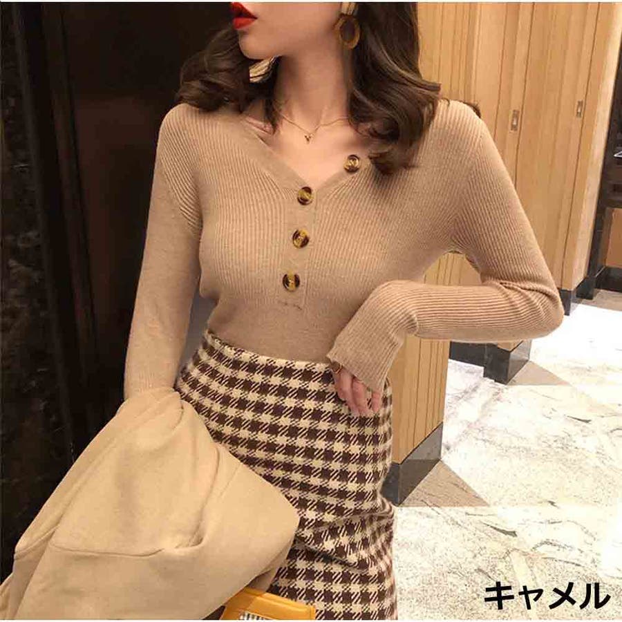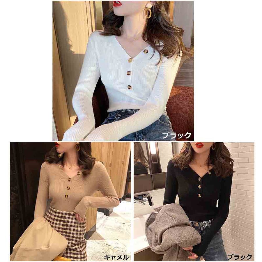 リブニット 長袖 ボタン 無地 レディース Vネック 韓国ファッション