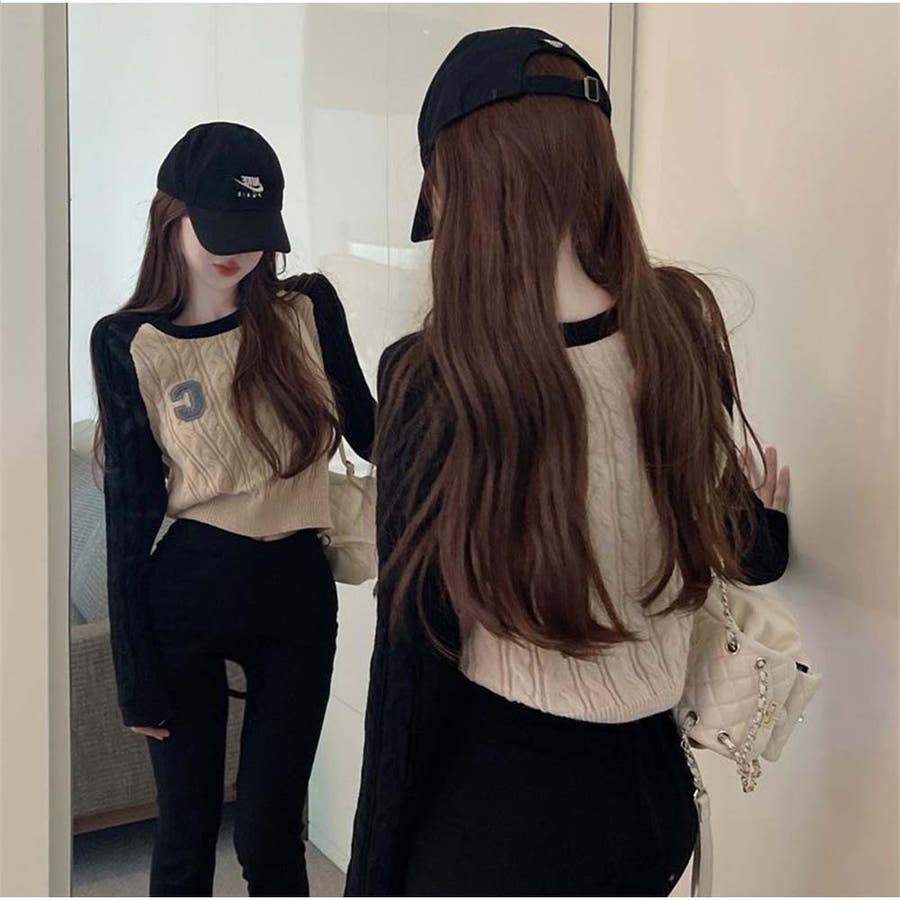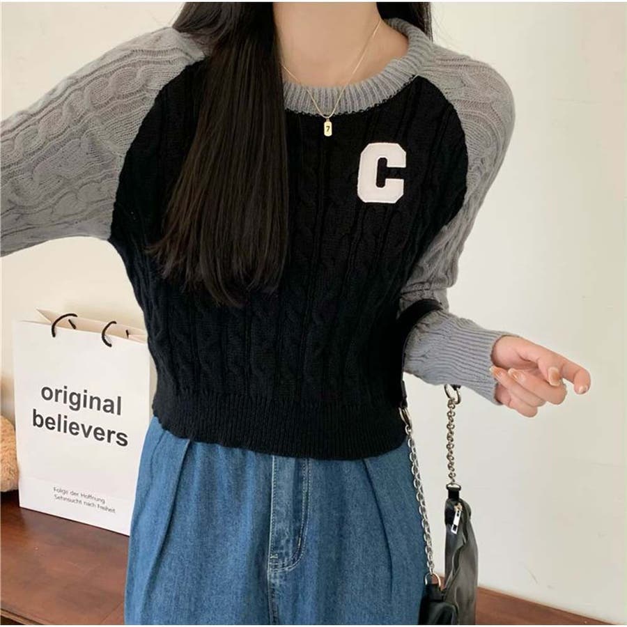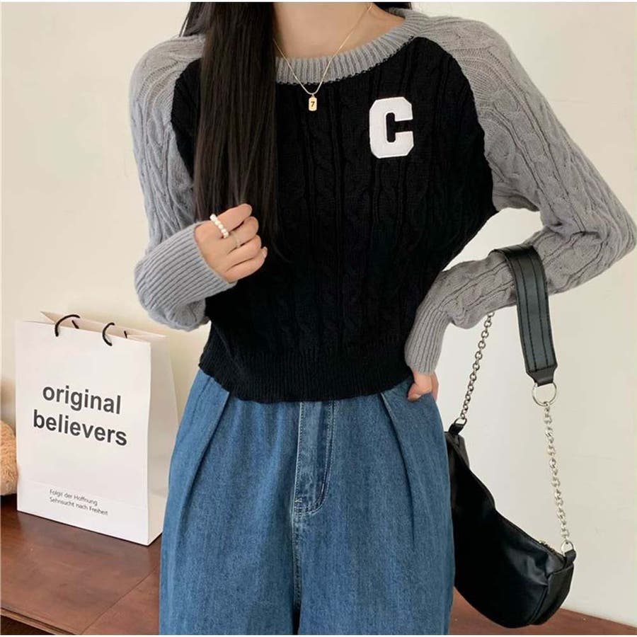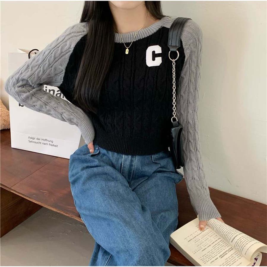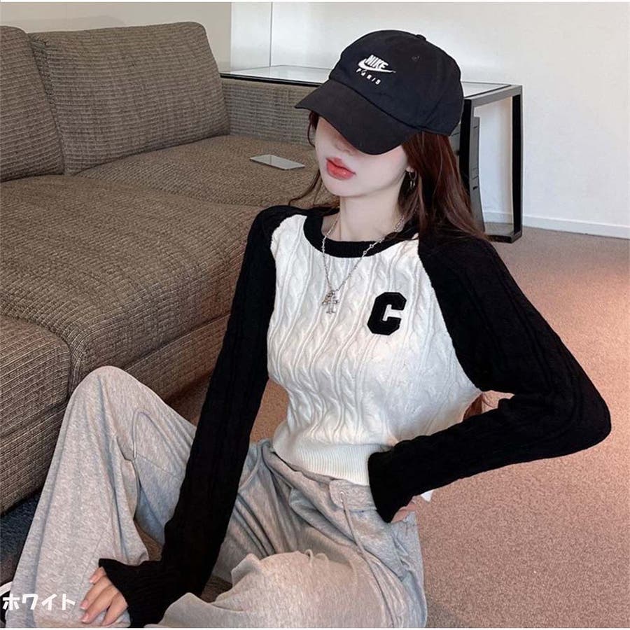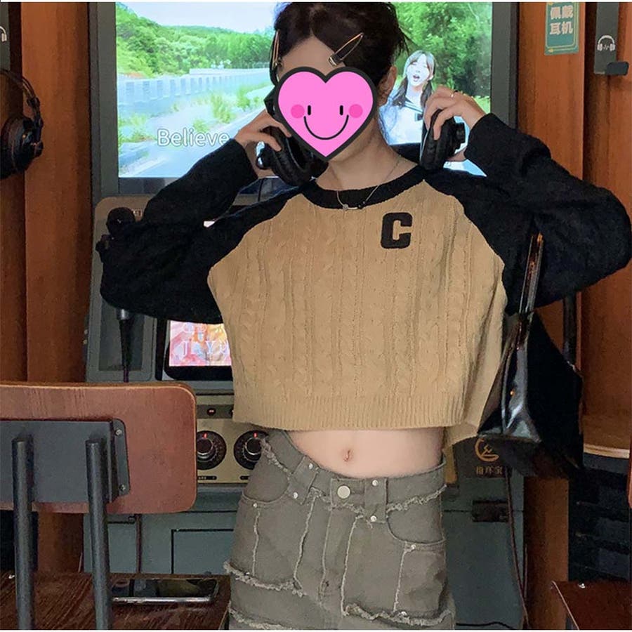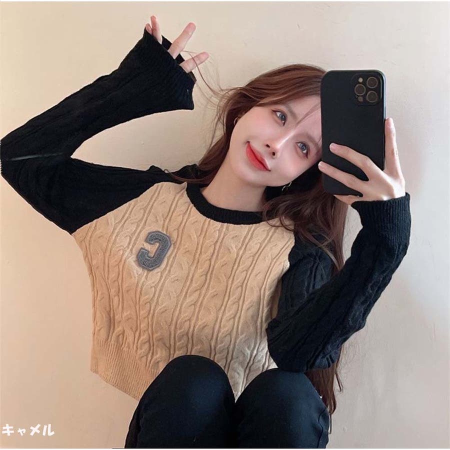 ニットショート丈 長袖ニットトップス 秋冬 韓国 ロゴ刺繡セーター