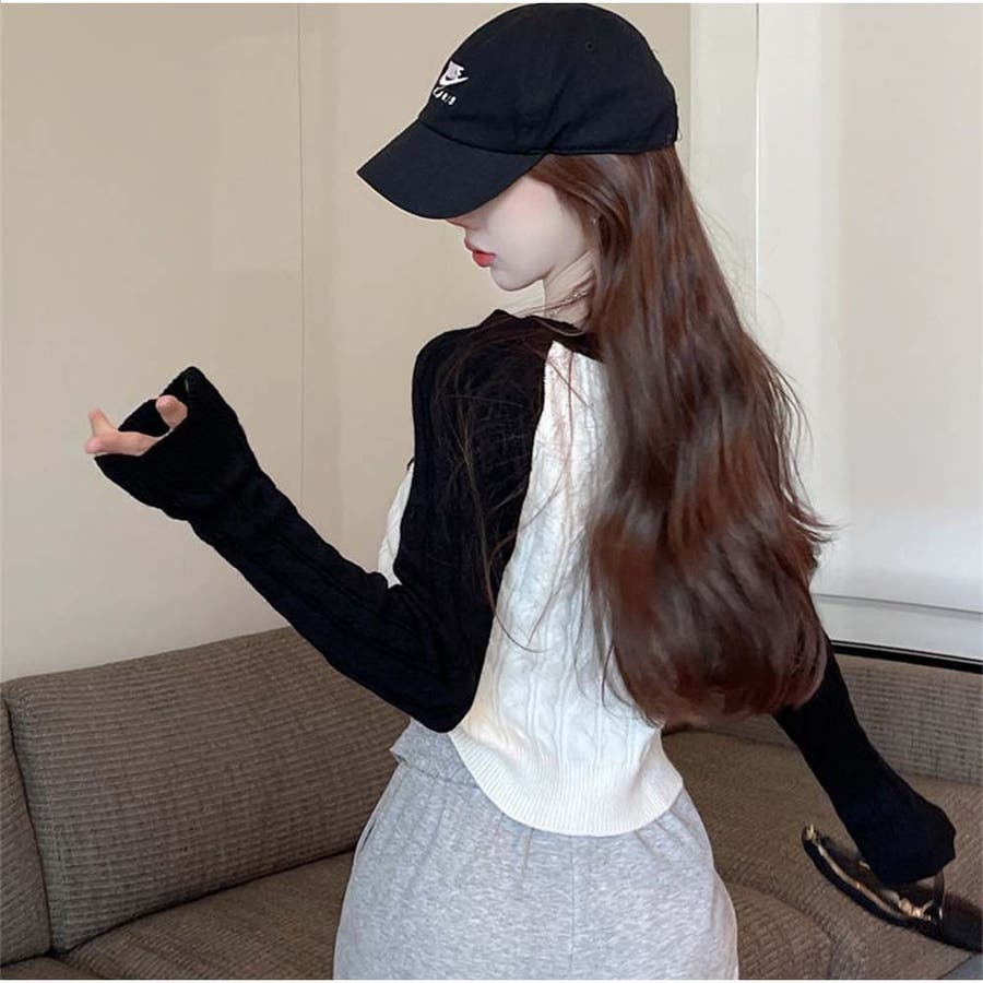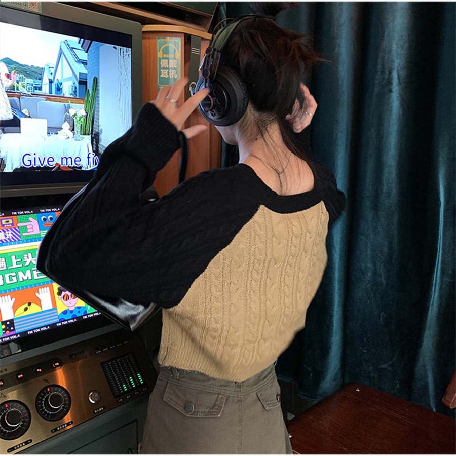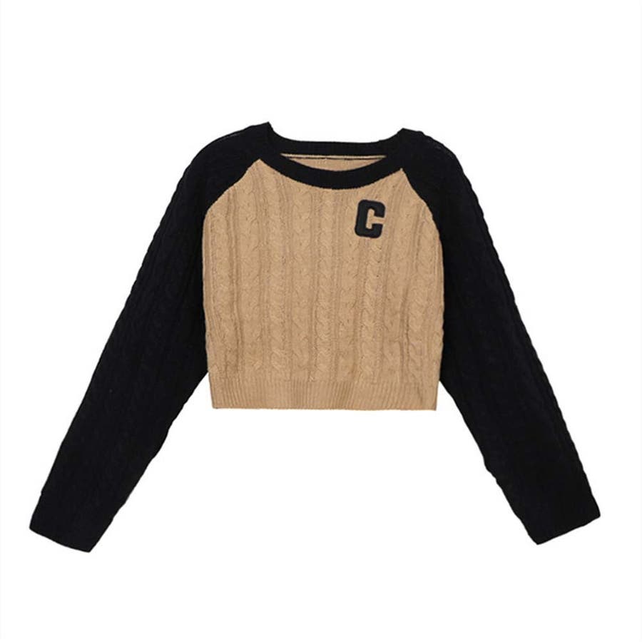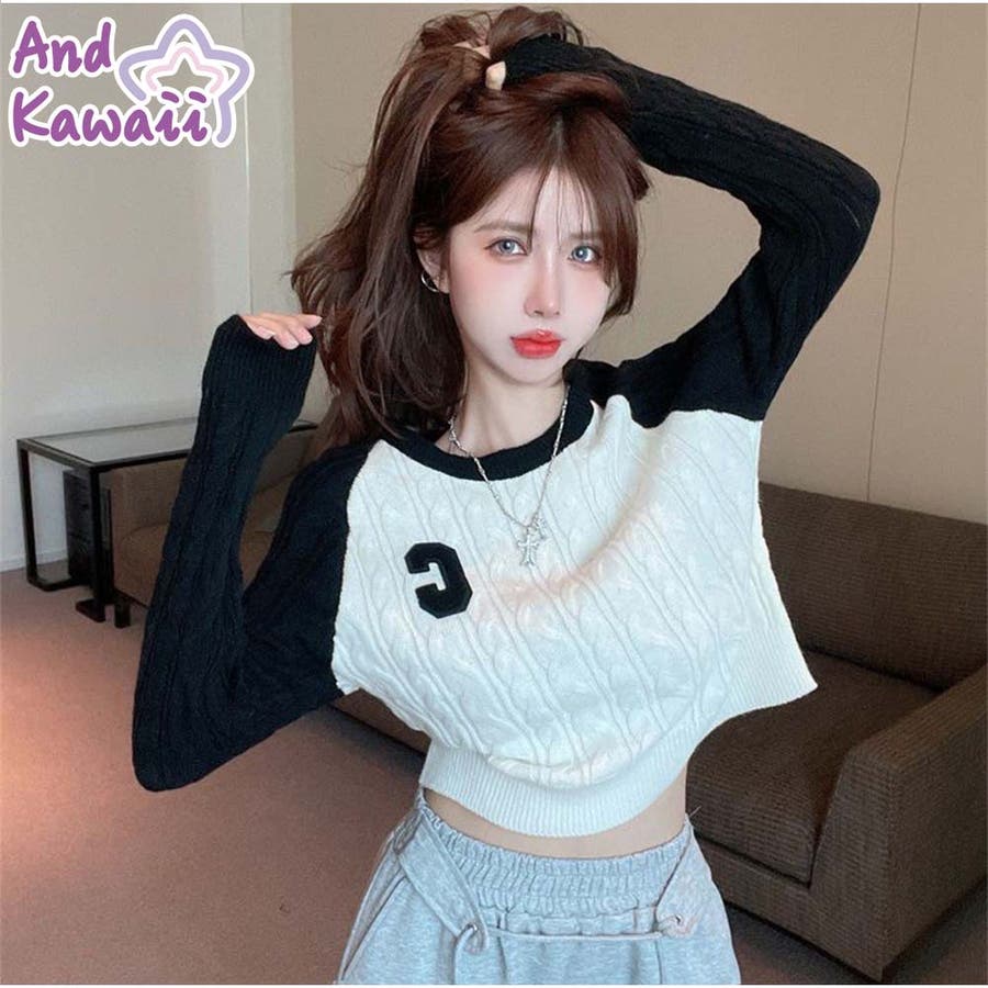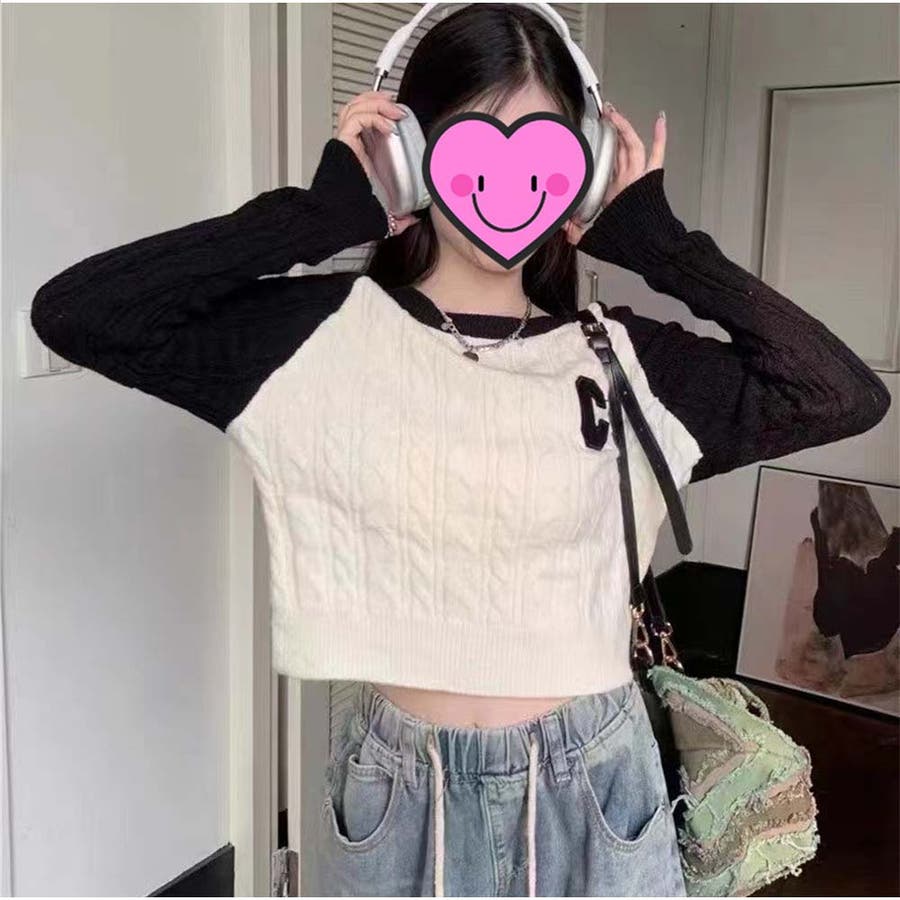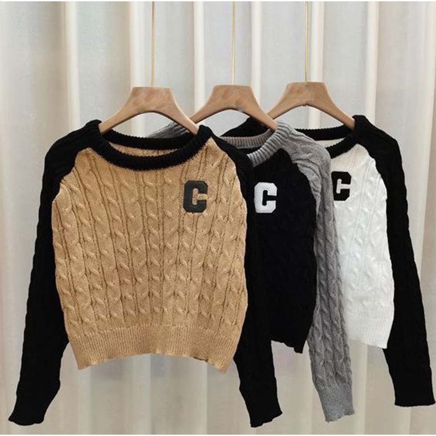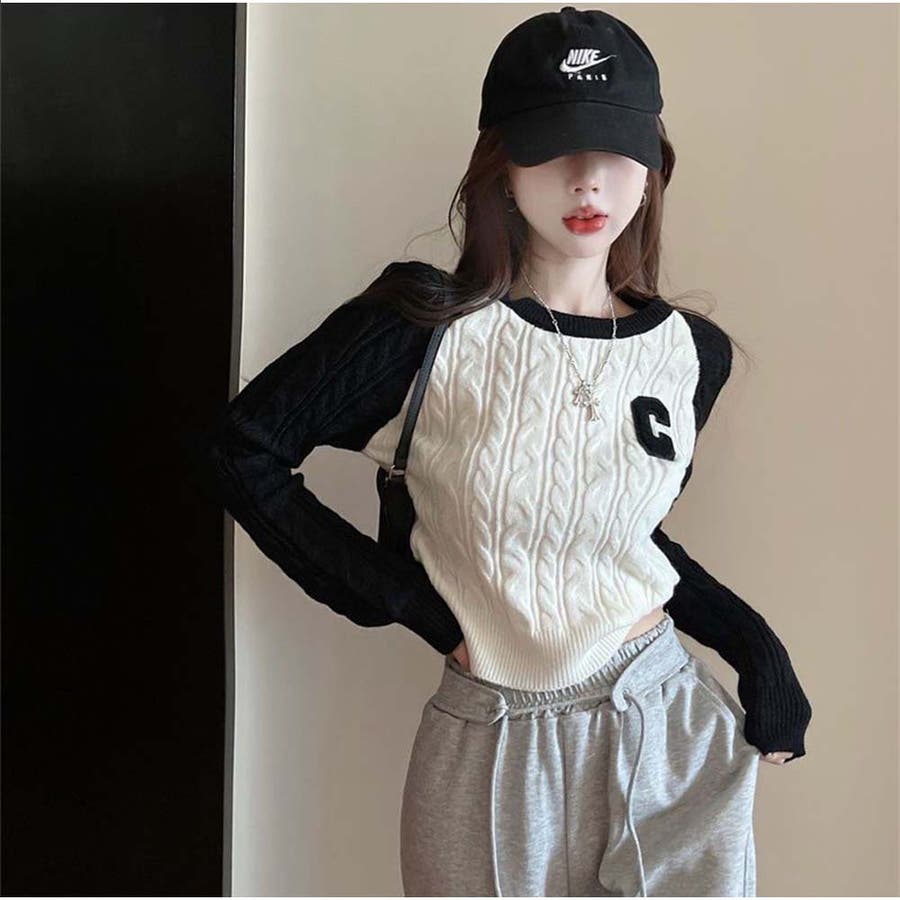ニットショート丈 長袖ニットトップス 秋冬 韓国 ロゴ刺繡セーター