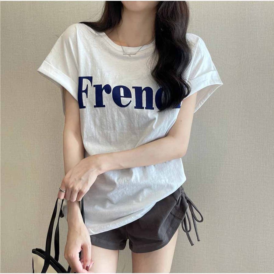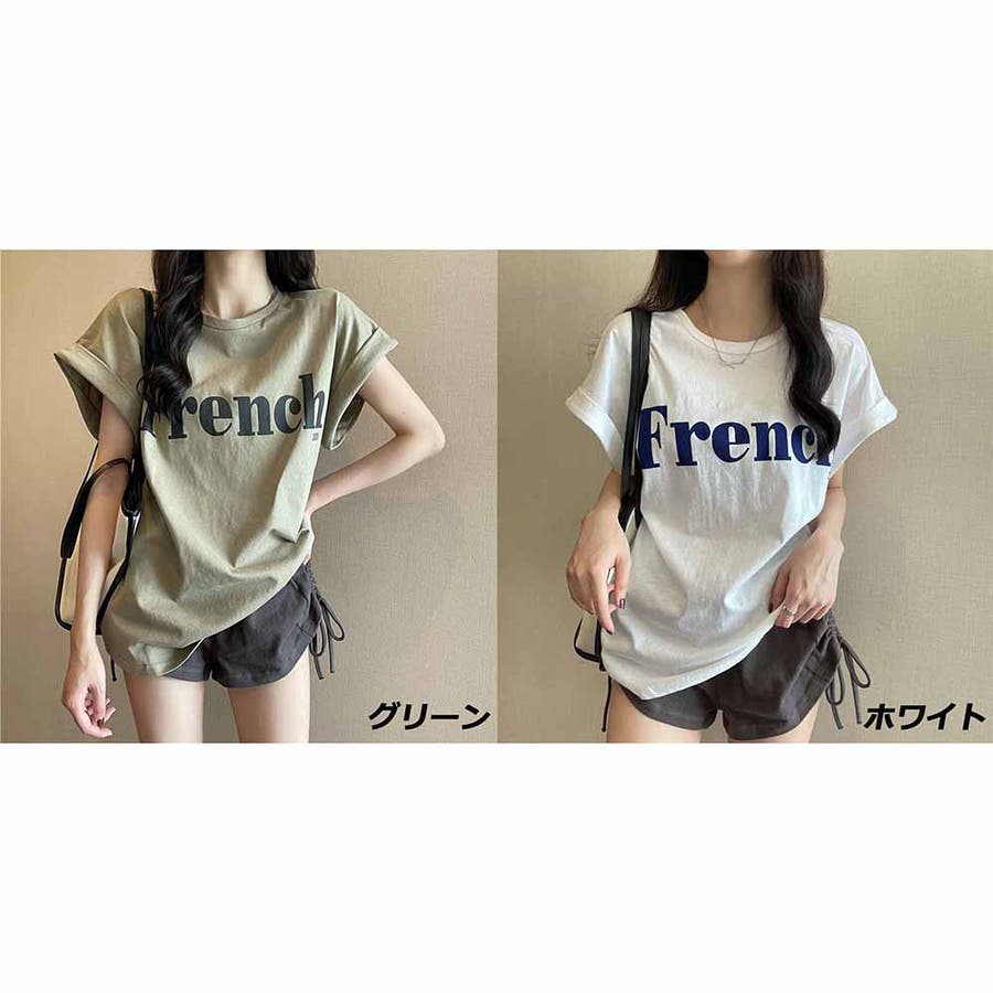 ロゴプリント フレンチスリーブ Tシャツ クルーネック 着痩せ トップス