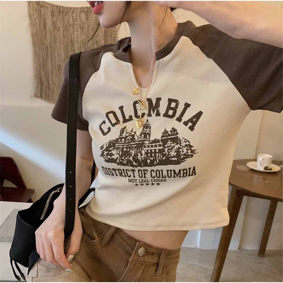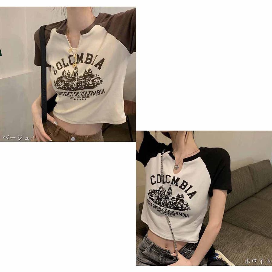 Vネック半袖Tシャツ ショート丈 ロゴプリント レディース 夏韓国ファッション