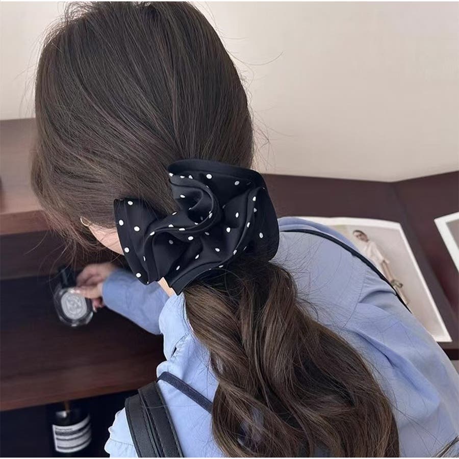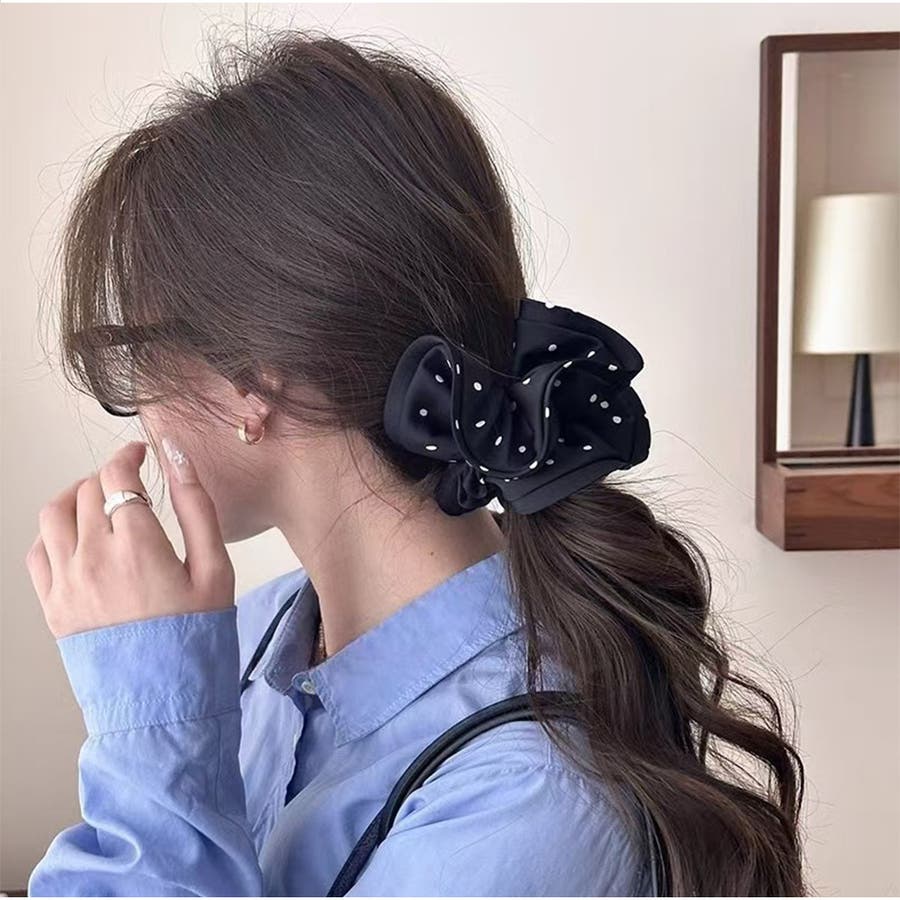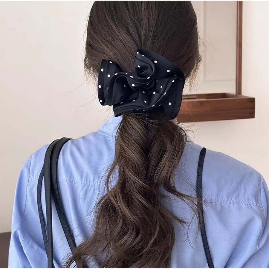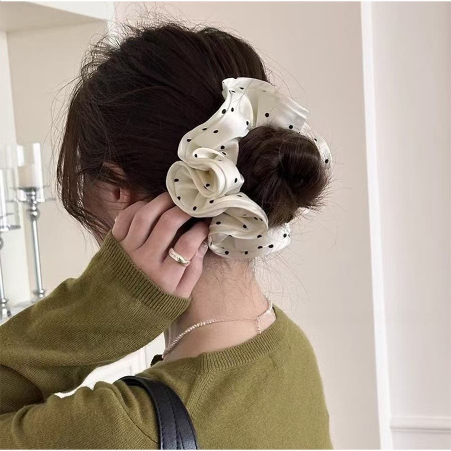 レトロで上品なドット柄が目を引く、ボリューム感たっぷりのヘアシュシュ。