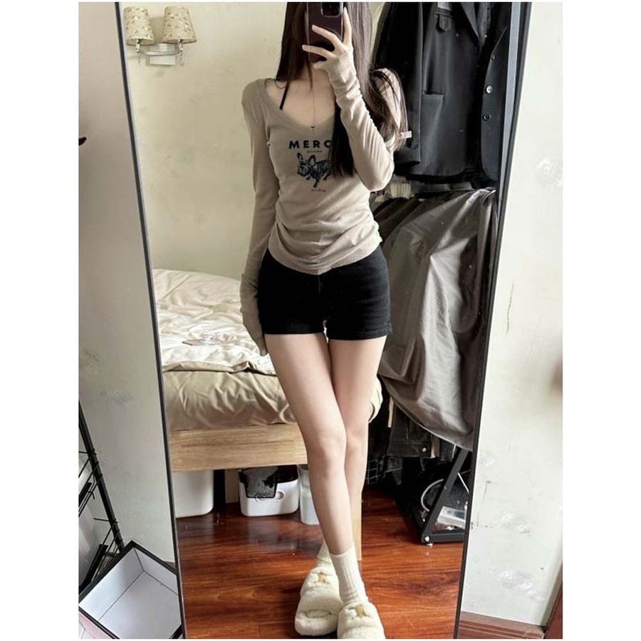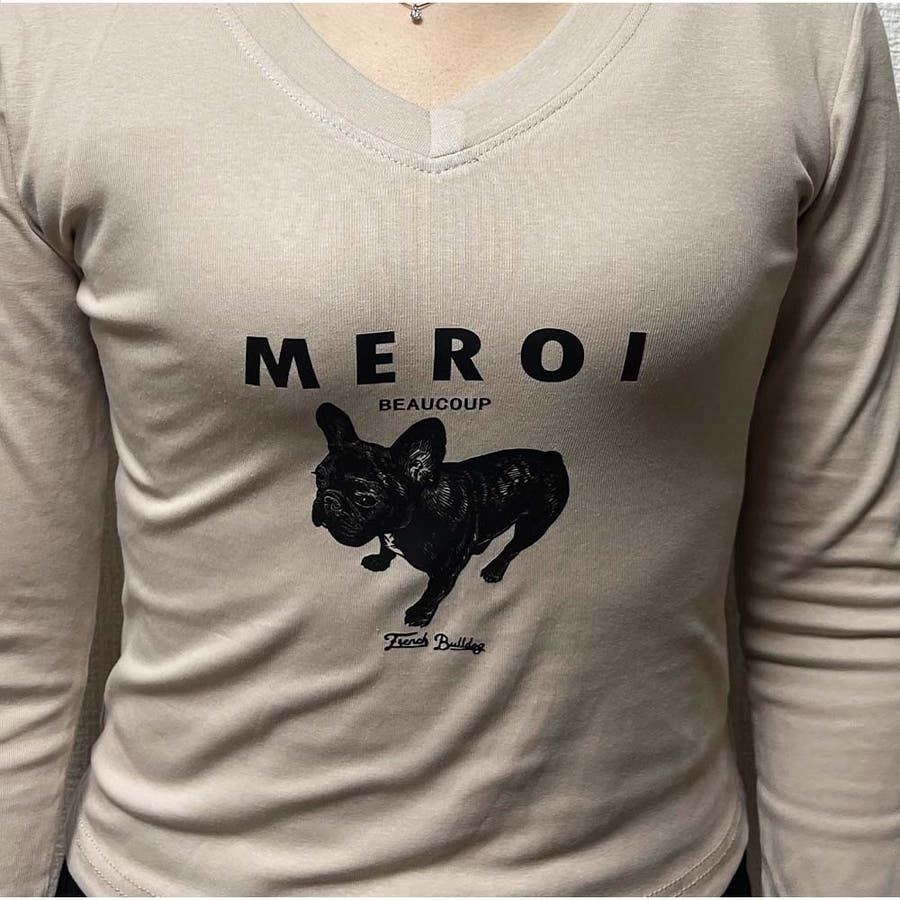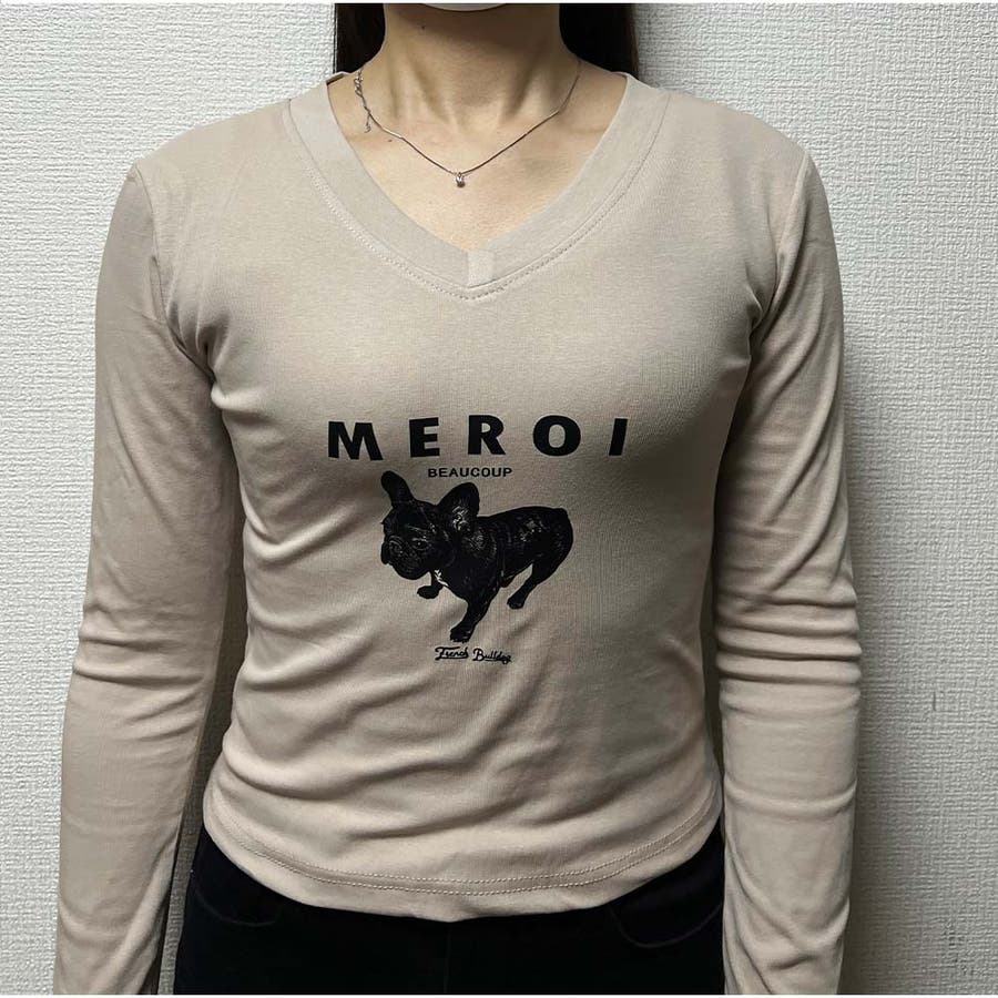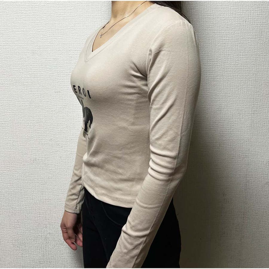 長袖Tシャツ Vネック スリムフィット レディース 韓国 ロゴプリント