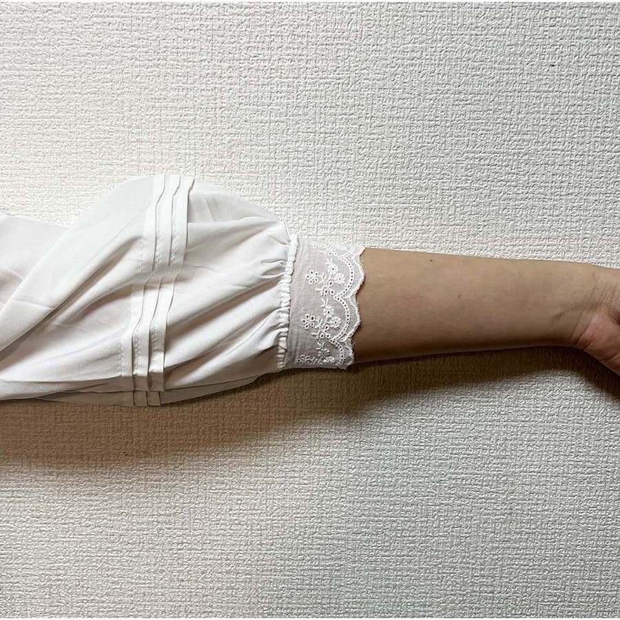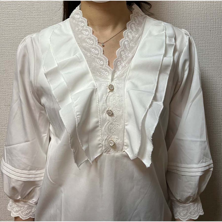 首元と袖口に施された刺繍デザインがアクセントで、顔周りを華やかに演出します