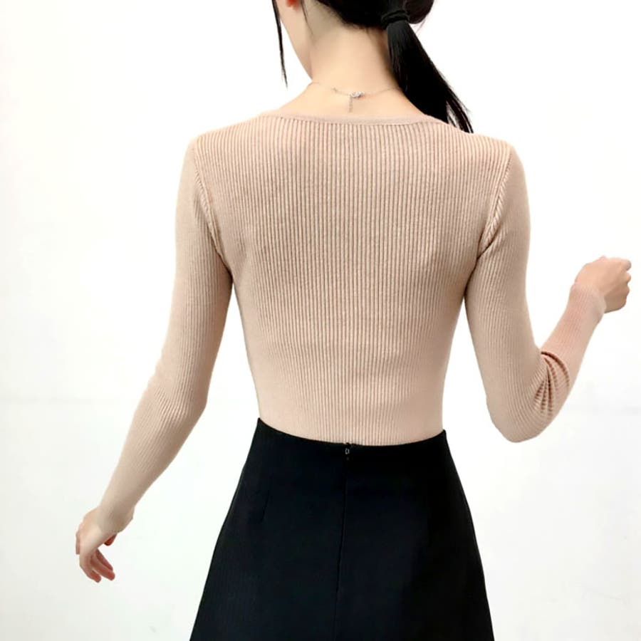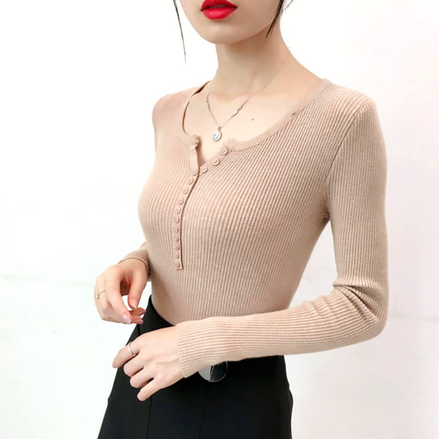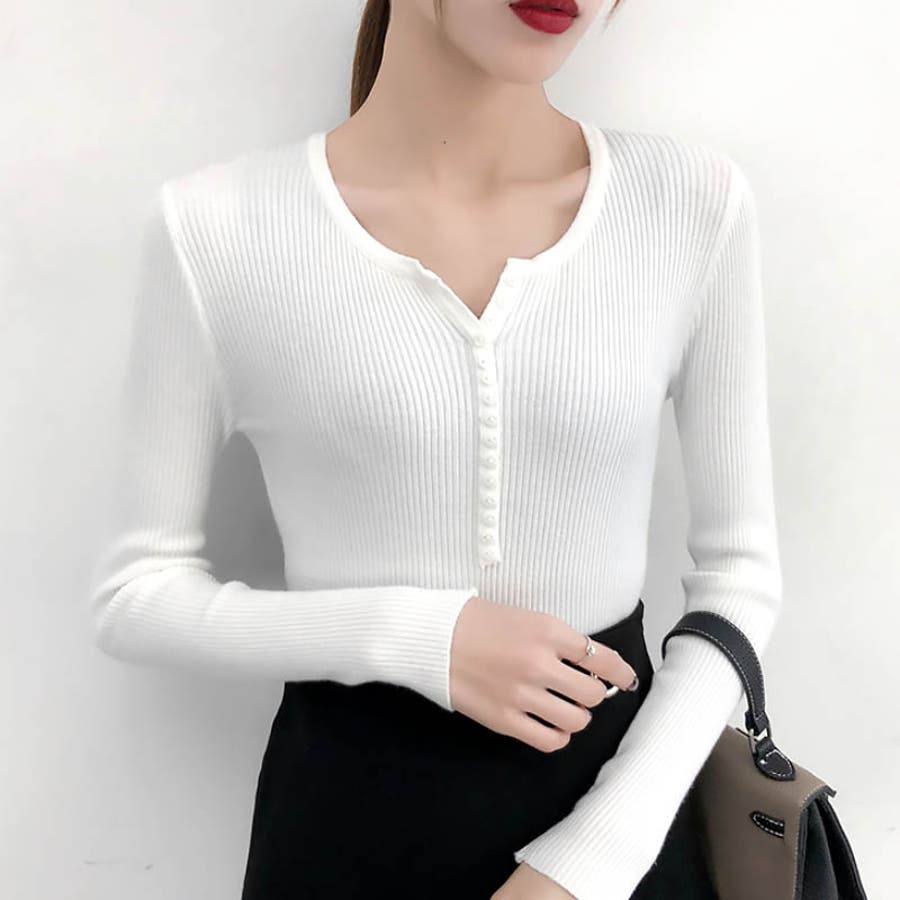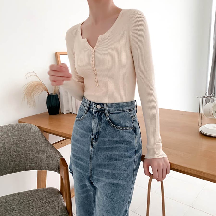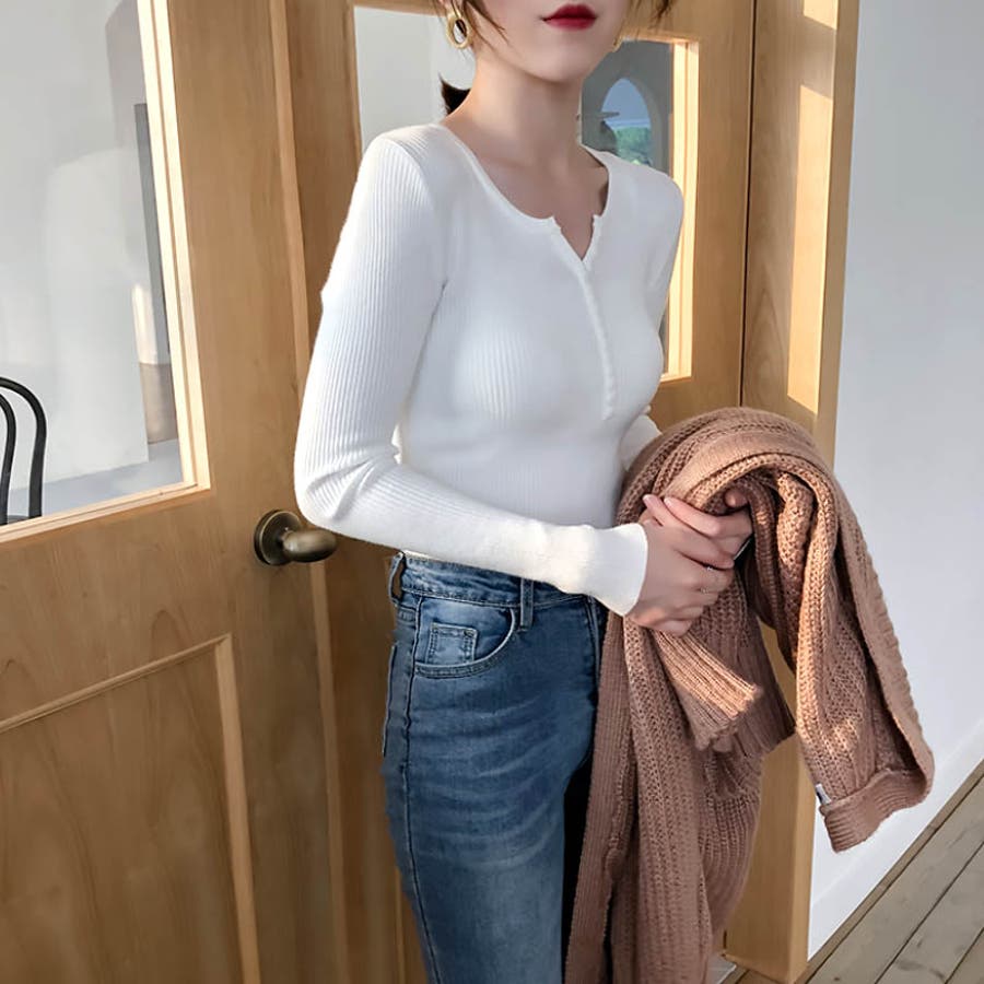 デイリー使いに最適なVネック仕様のリブ編みニットトップス