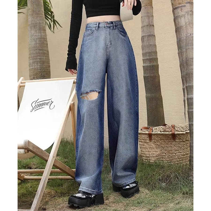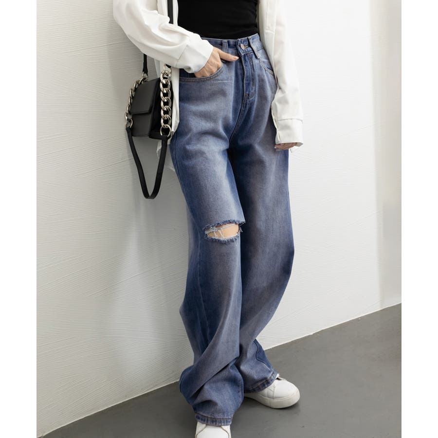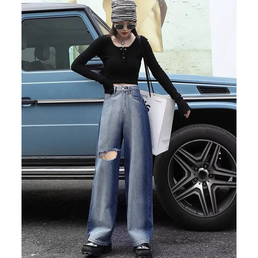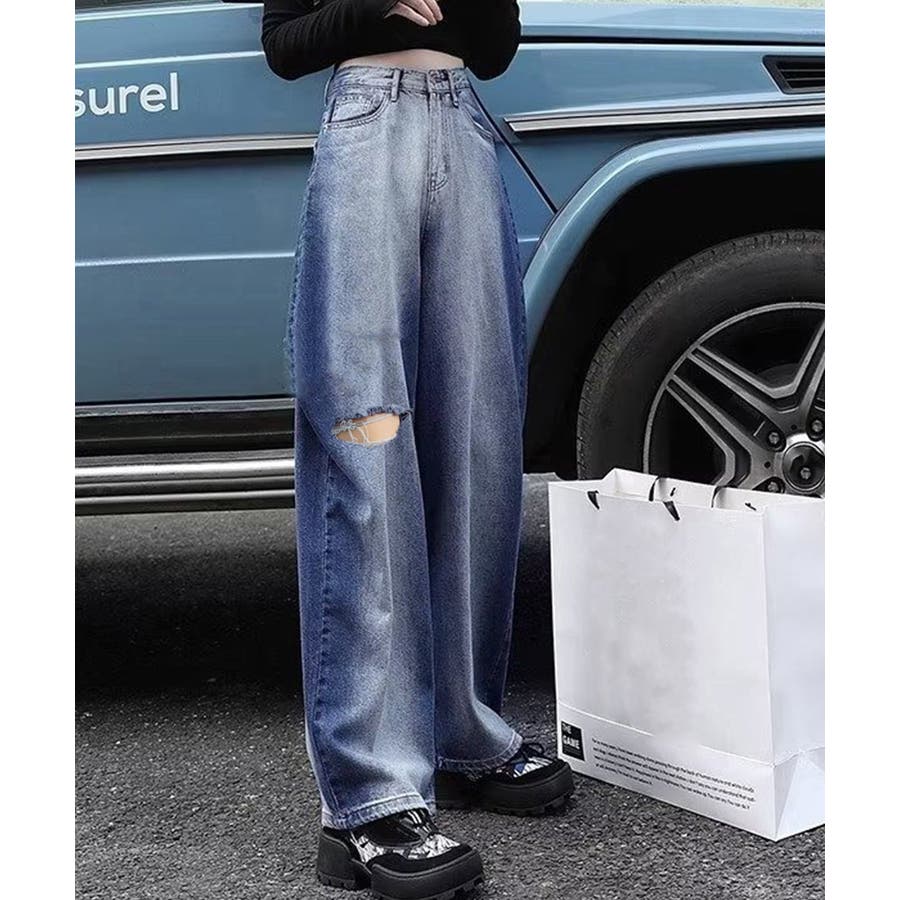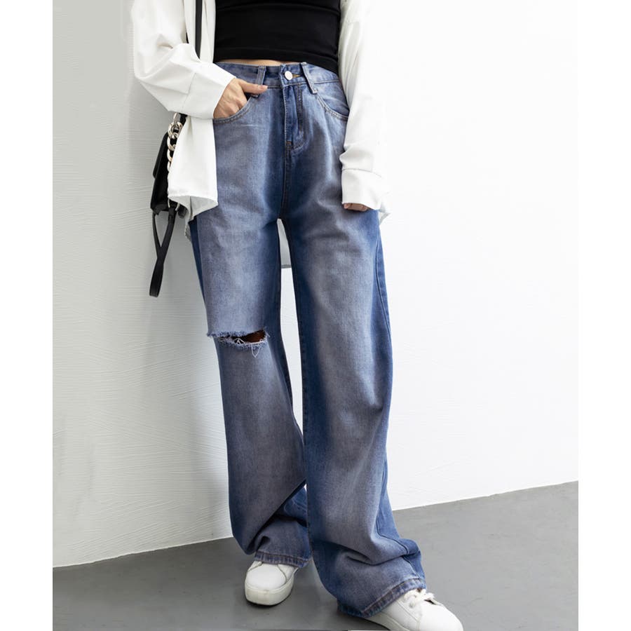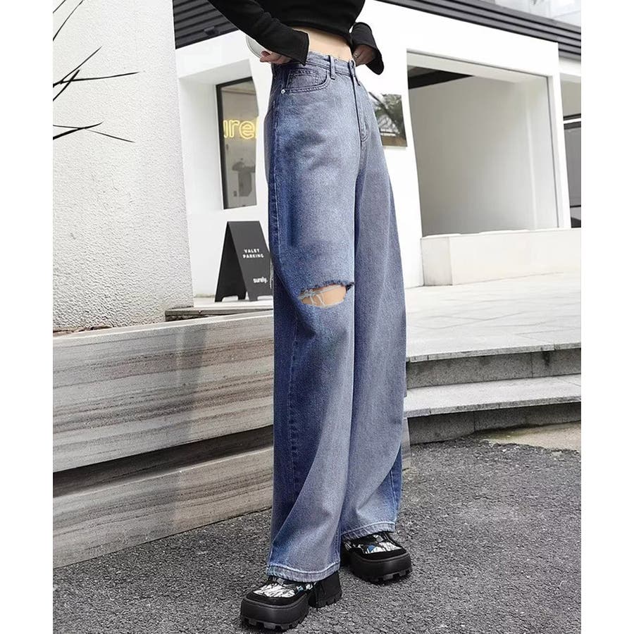 デニムワイドパンツ サイドダメージ韓国風