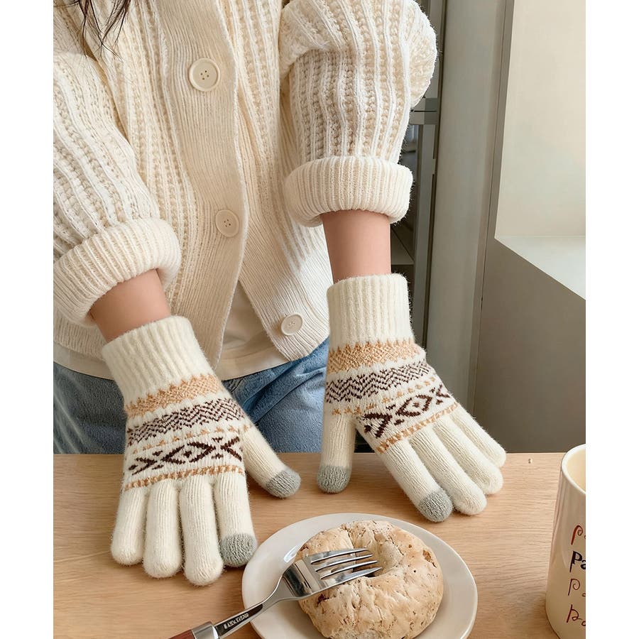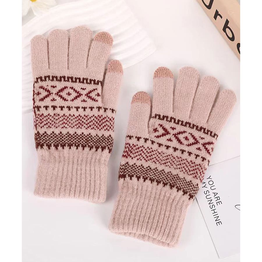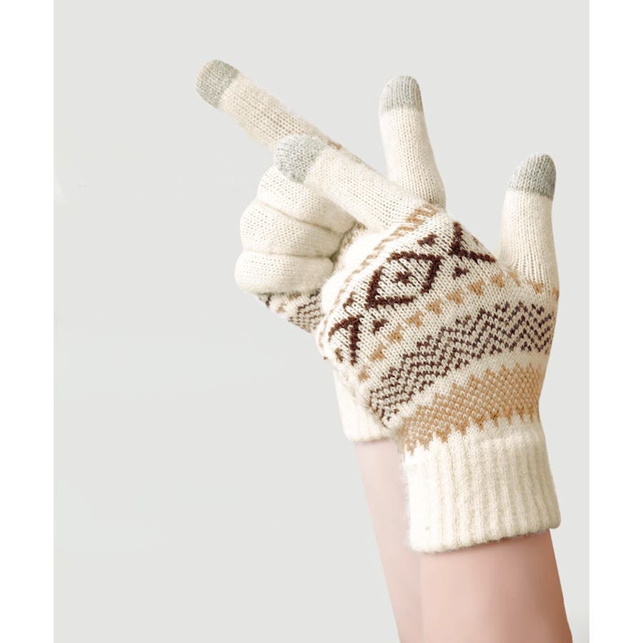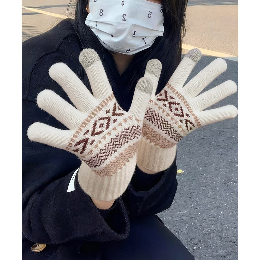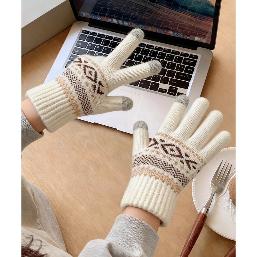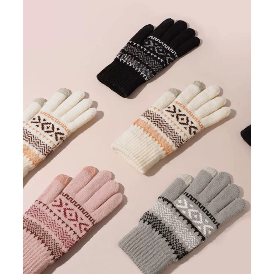 裏微起毛 暖かい手袋 レディース 北欧風 5本指ニットグローブ タッチパネル対応 ニット手袋 あったか 幾何学模様手袋冬