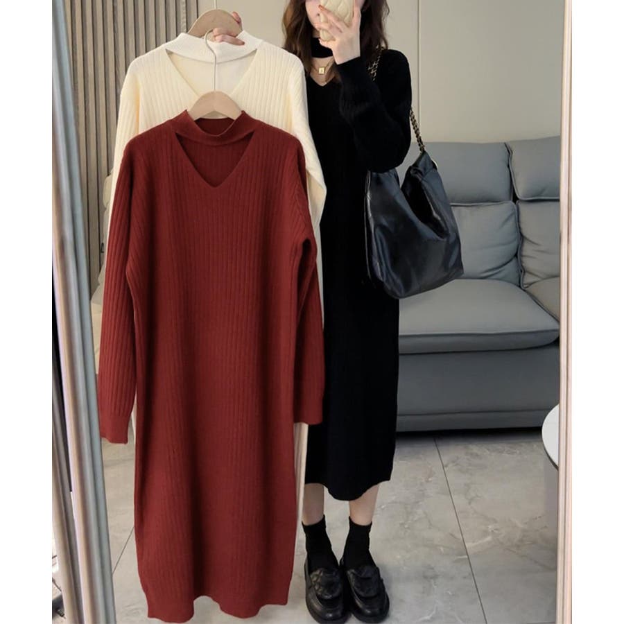 韓国 レディース きれいめカジュアル 秋冬チョーカー風ワンピース 無地ホルターネックワンピース 長袖 ゆったり体型カバー