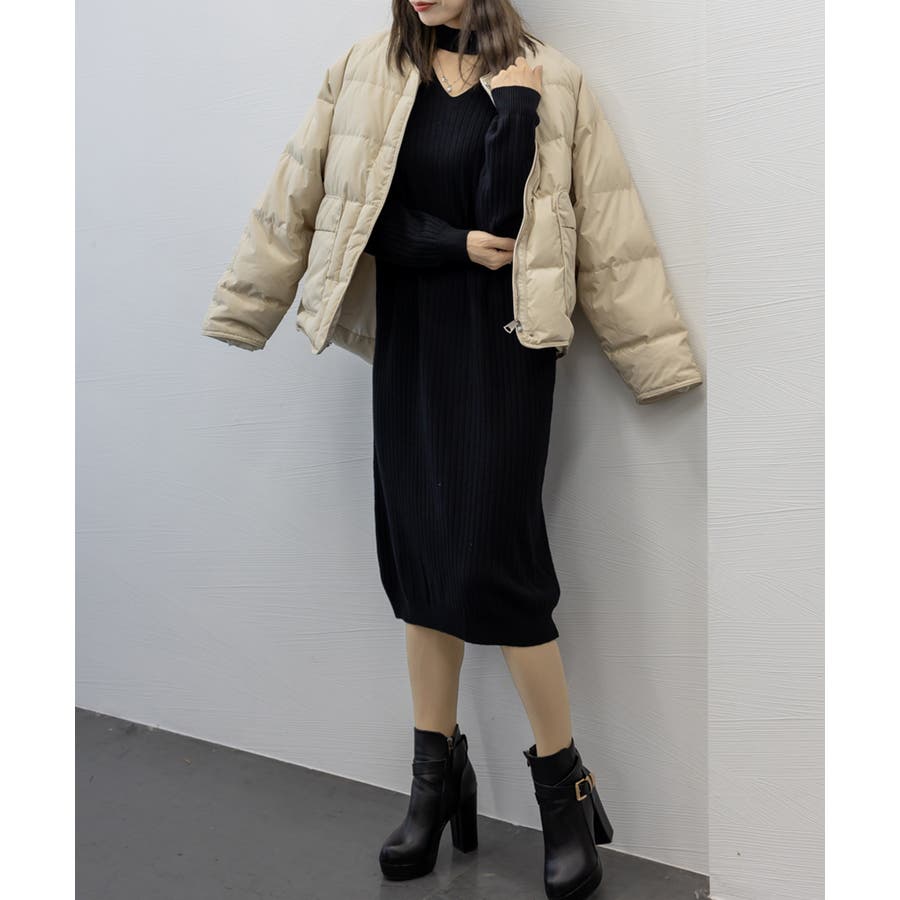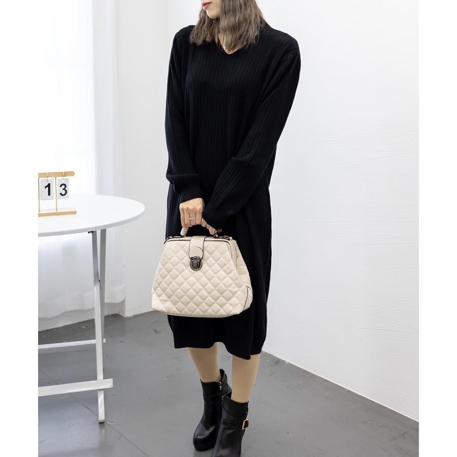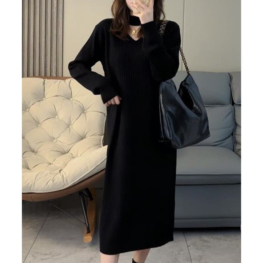 【ブラック】リブニットワンピース ロング丈 vネック