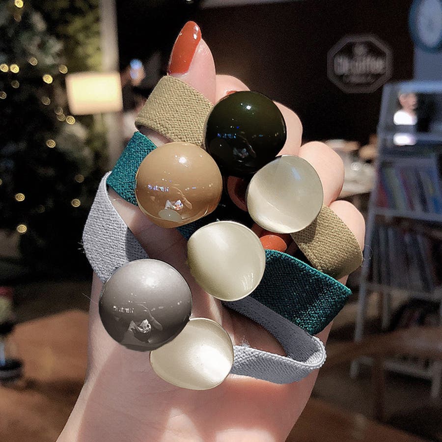 落ち着いたくすみカラーのカラーボールとメタルプレートを組み合わせたヘアゴム5点セット