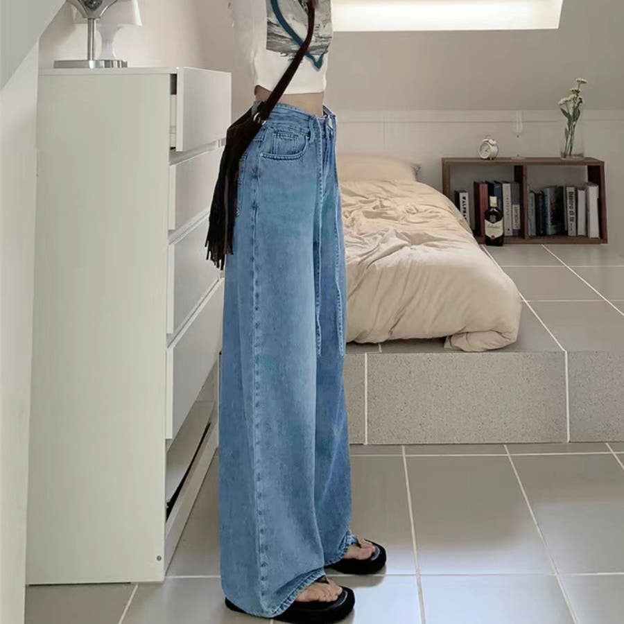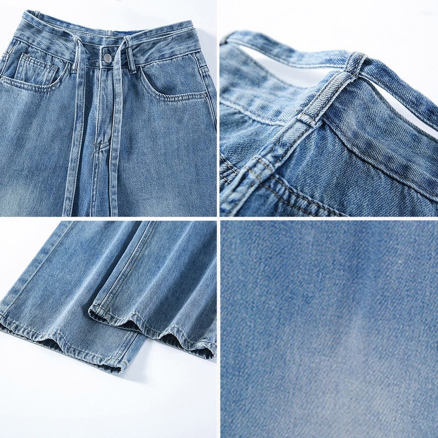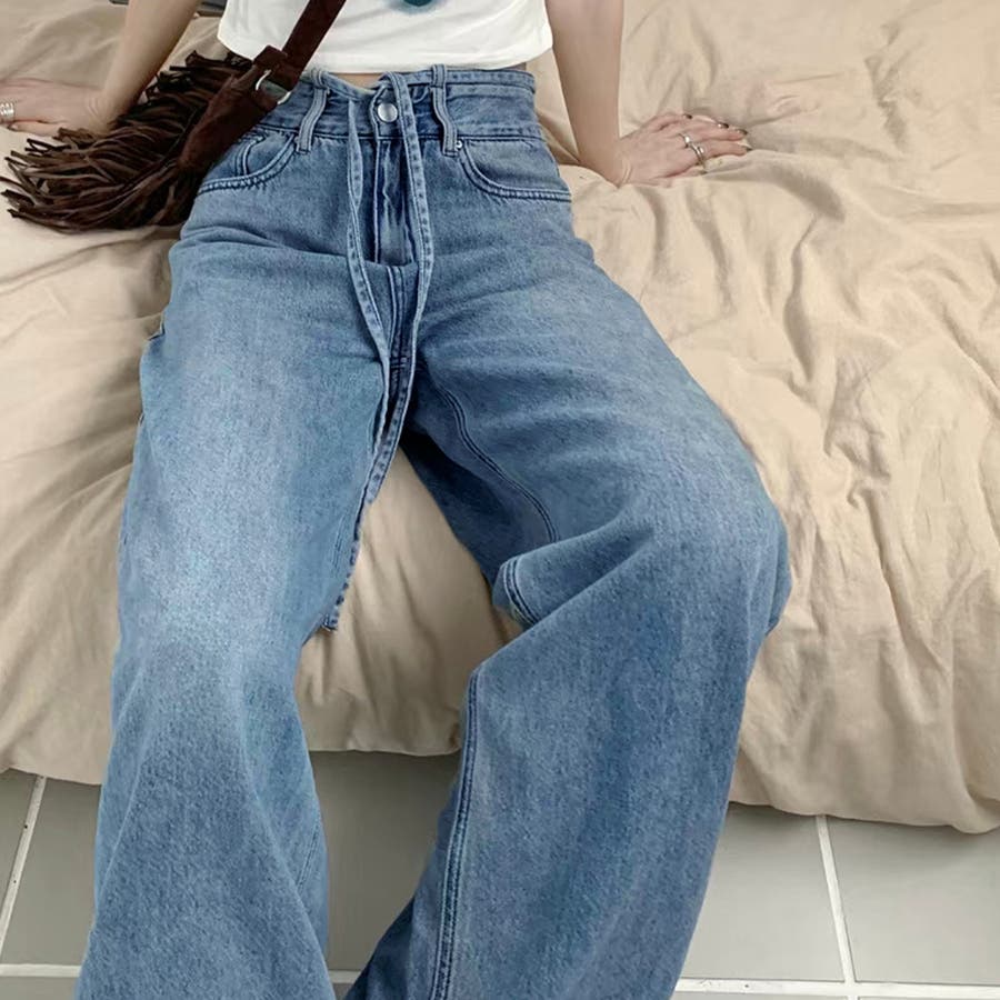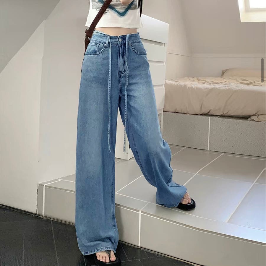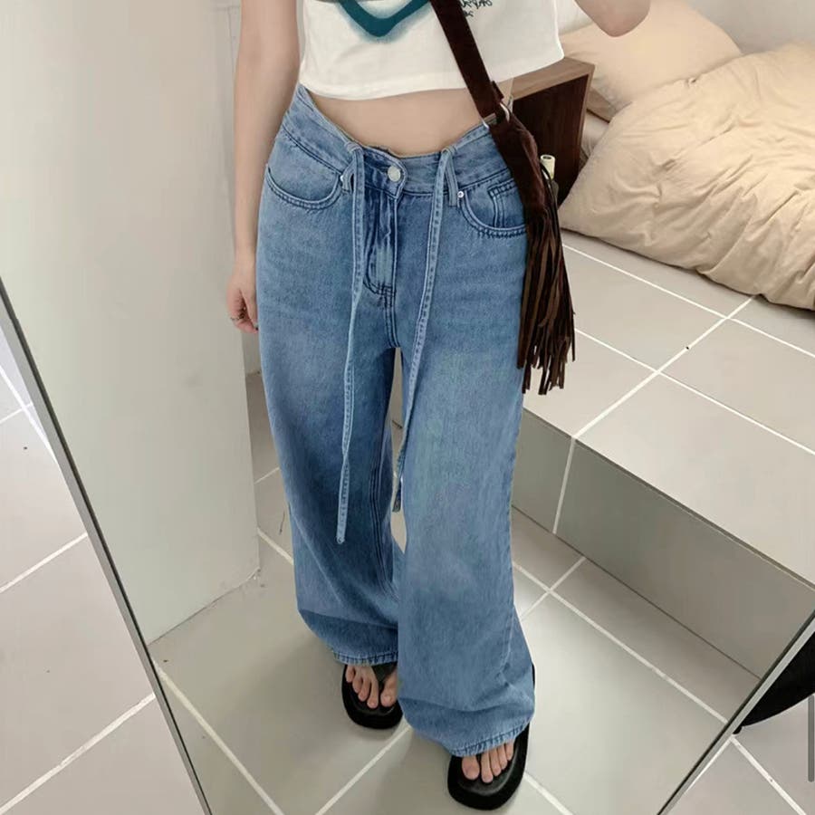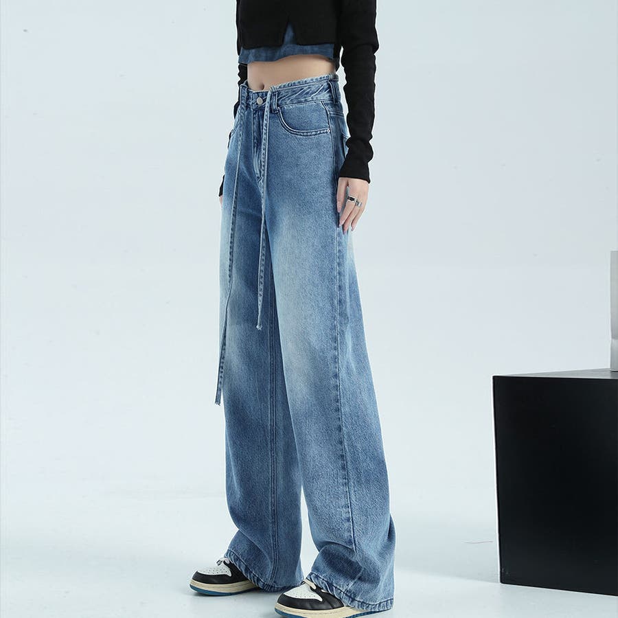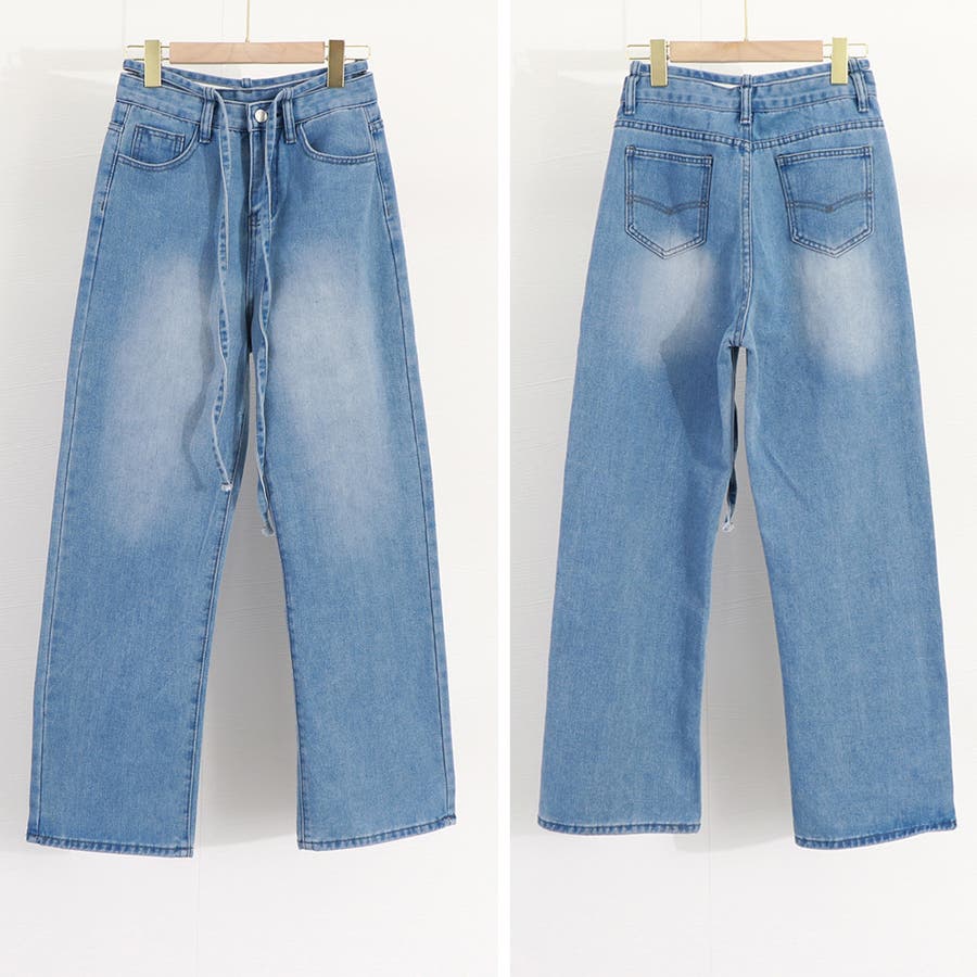 ストリングデニム ワイドパンツ トレロ ゆったり ハイウエストパンツウエストクロス 美脚カジュアル ストレートジーンズ