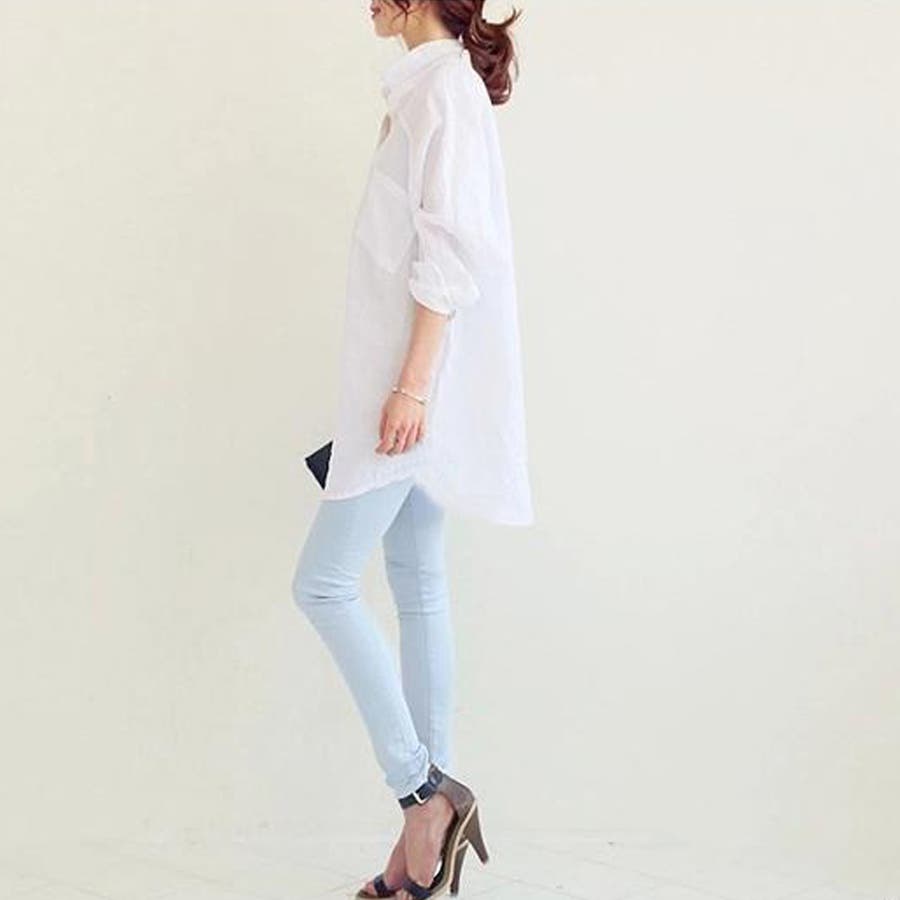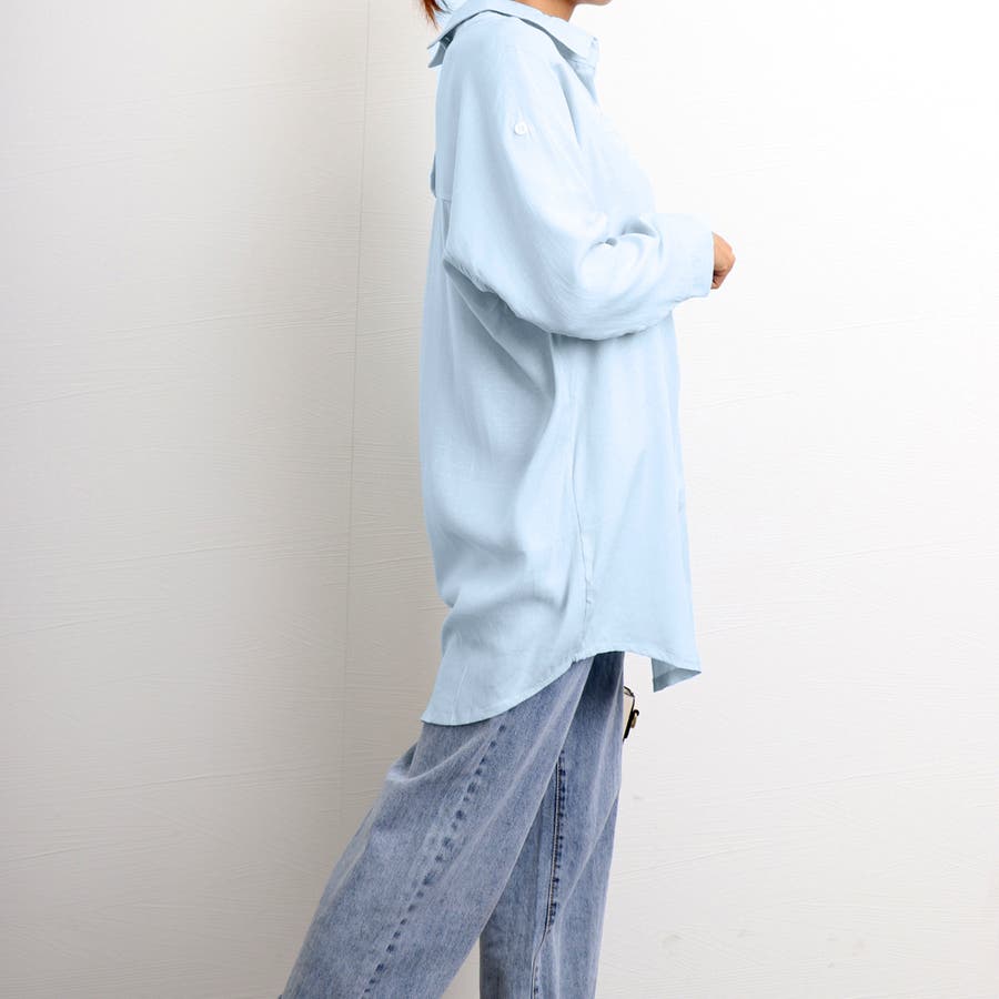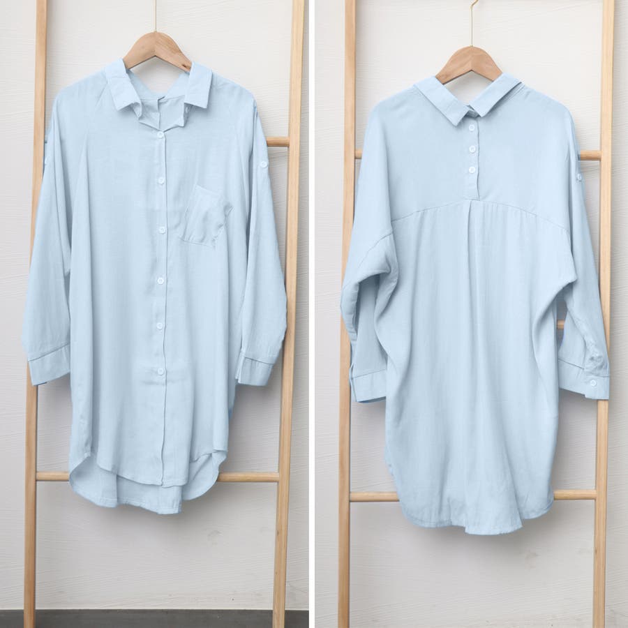袖ボタン留めてロールアップ可能のロングシャツブラウス