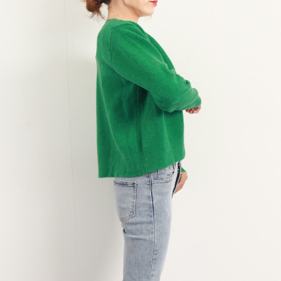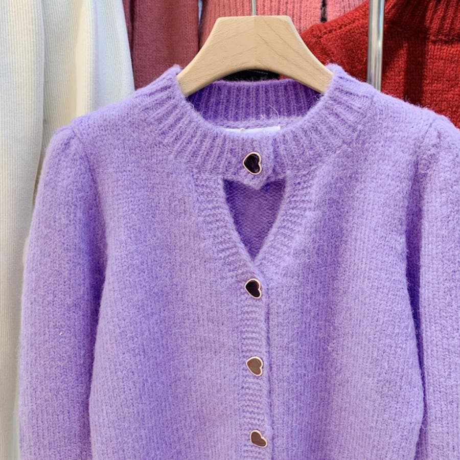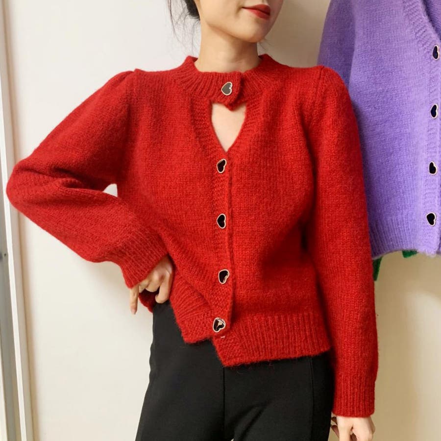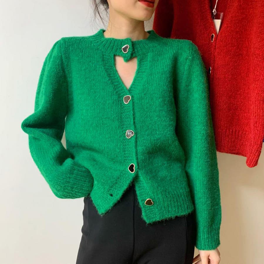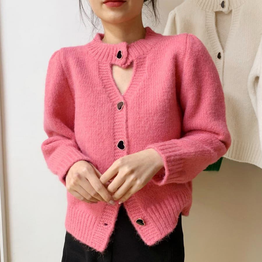ハート型ボタンがアクセントのVネックニットカーディガンです