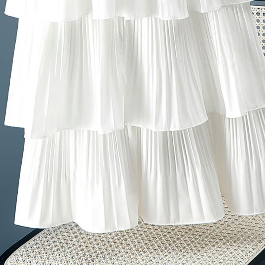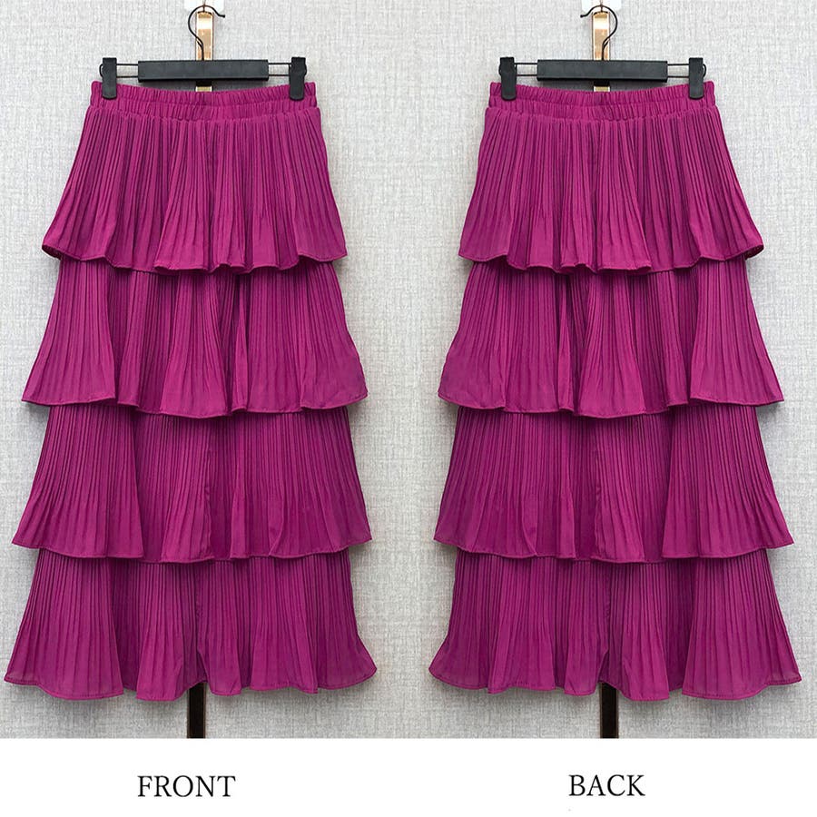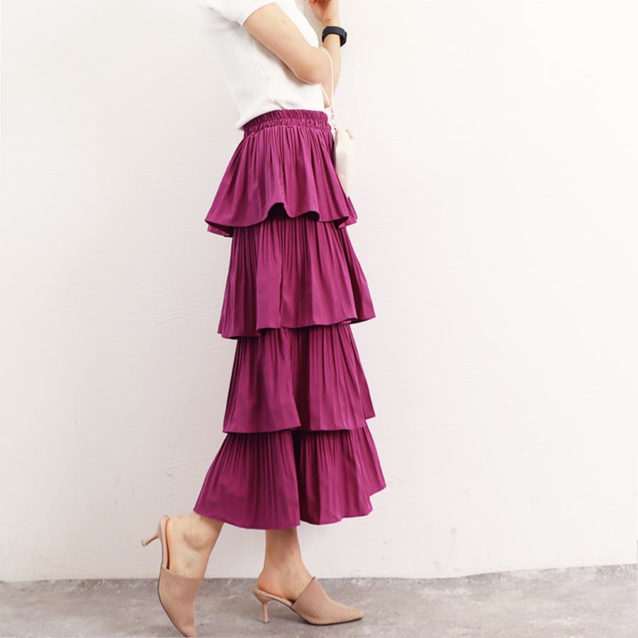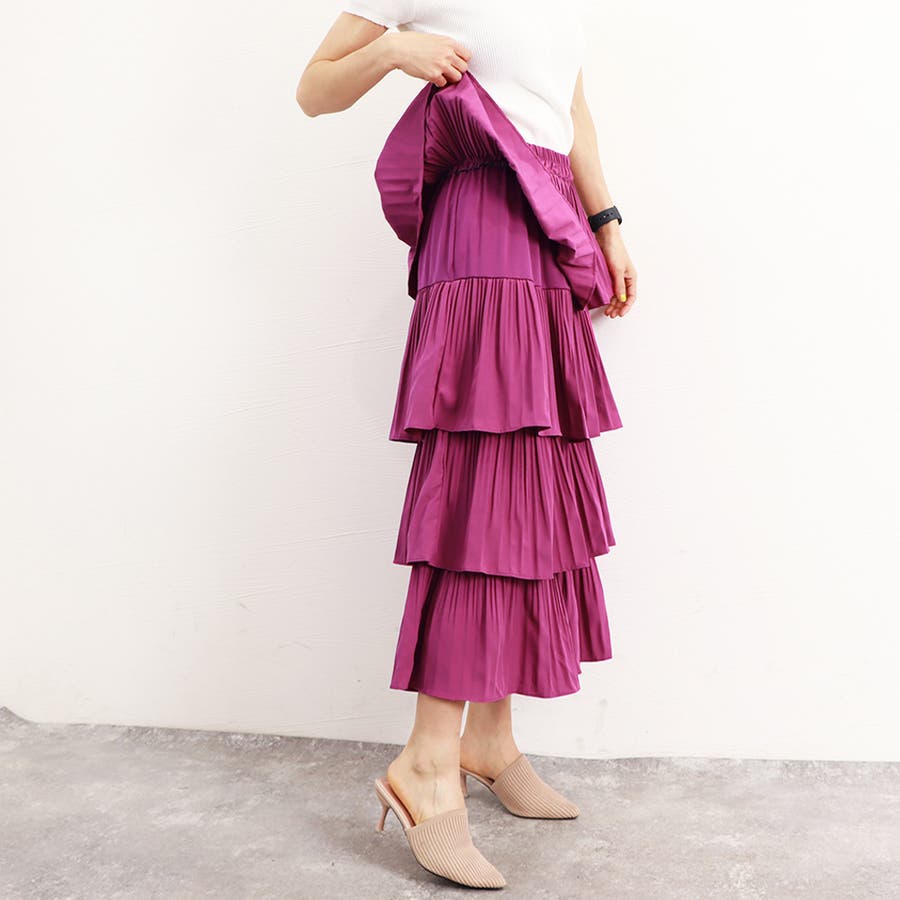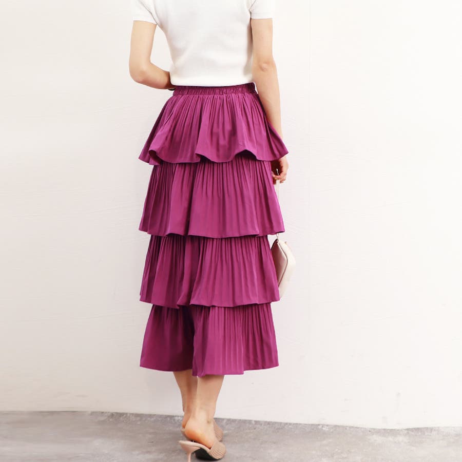 4段切り替えのティアードデザインにプリーツを組み合わせた存在感のある華やかなスカート