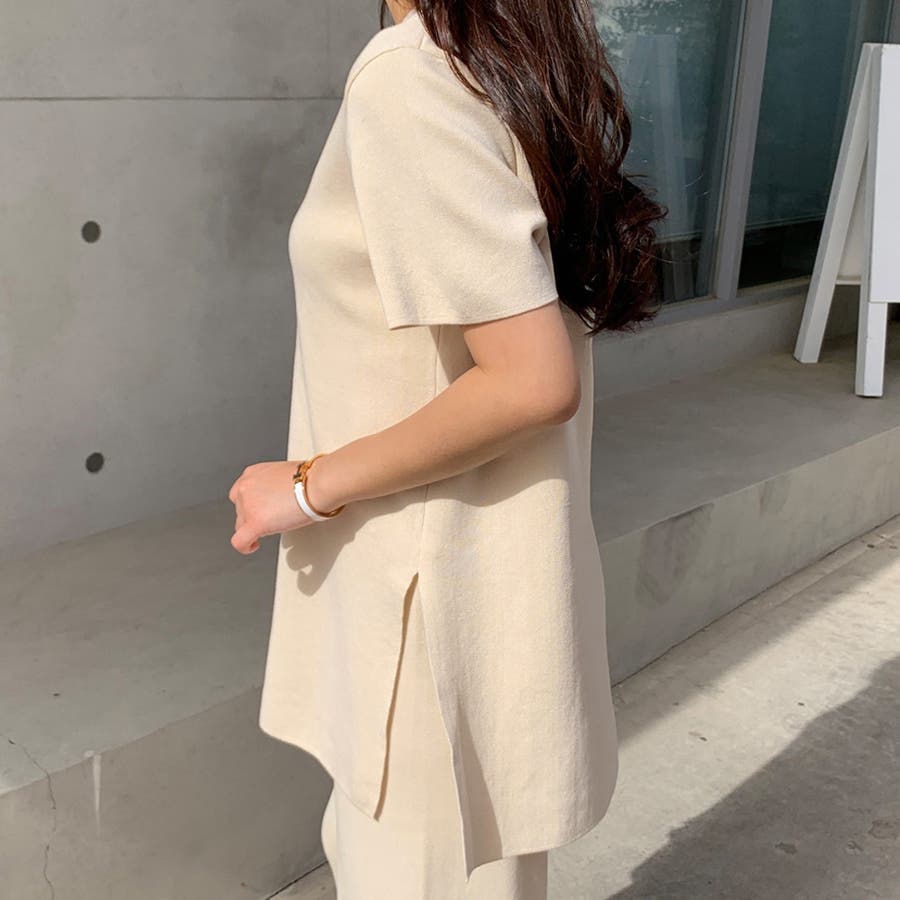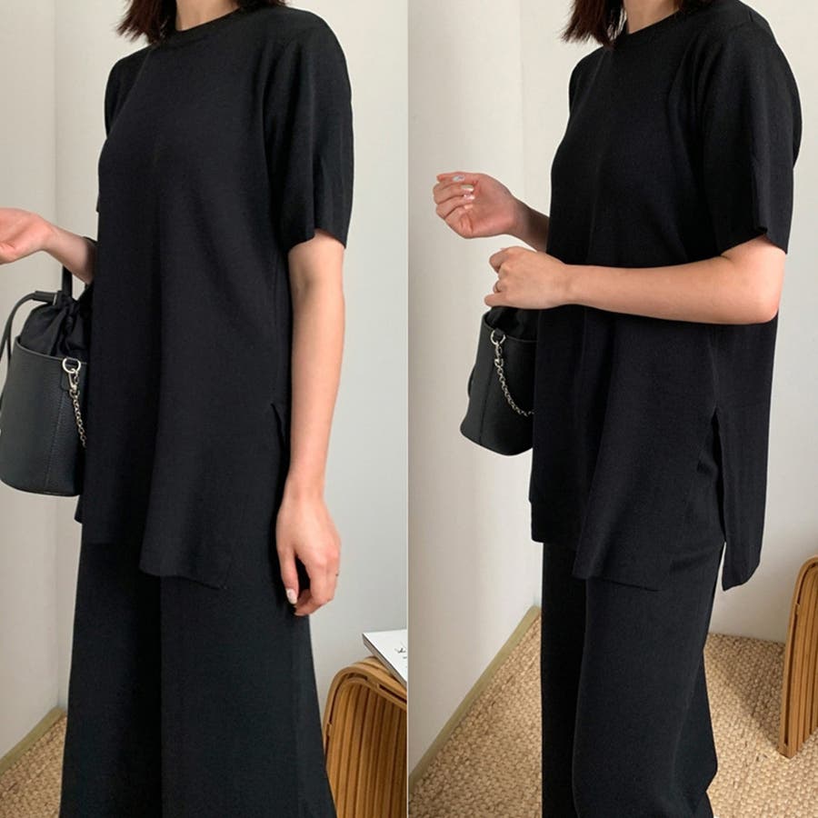 トップスはスタンダードな襟元のクルーネック,裾はスリット入りでレイヤードにも最適