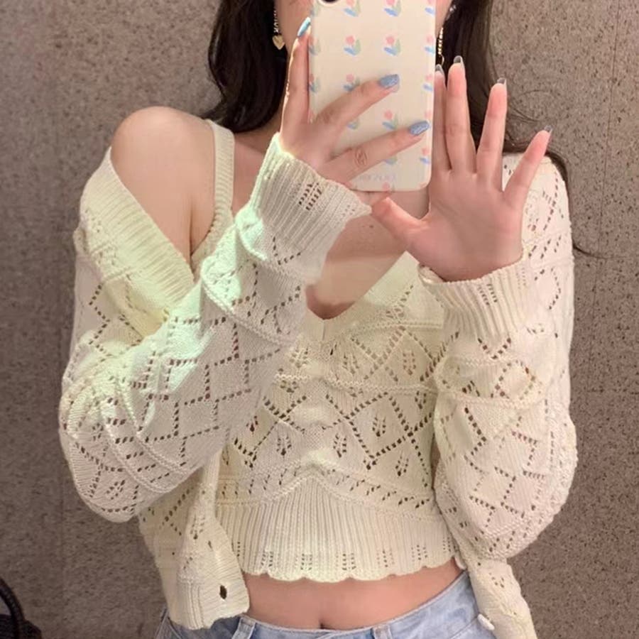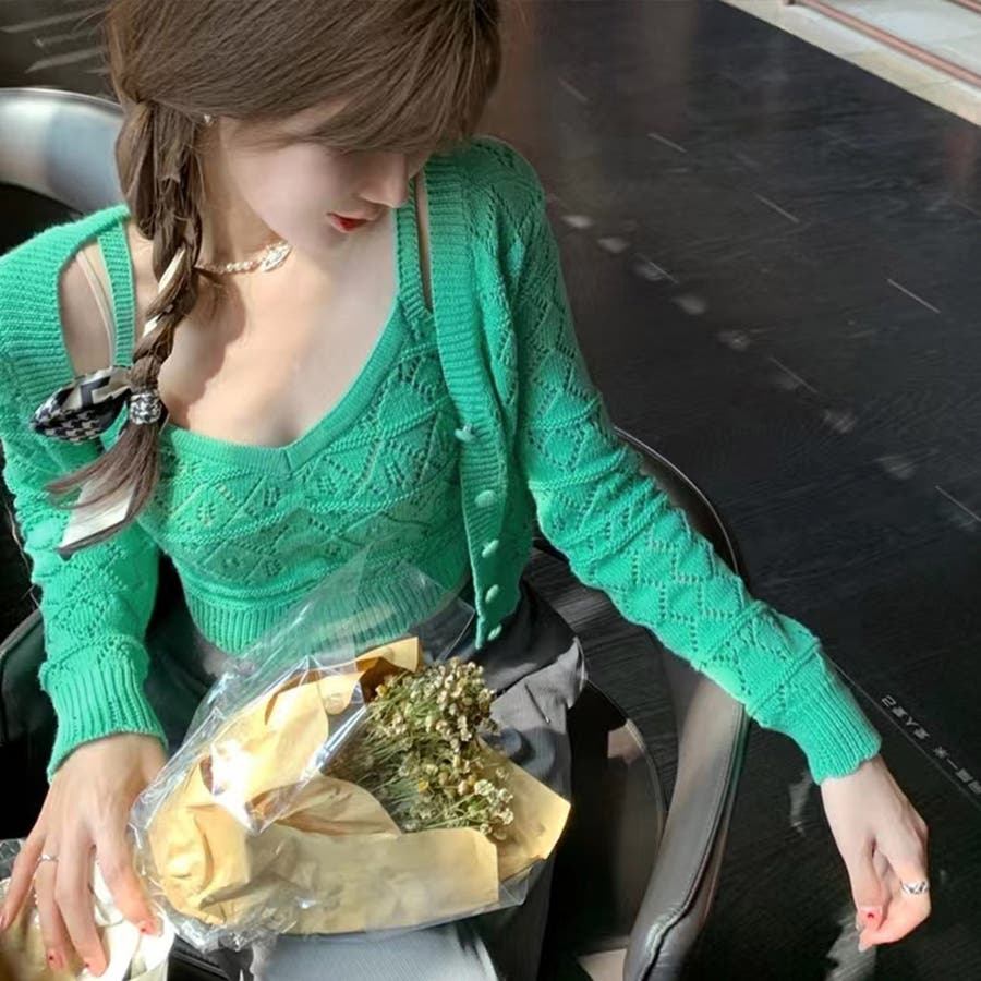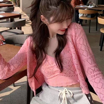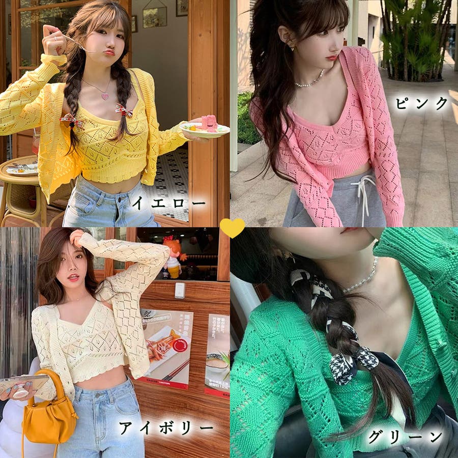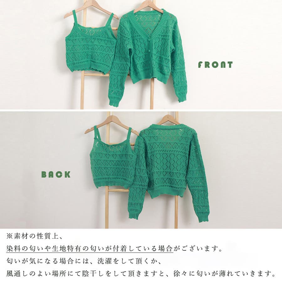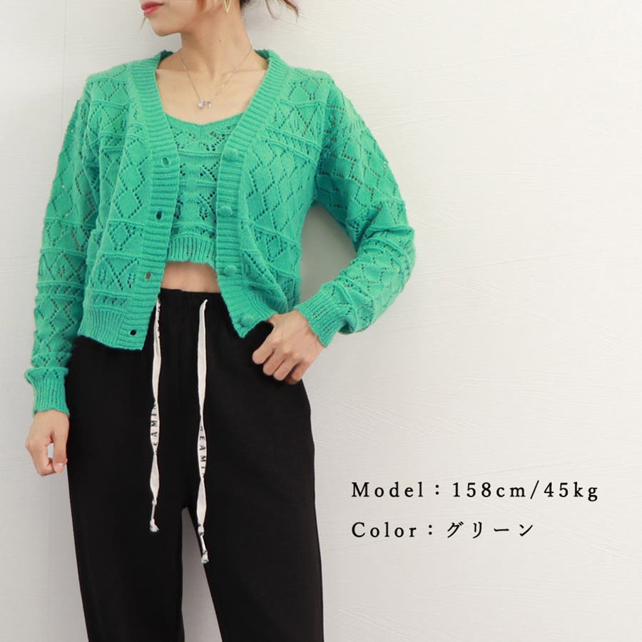 コンパクトなシルエットで着やせするカーディガン&キャミソールの2点セットアイテム