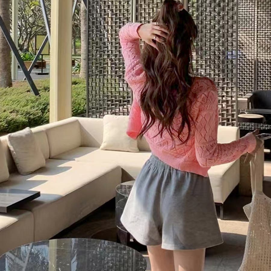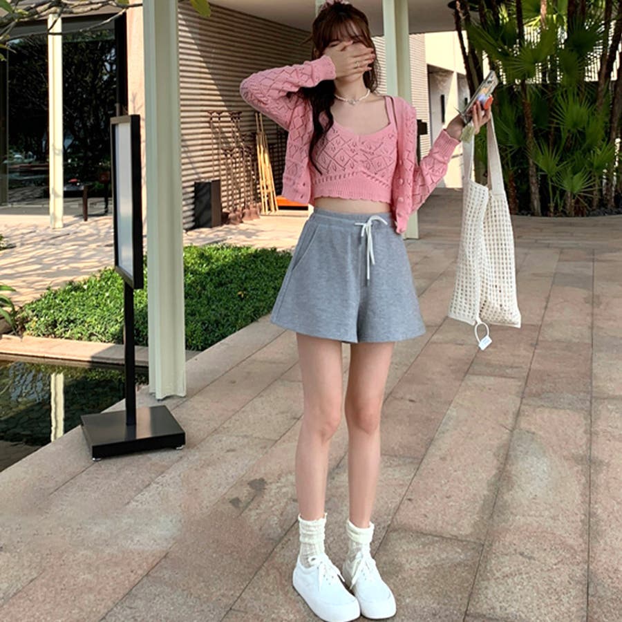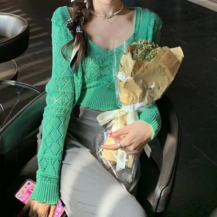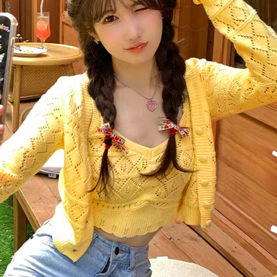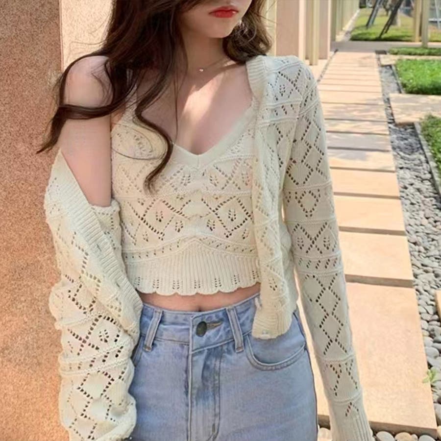 コンパクトなシルエットで着やせするカーディガン&キャミソールの2点セットアイテム