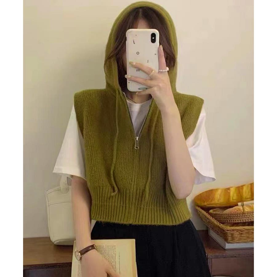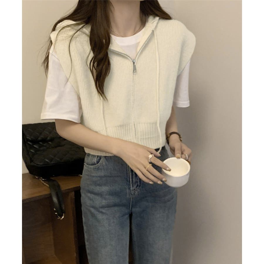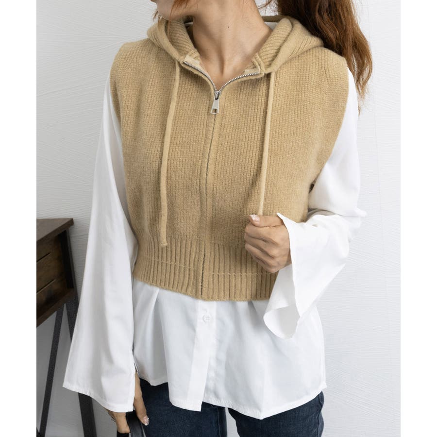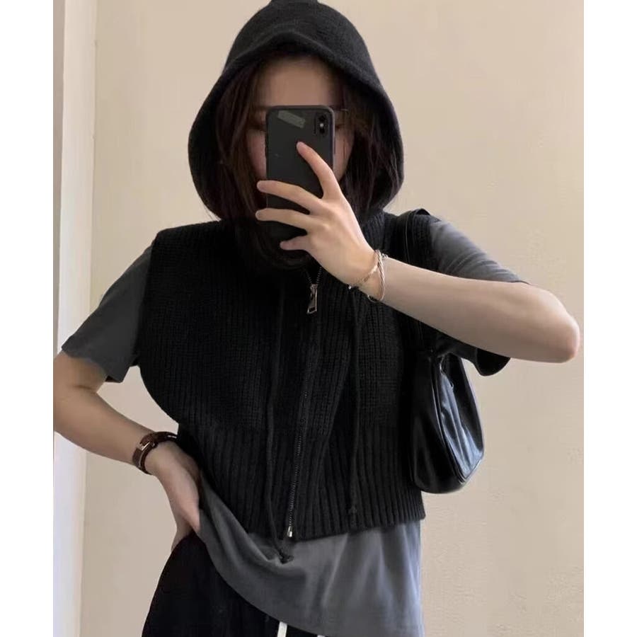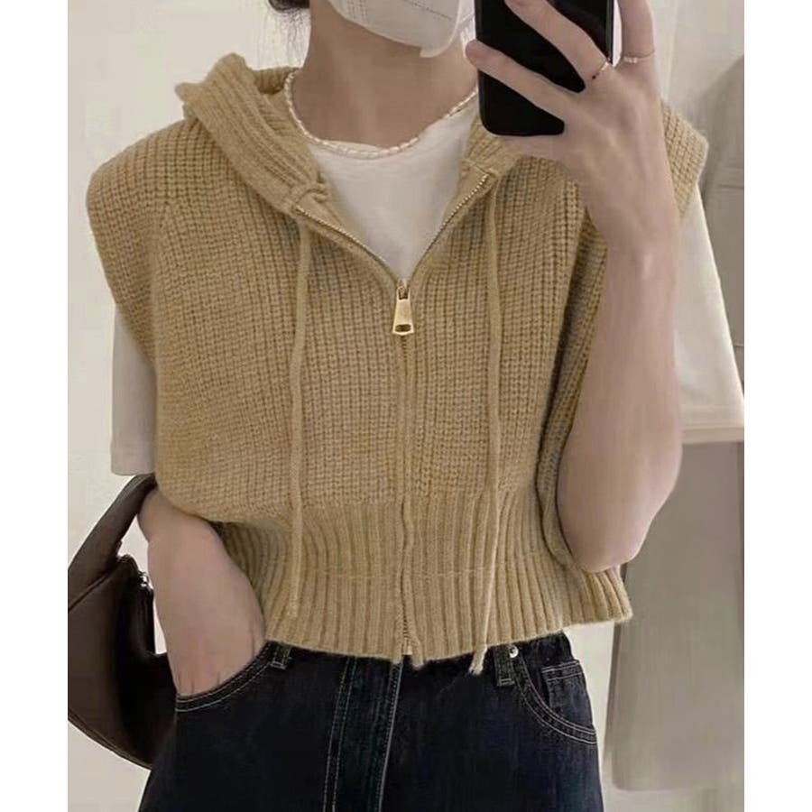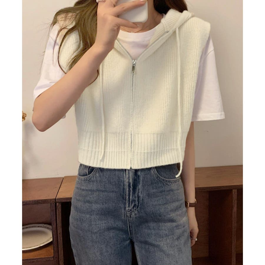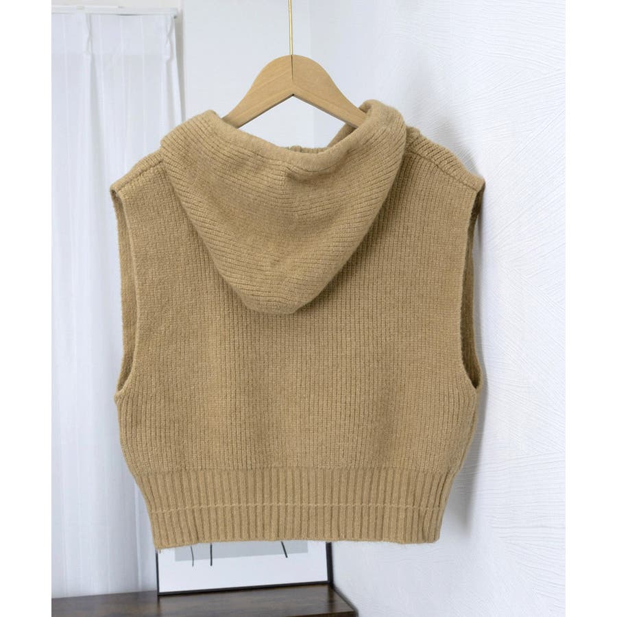 フード付きジップニットベスト ショート丈