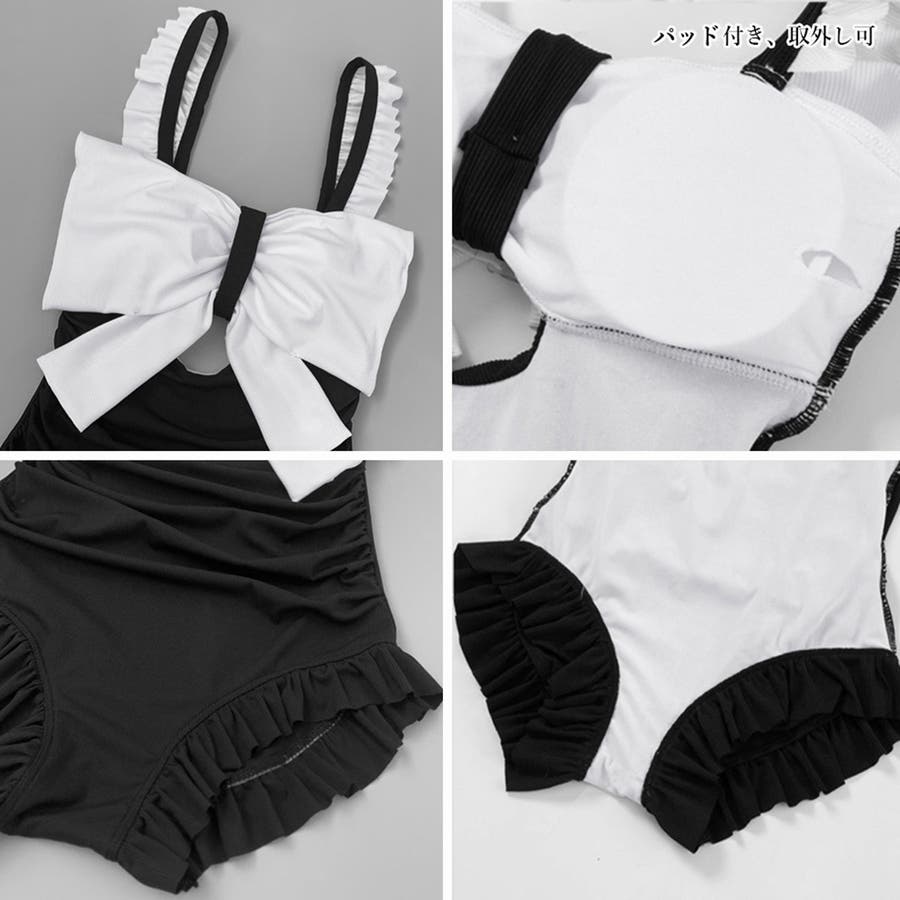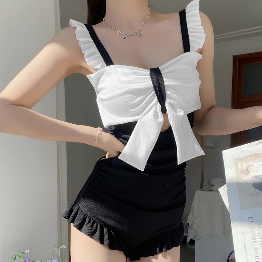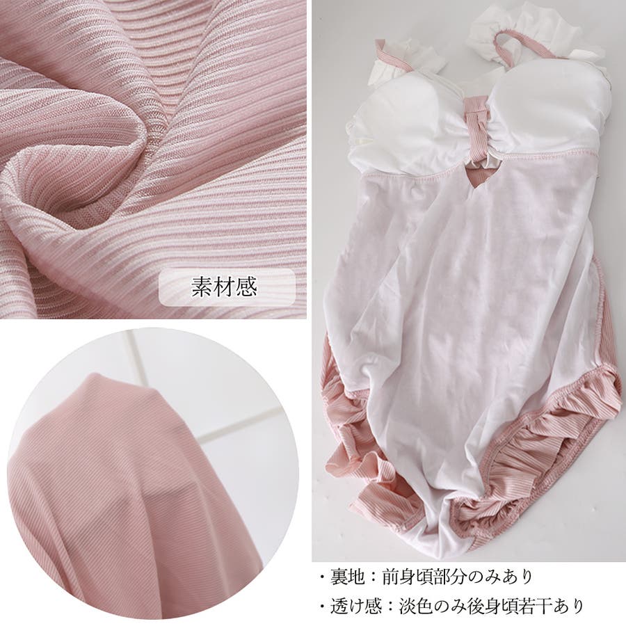 リブワンピ水着 夏 パッド付き水着美胸 ギャザー肩フリル