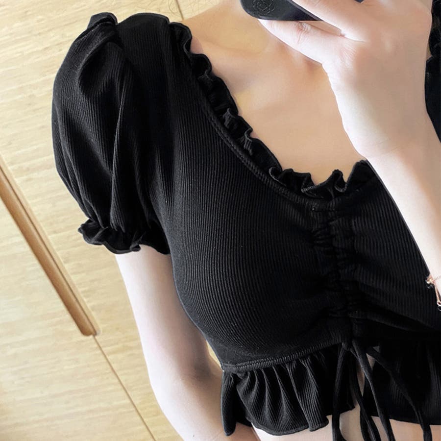 レースアップ×フリルがポイントになり、甘辛MIXスタイルを楽しめる