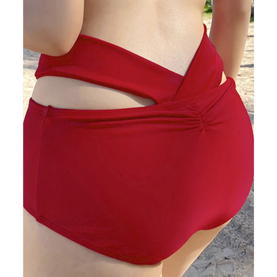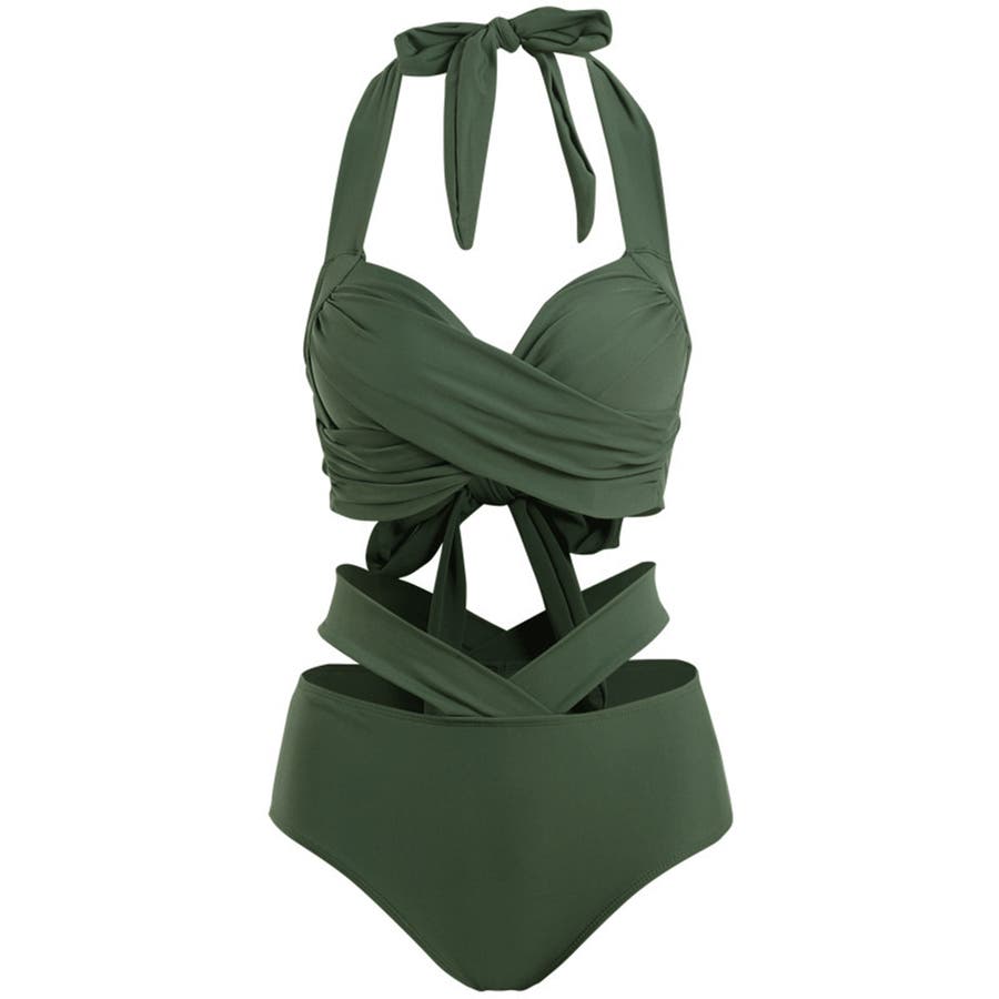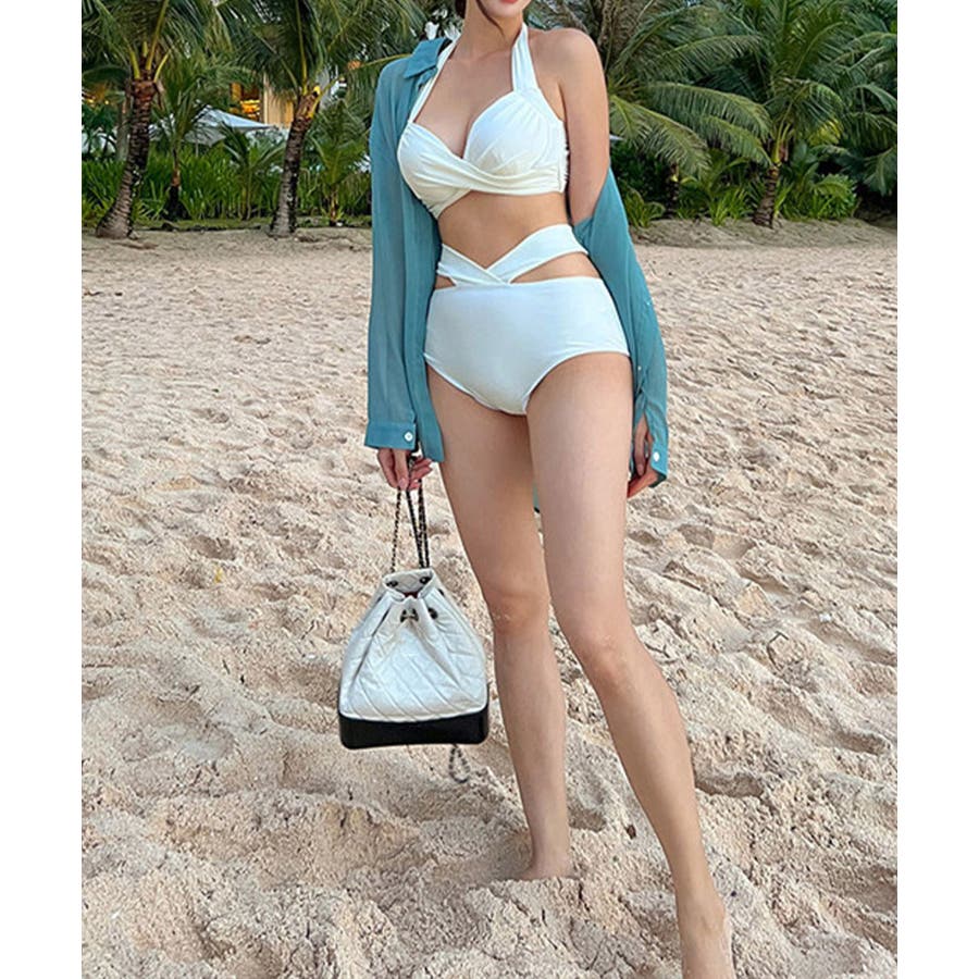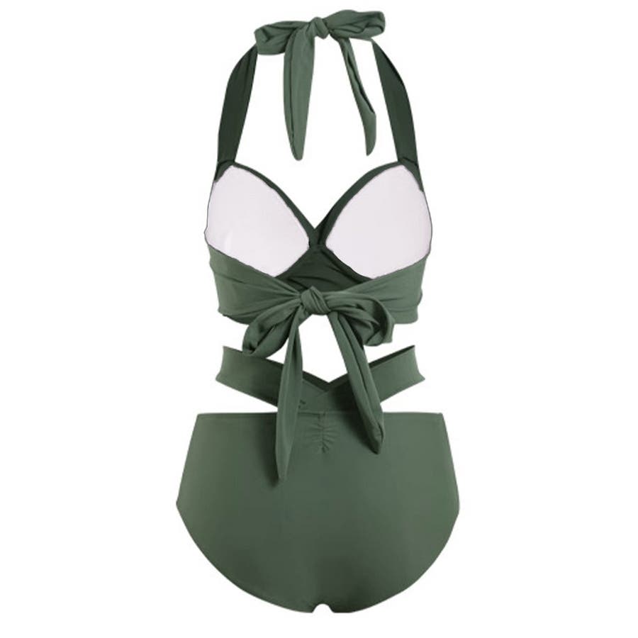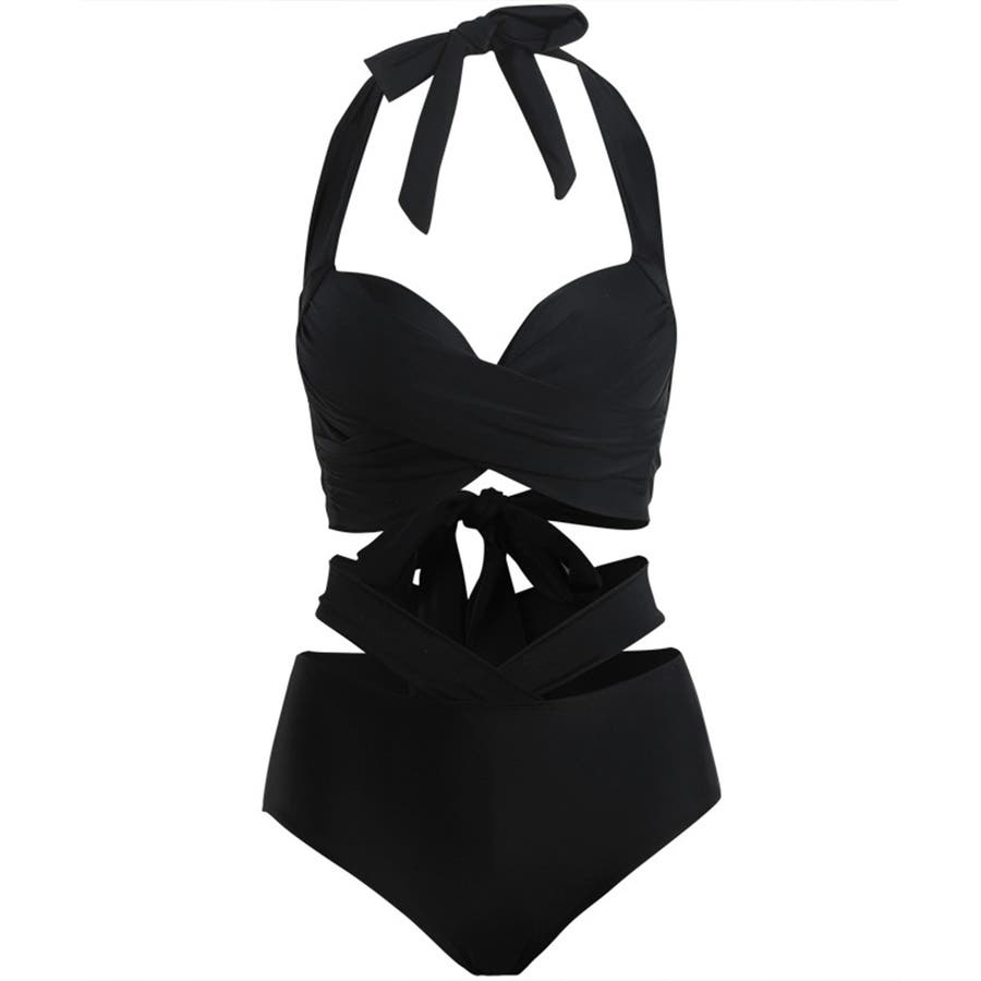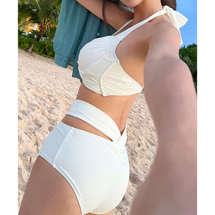 ホルターネックとアンダーのリボンが華やかさをプラスし、360度どこから見ても魅力的な上下2点セットの新作ビキニ水着
