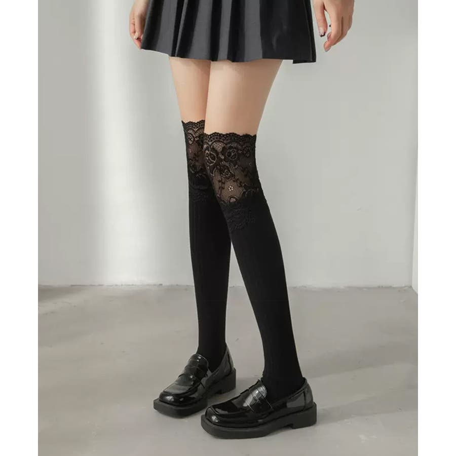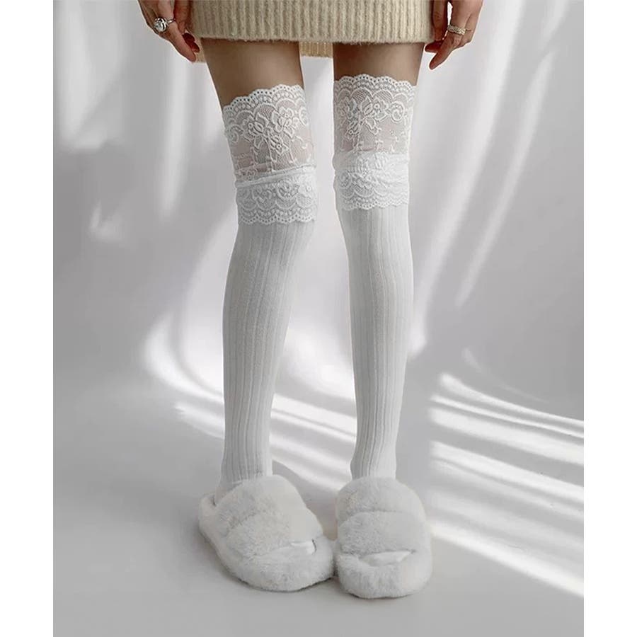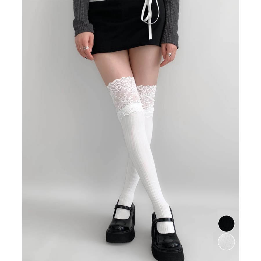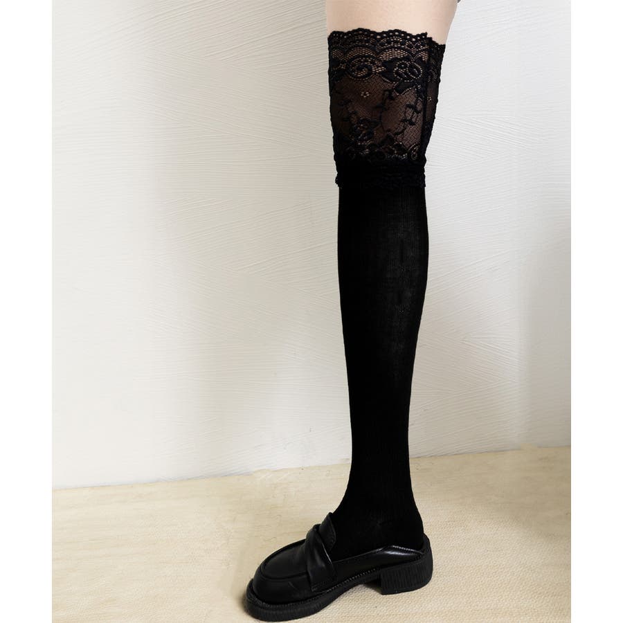 ニーハイソックス花柄レース切り替え靴下