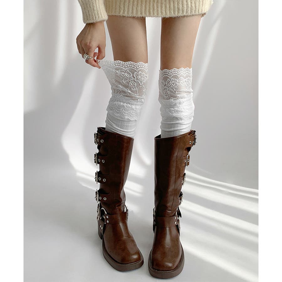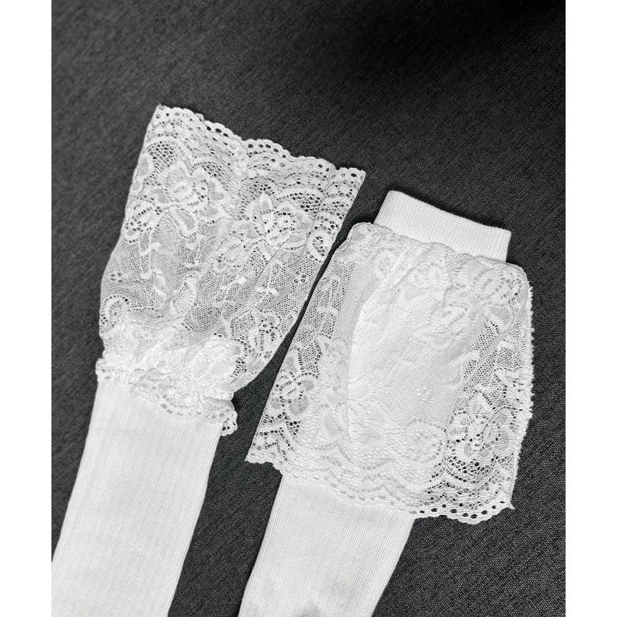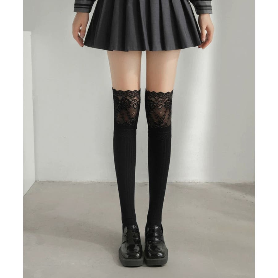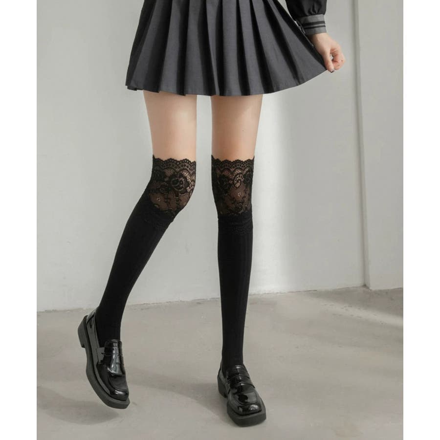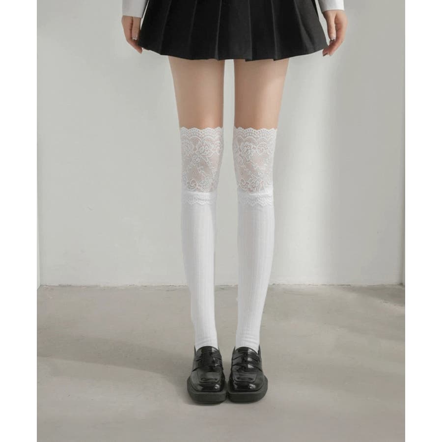 ニーハイソックス花柄レース切り替え靴下