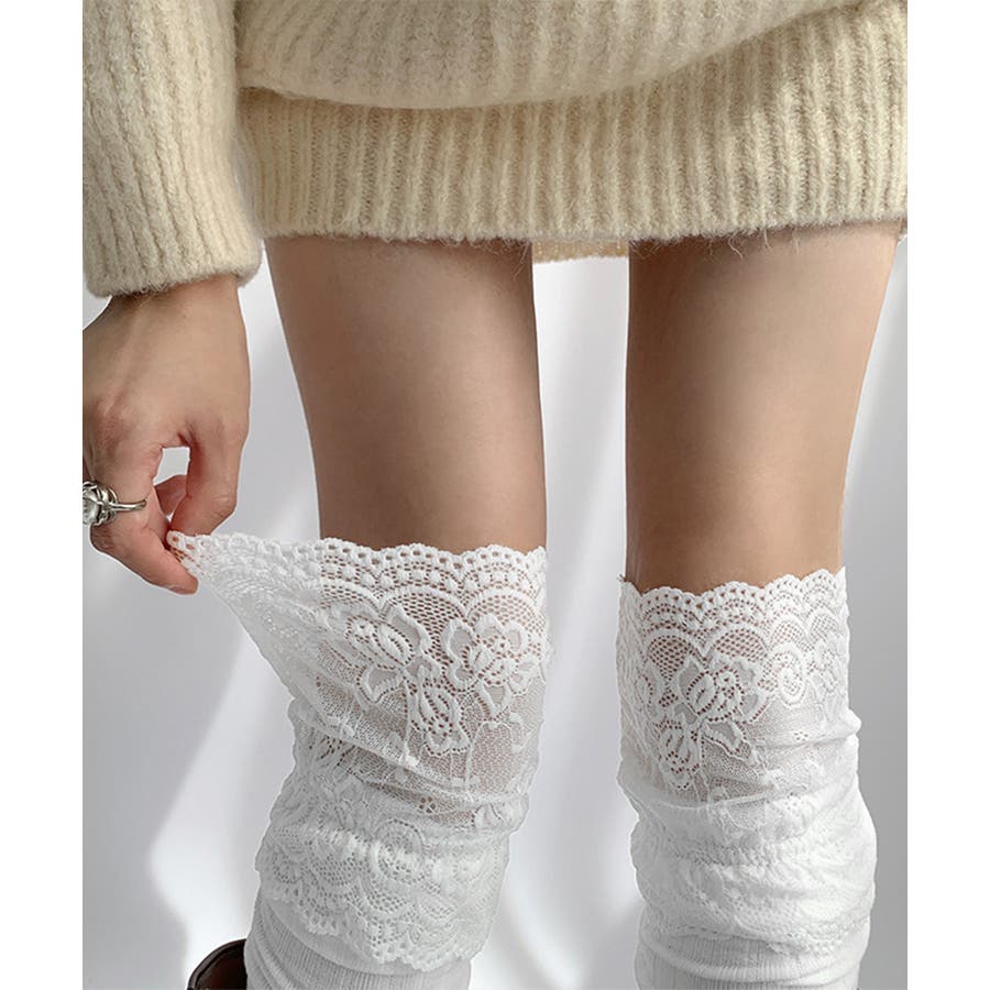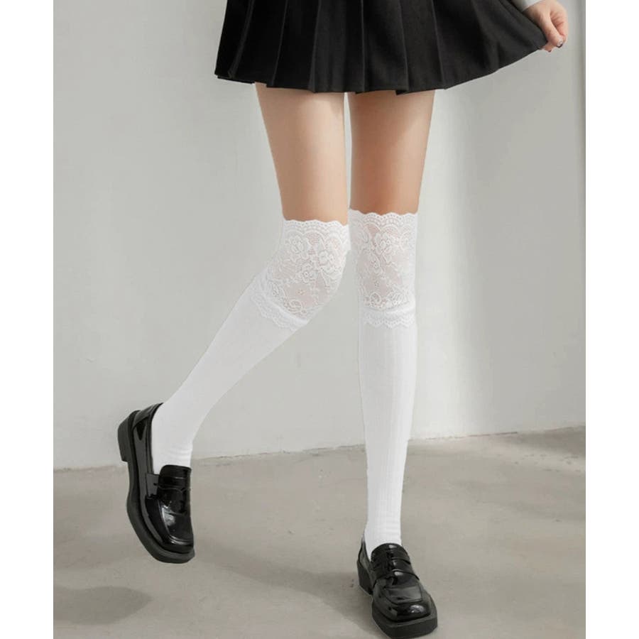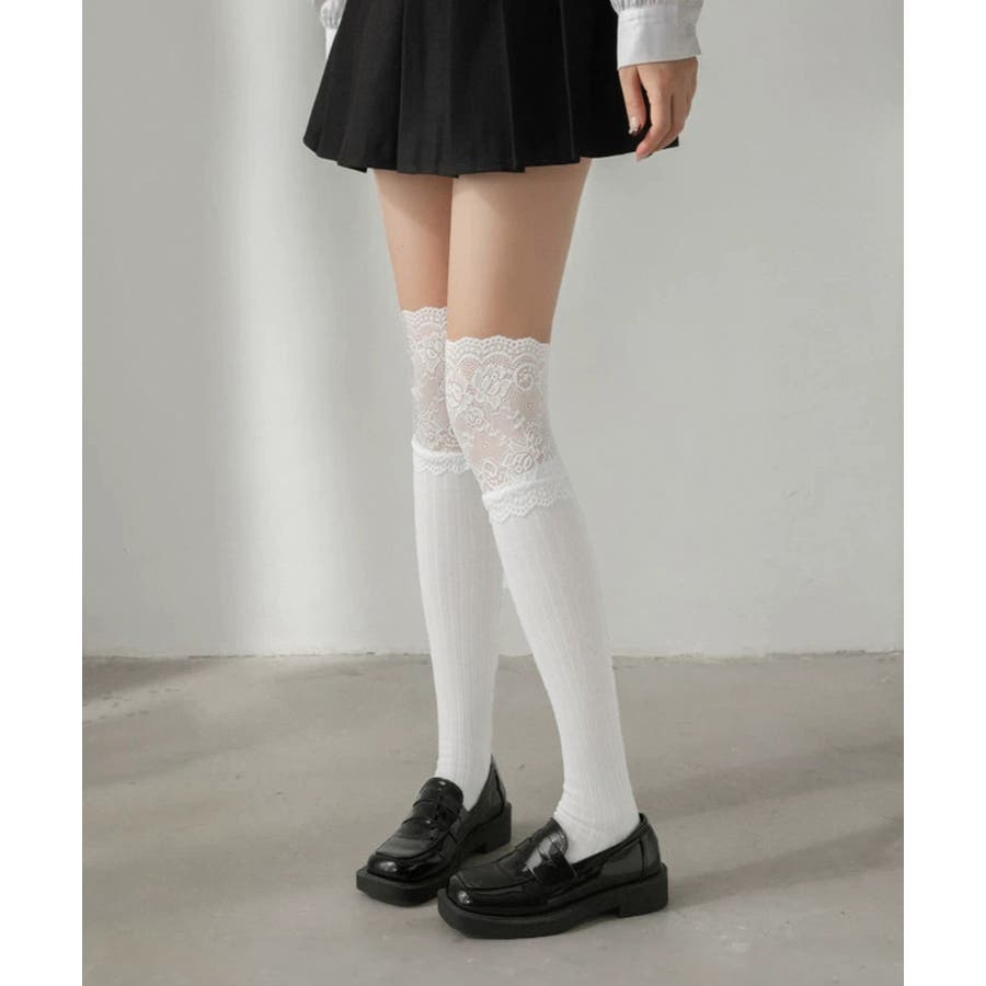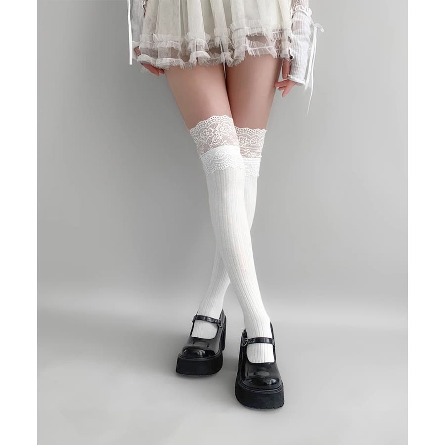 膝上の花柄レースがフェミニンさを引き立たせるニーハイソックス