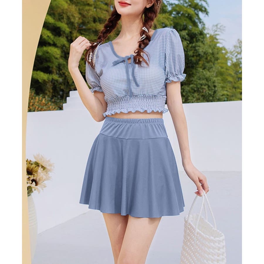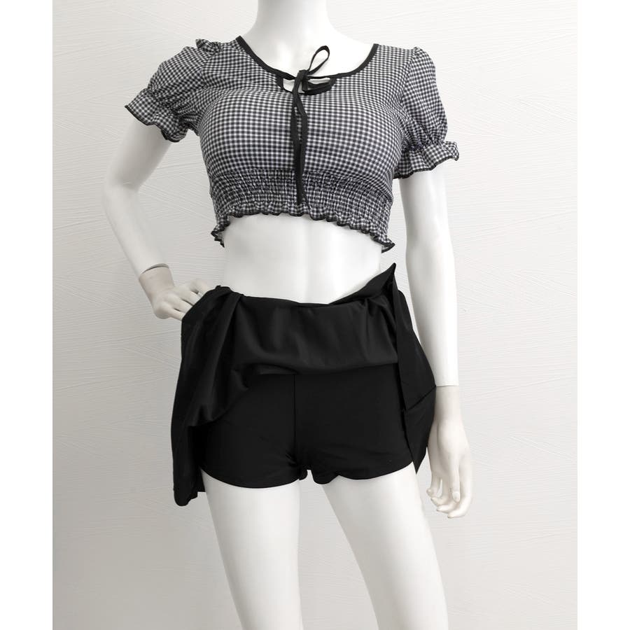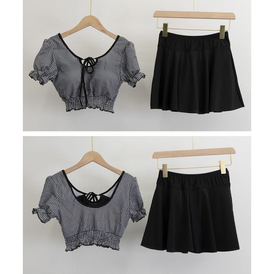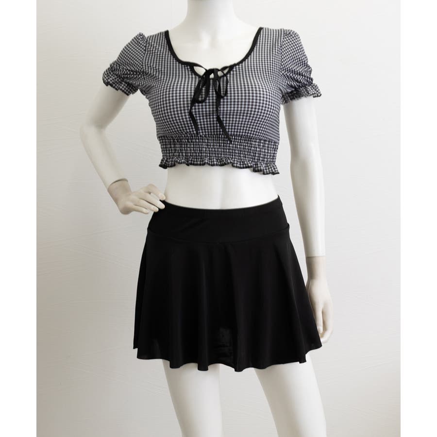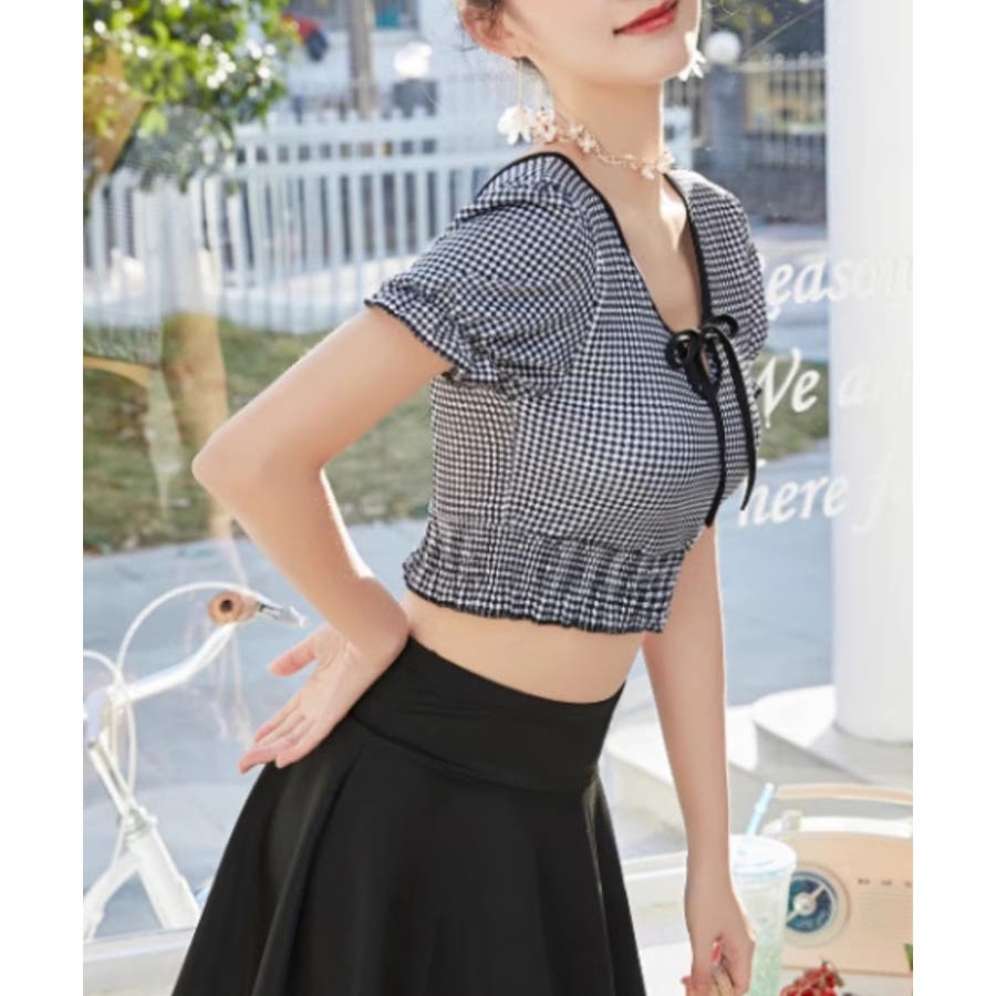 ガーリーで可愛らしいクロップド丈のチェック柄トップスとシンプルなフレアスカートの2点セットの水着