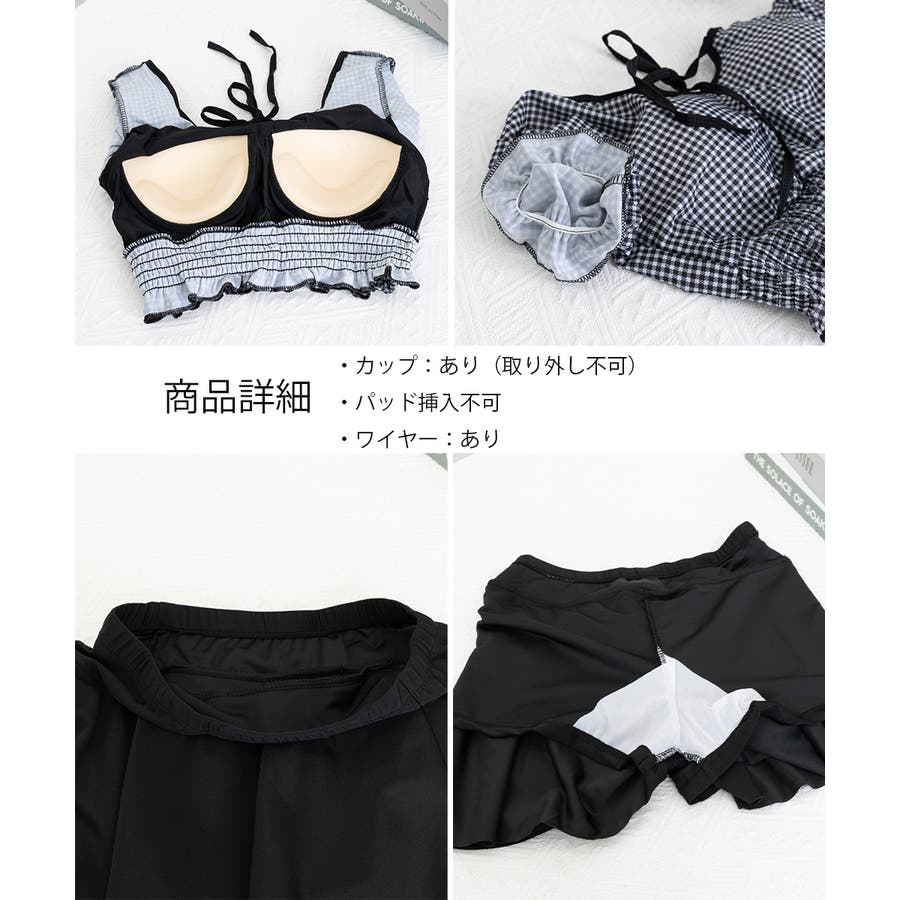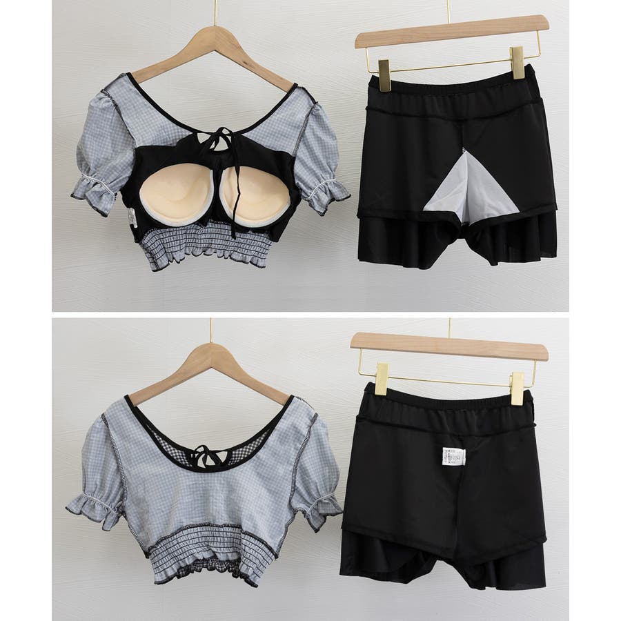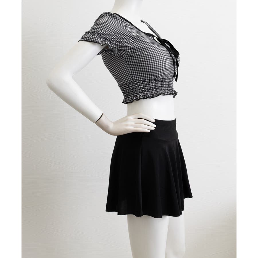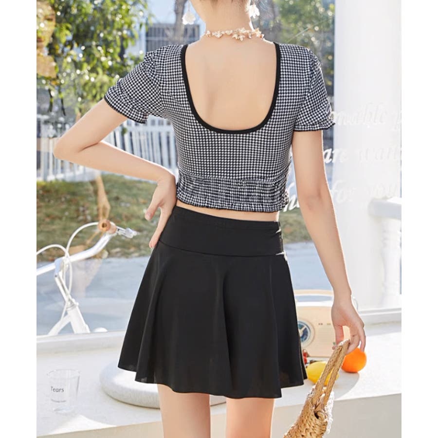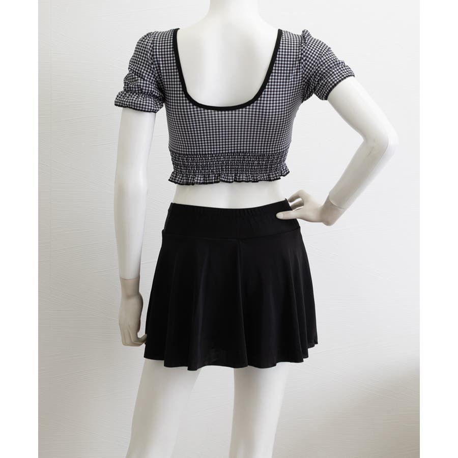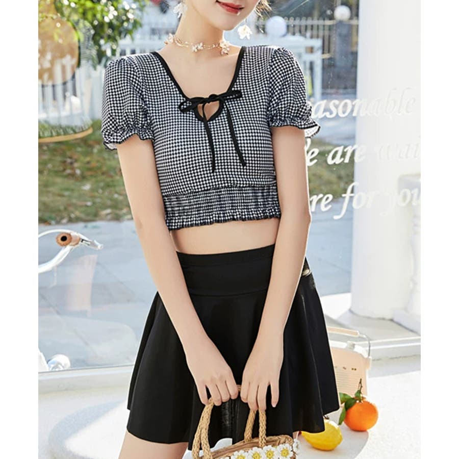 ガーリーで可愛らしいクロップド丈のチェック柄トップスとシンプルなフレアスカートの2点セットの水着