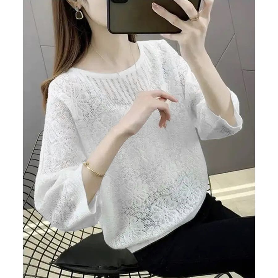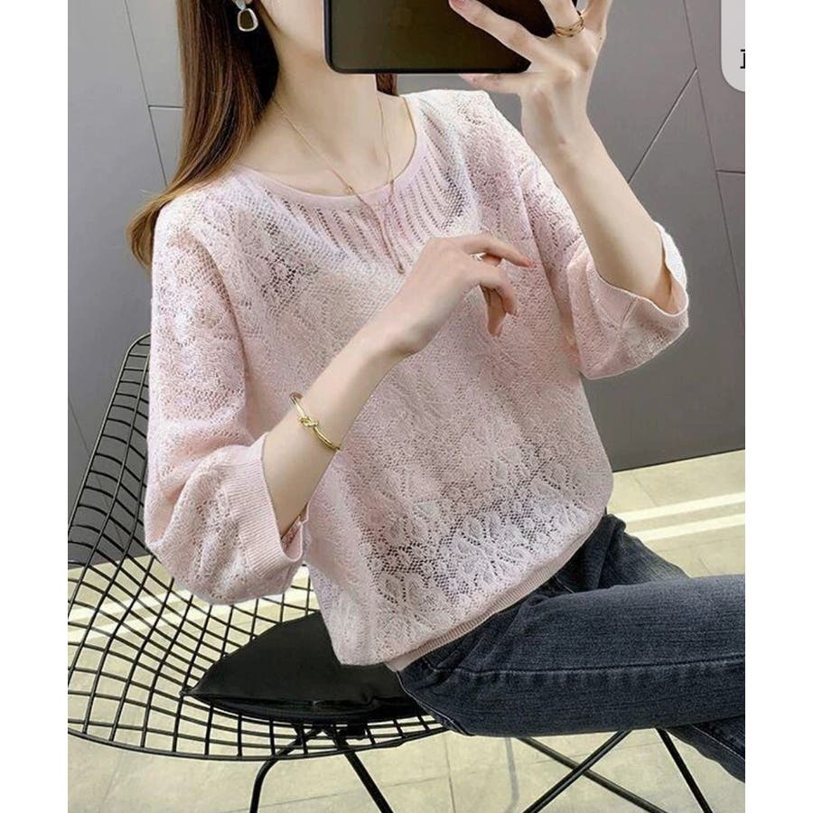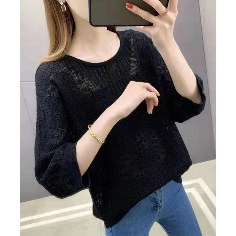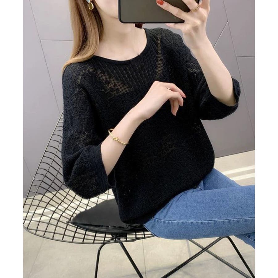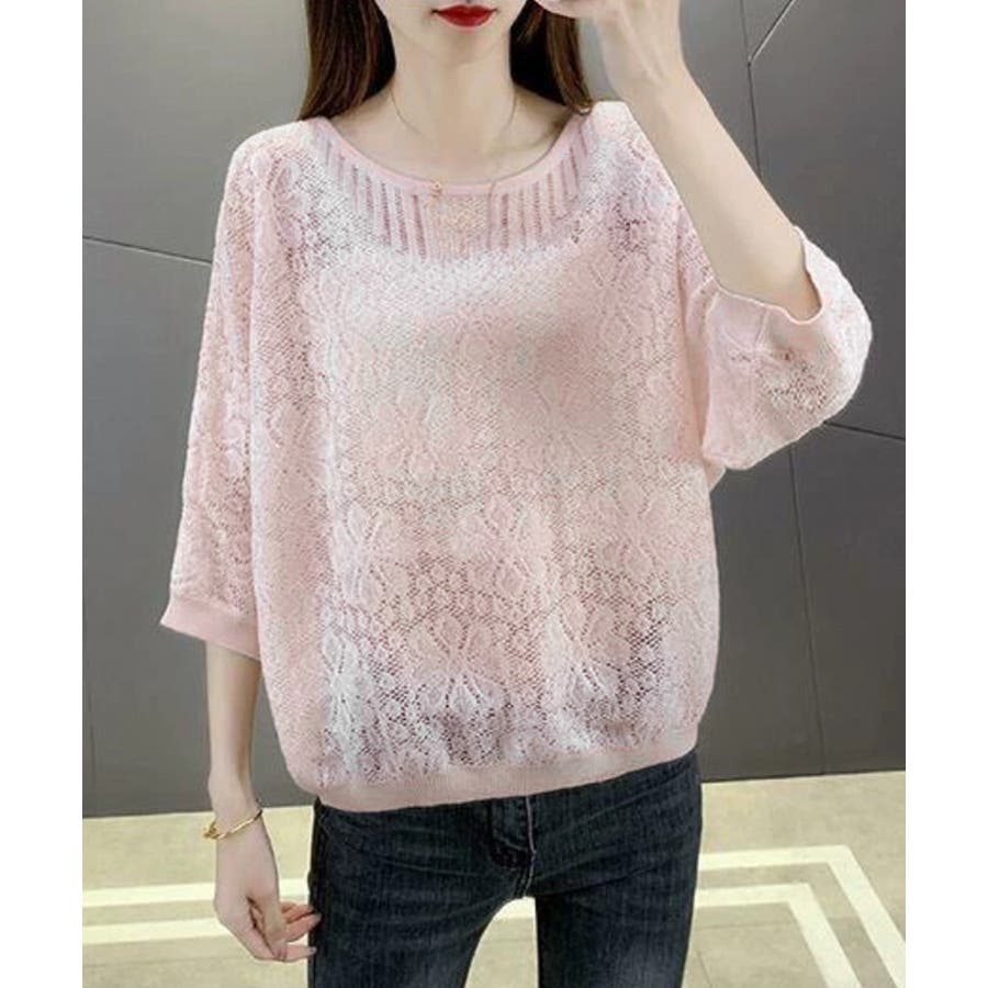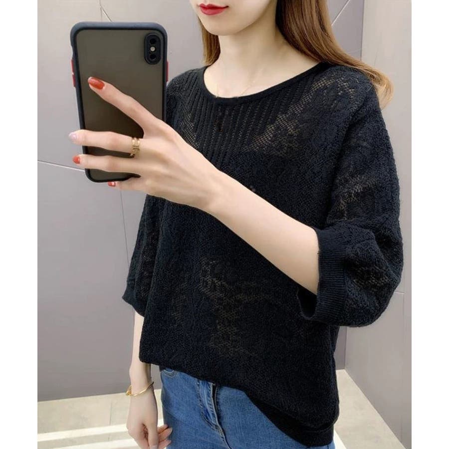 程よい透かし編みが大人の雰囲気を漂わせるドルマンサマーニットトップス