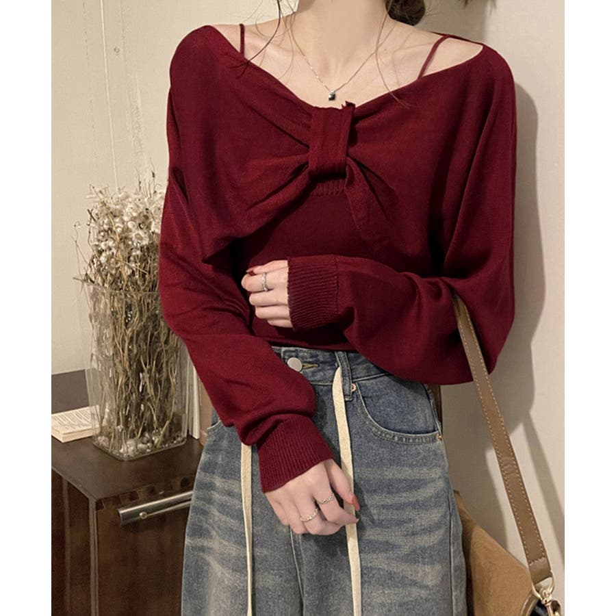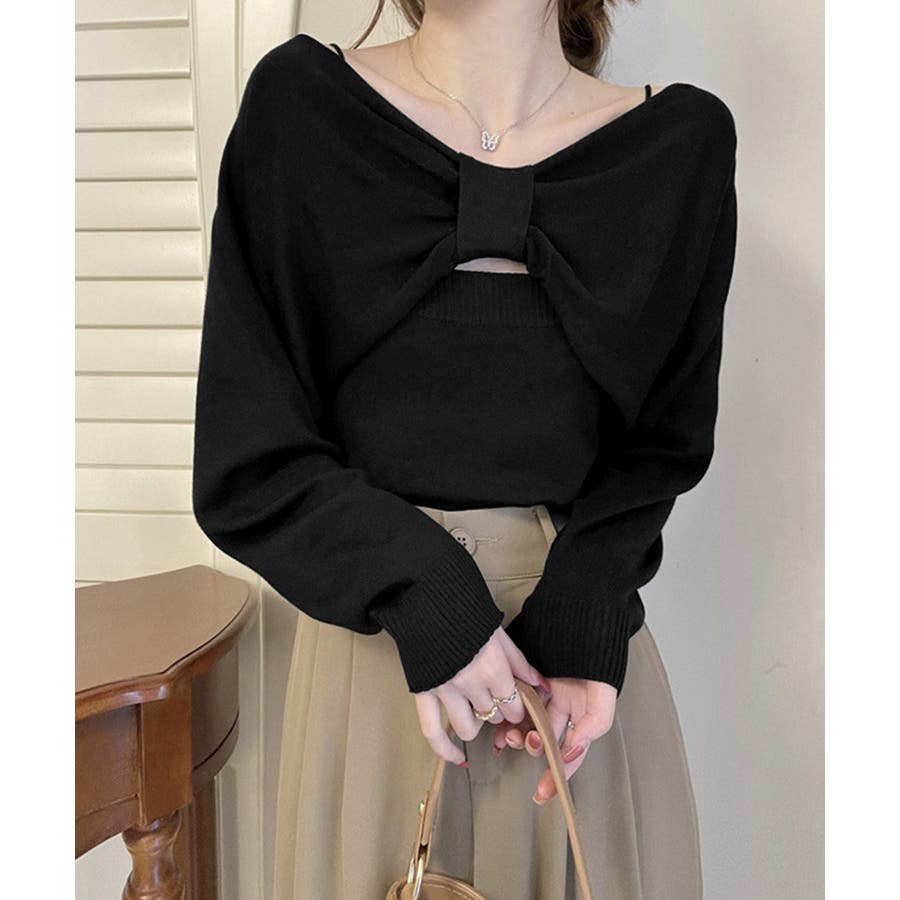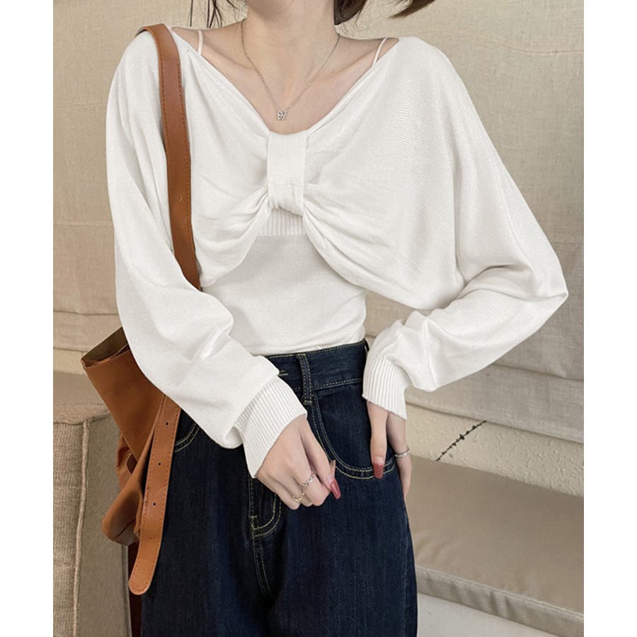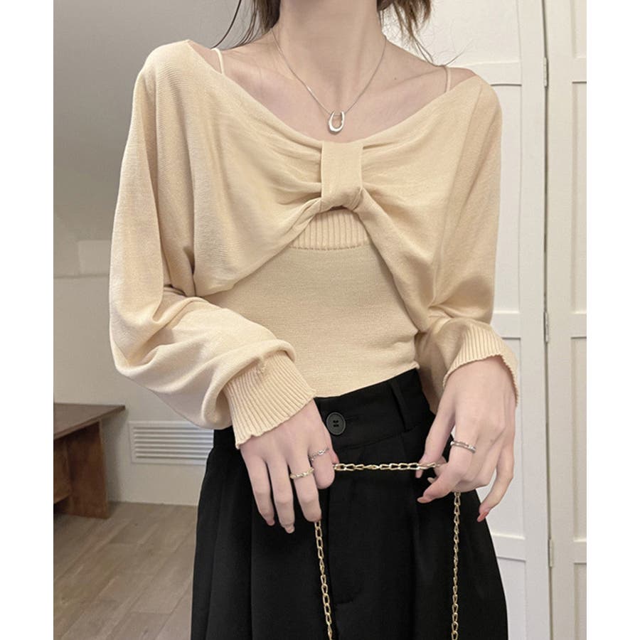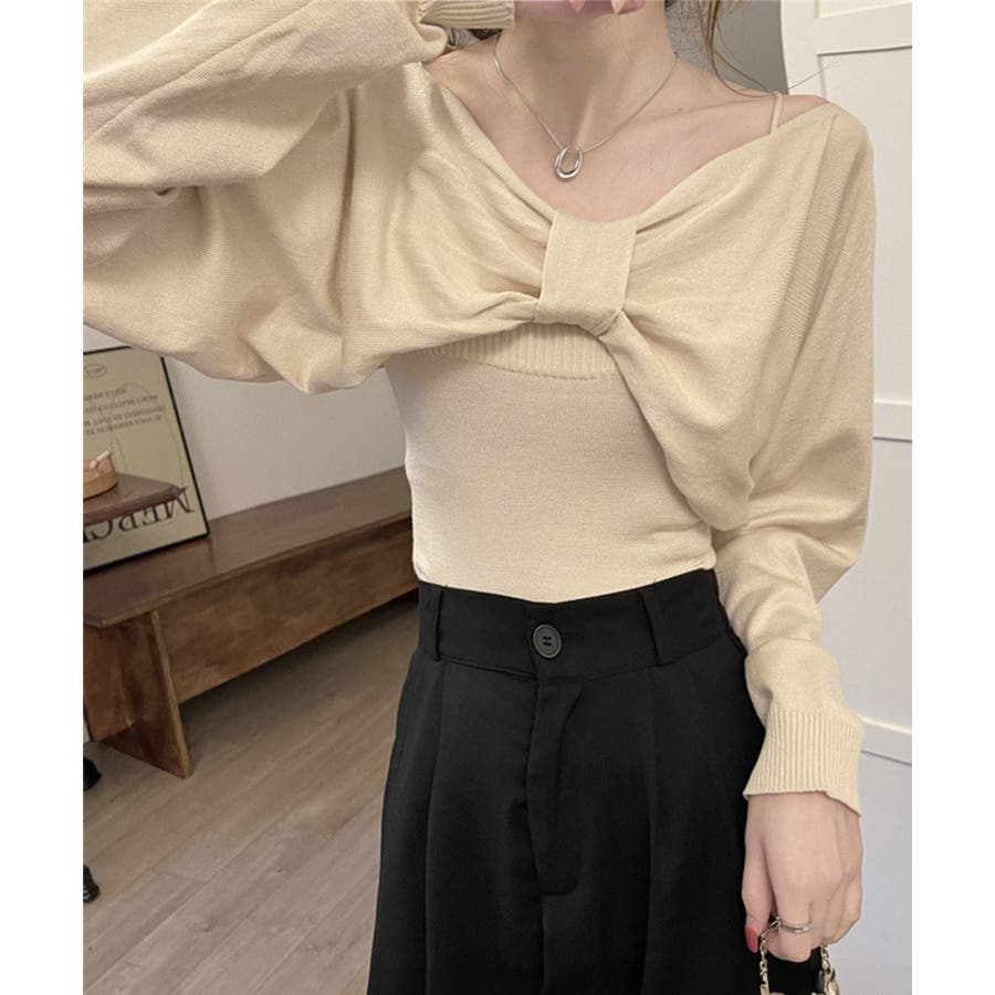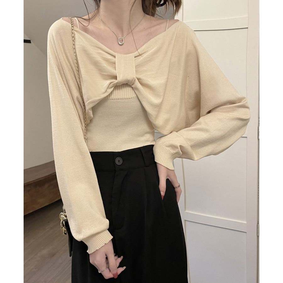 レディース カジュアル ニットアンサンブル ショート丈ニットトップス インナーキャミ2点セット 着回し 長袖プルオーバー