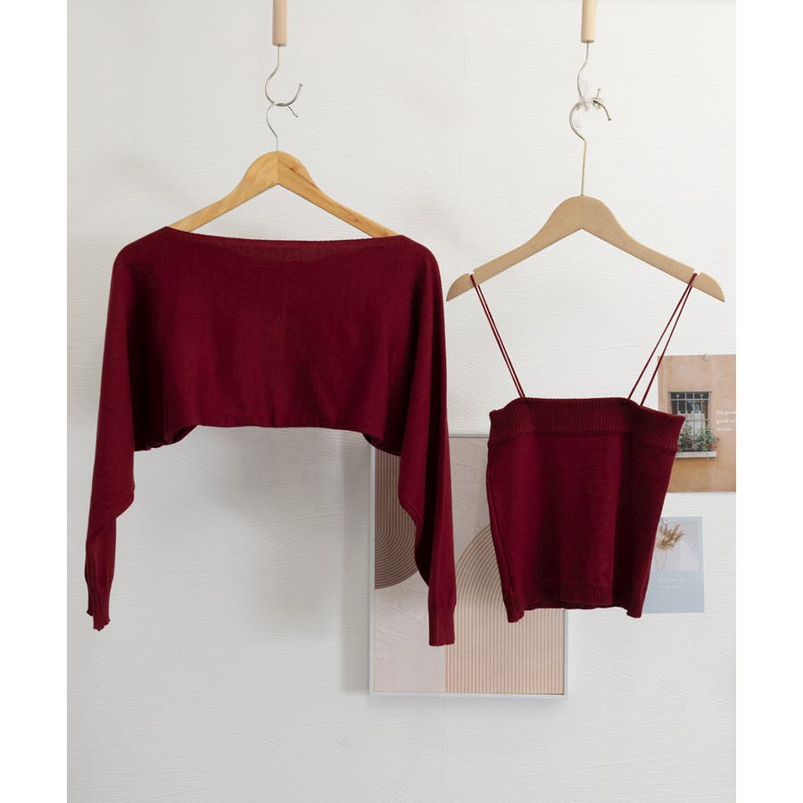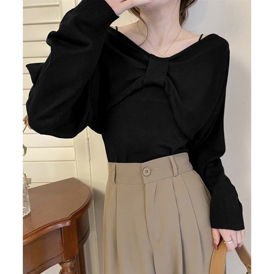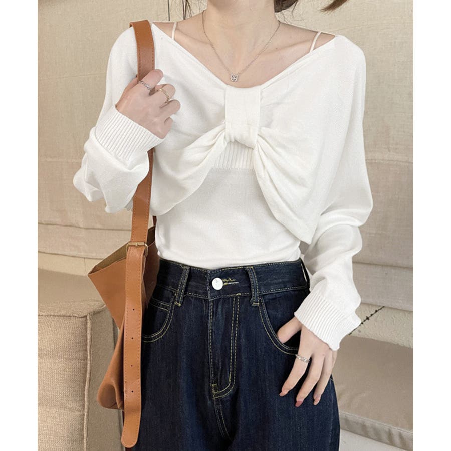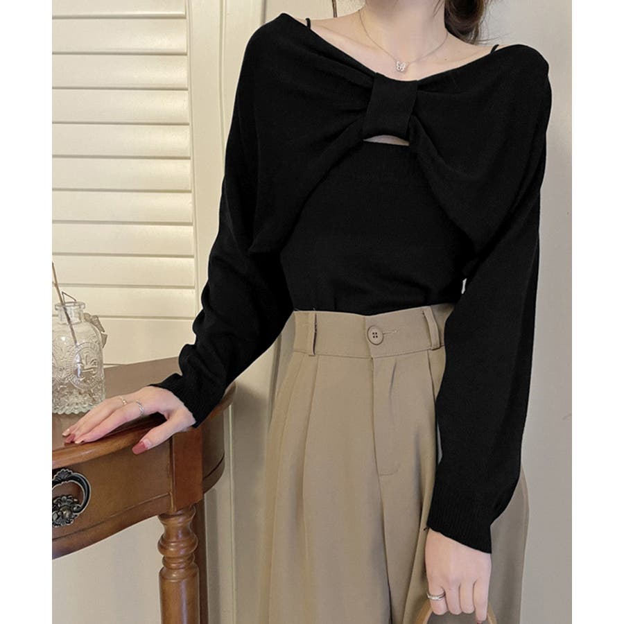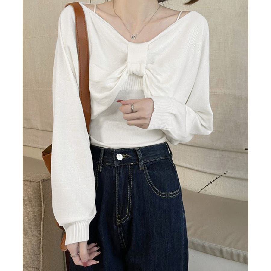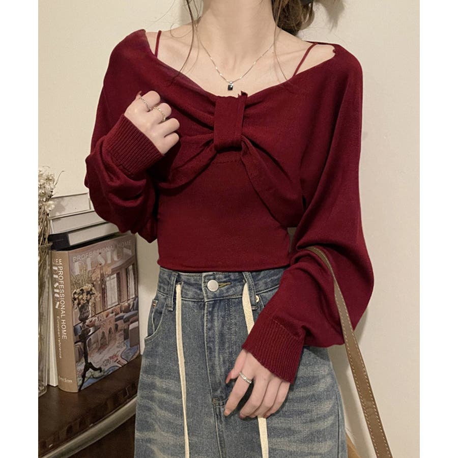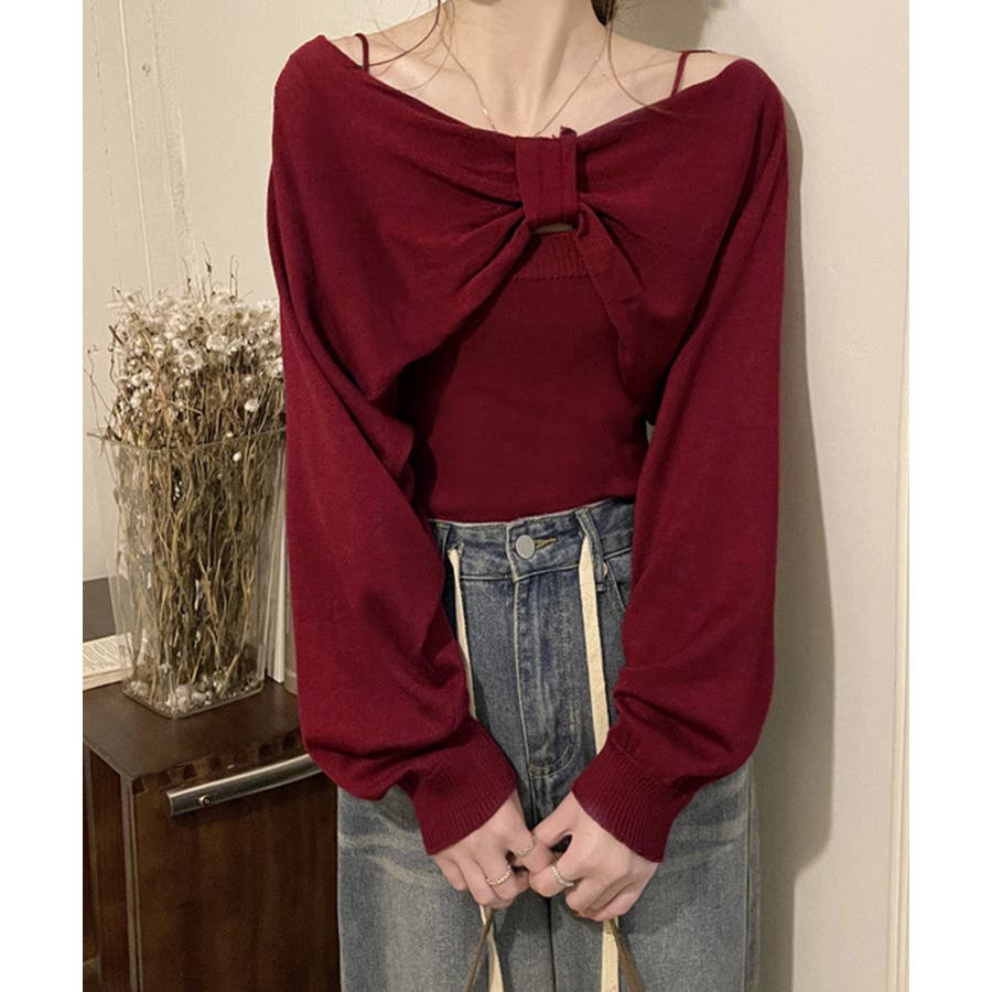 レディース カジュアル ニットアンサンブル ショート丈ニットトップス インナーキャミ2点セット 着回し 長袖プルオーバー
