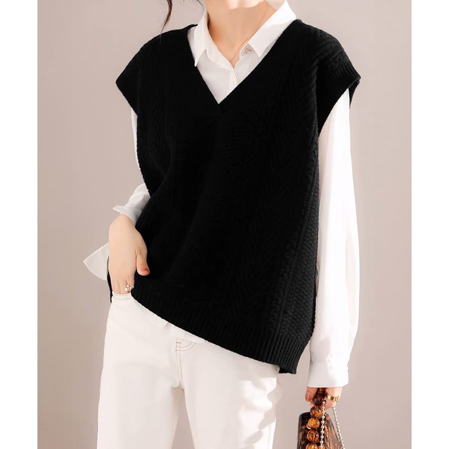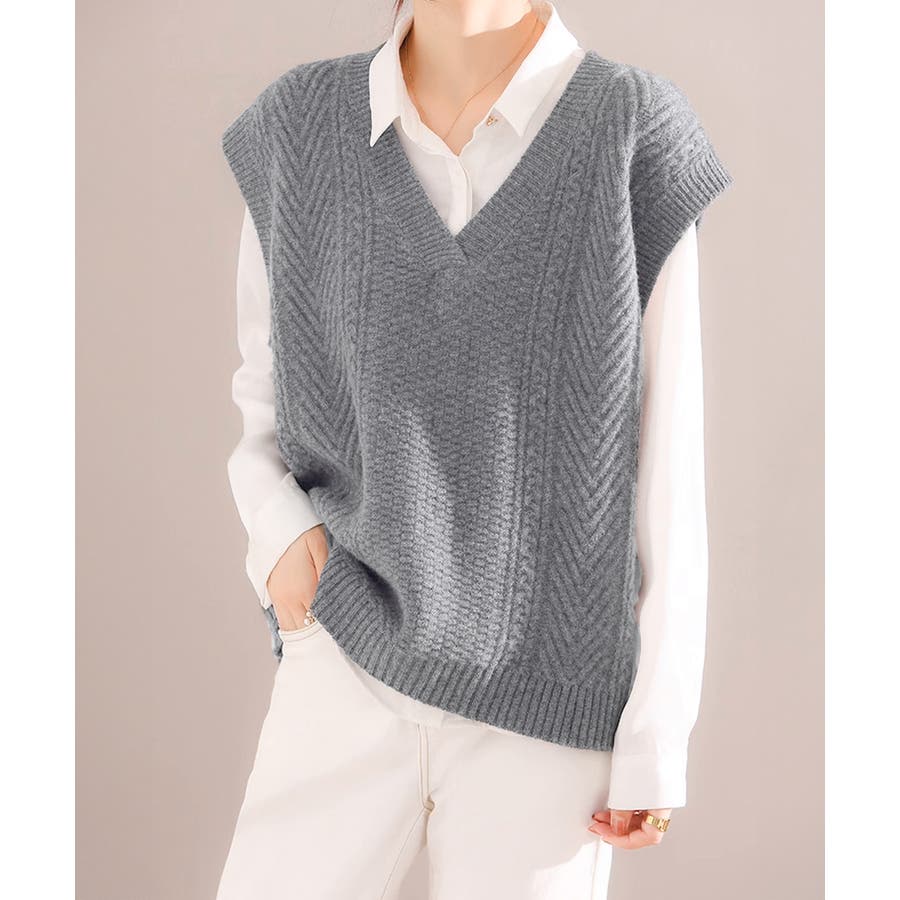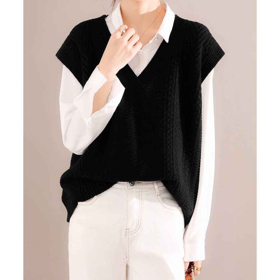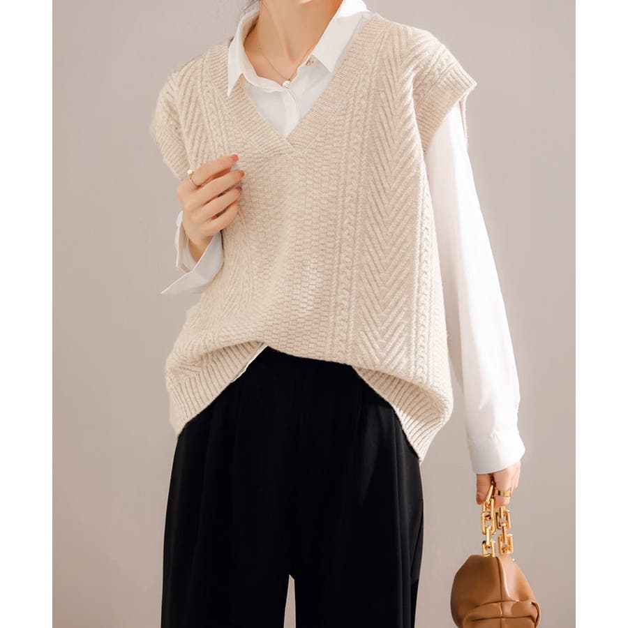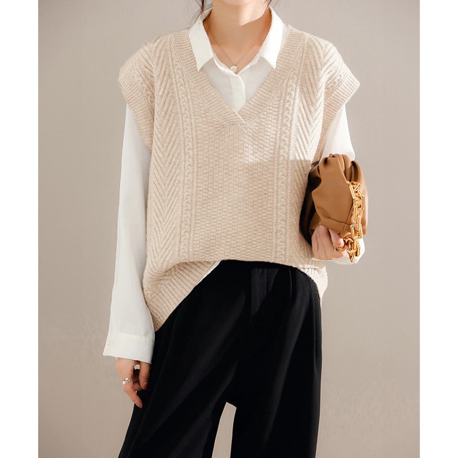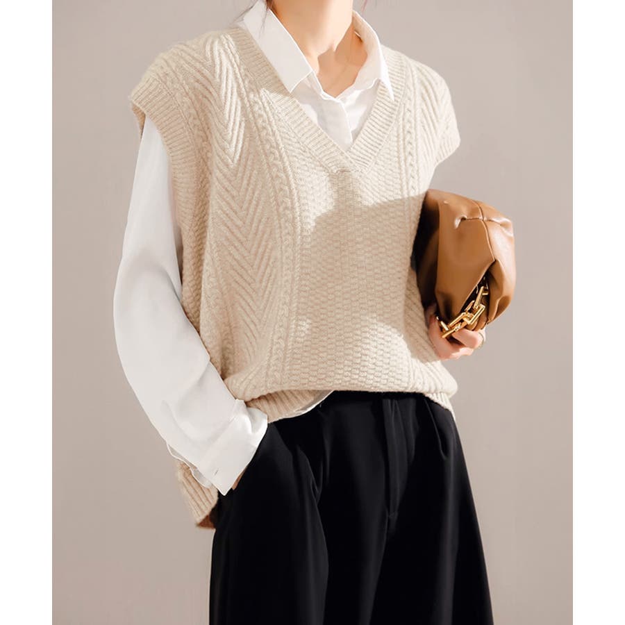 ケーブル編みデザインがアクセントになり、シンプルなコーディネートでも存在感を発揮するニットベスト。