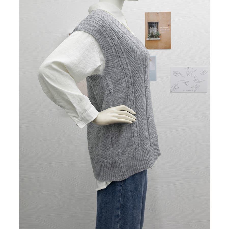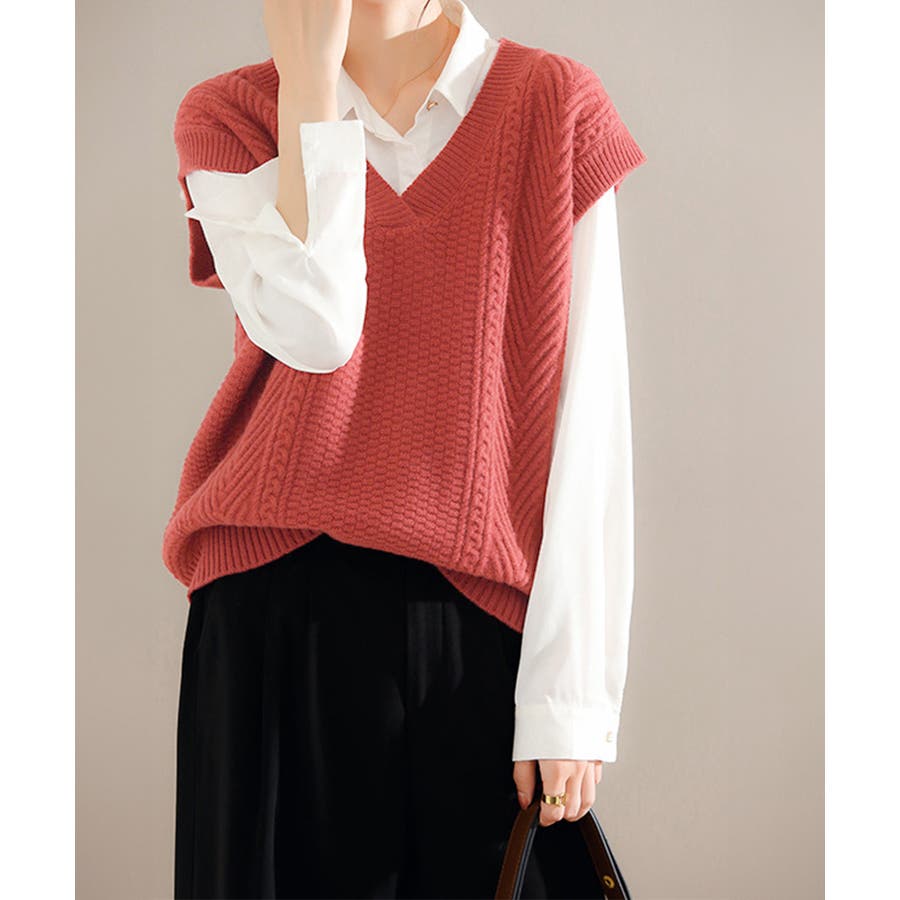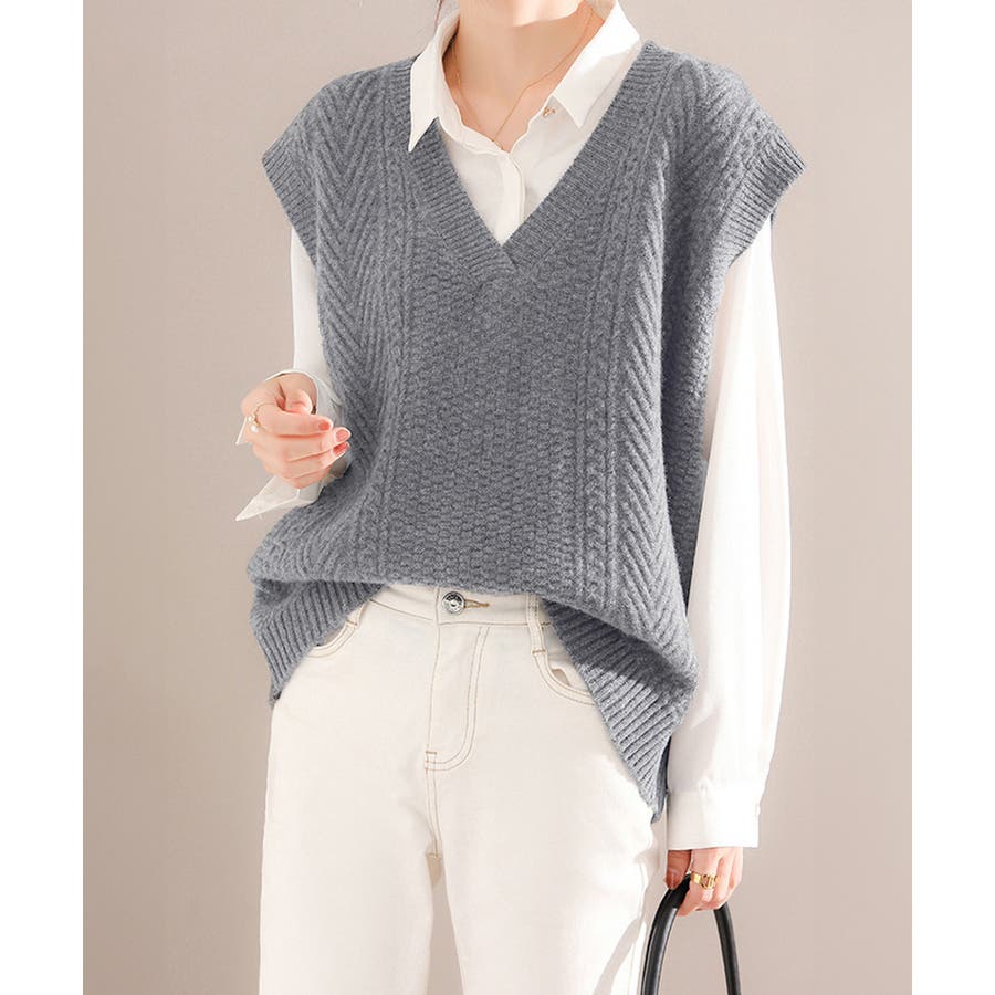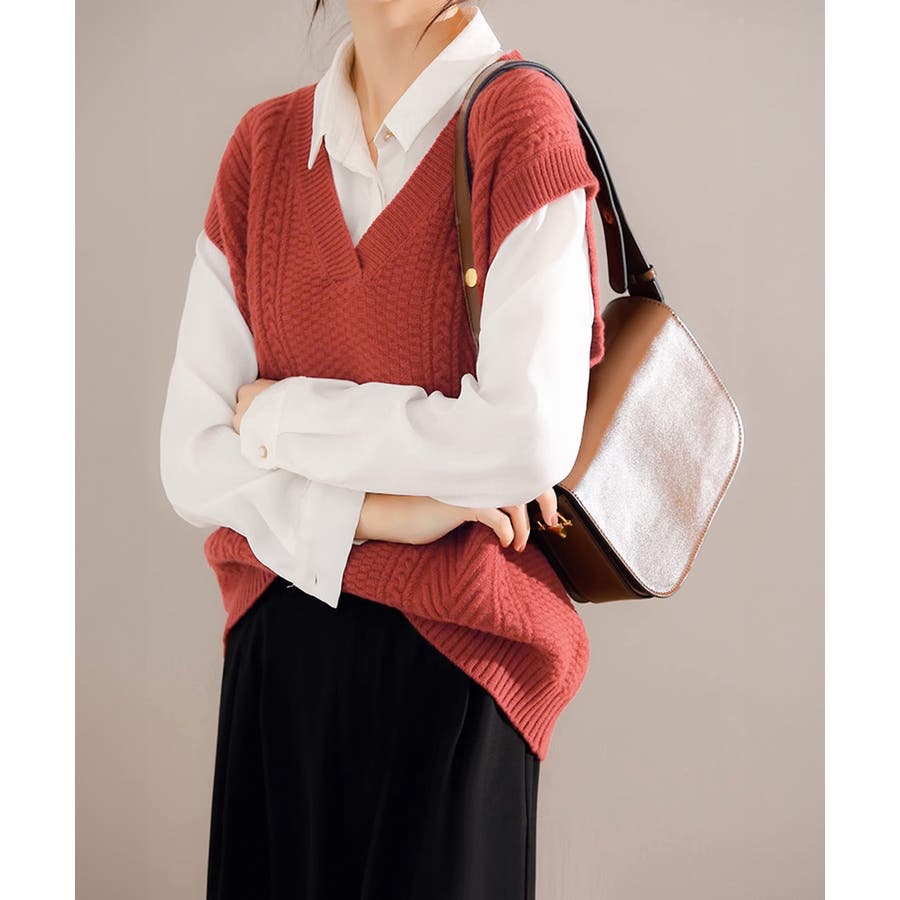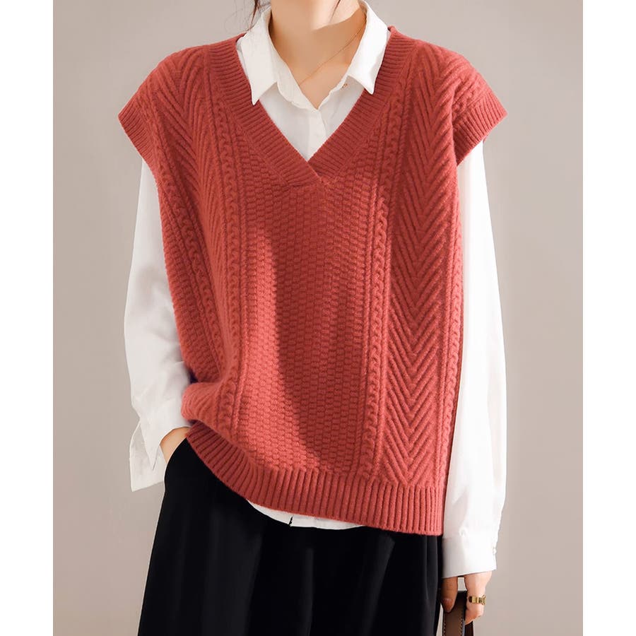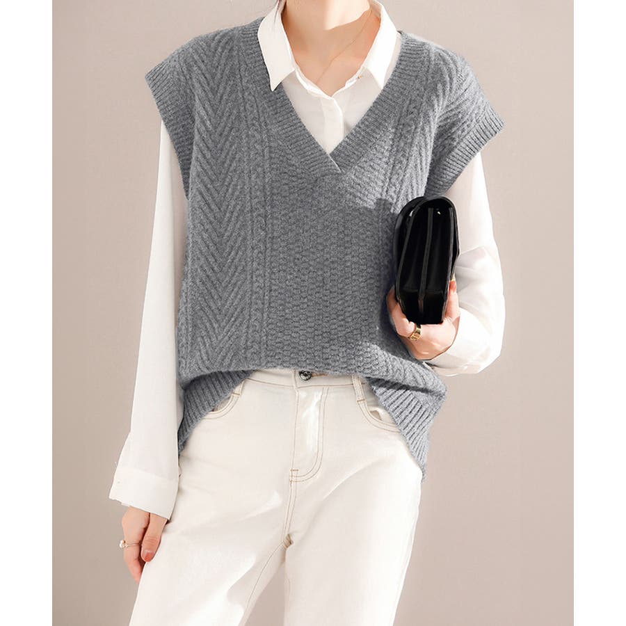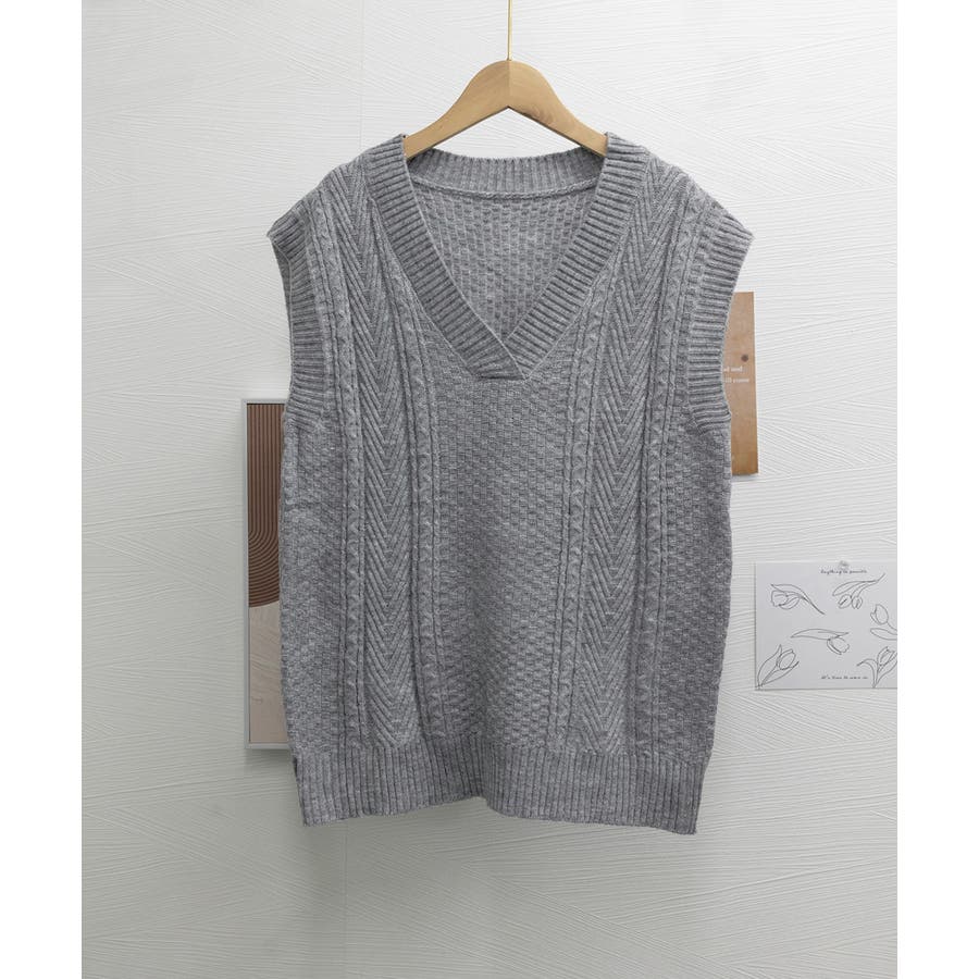 ケーブル編みデザインがアクセントになり、シンプルなコーディネートでも存在感を発揮するニットベスト。