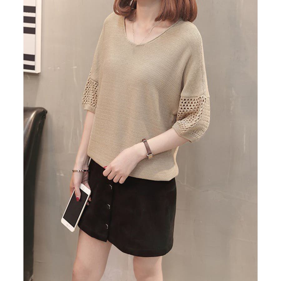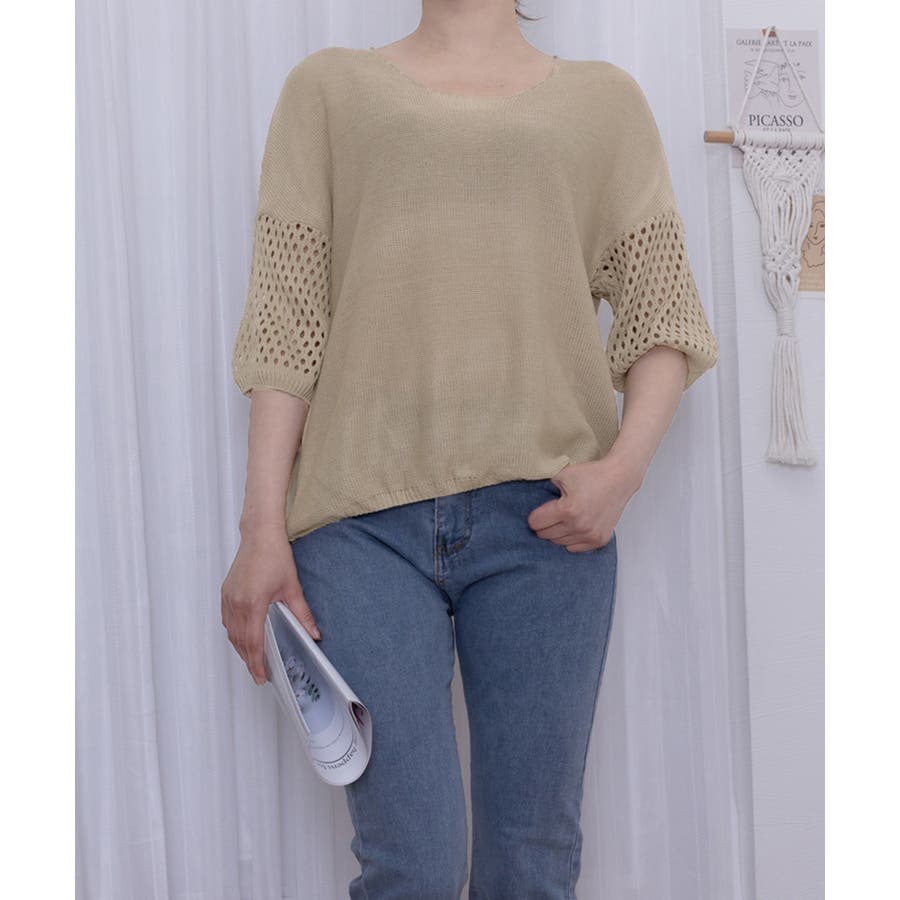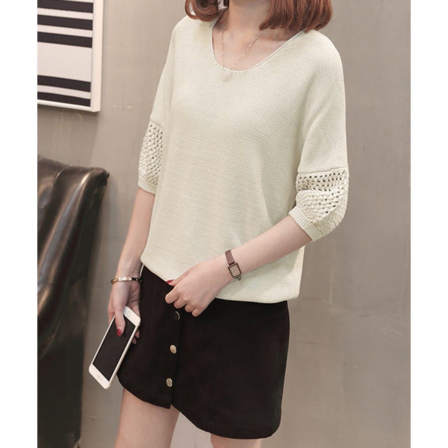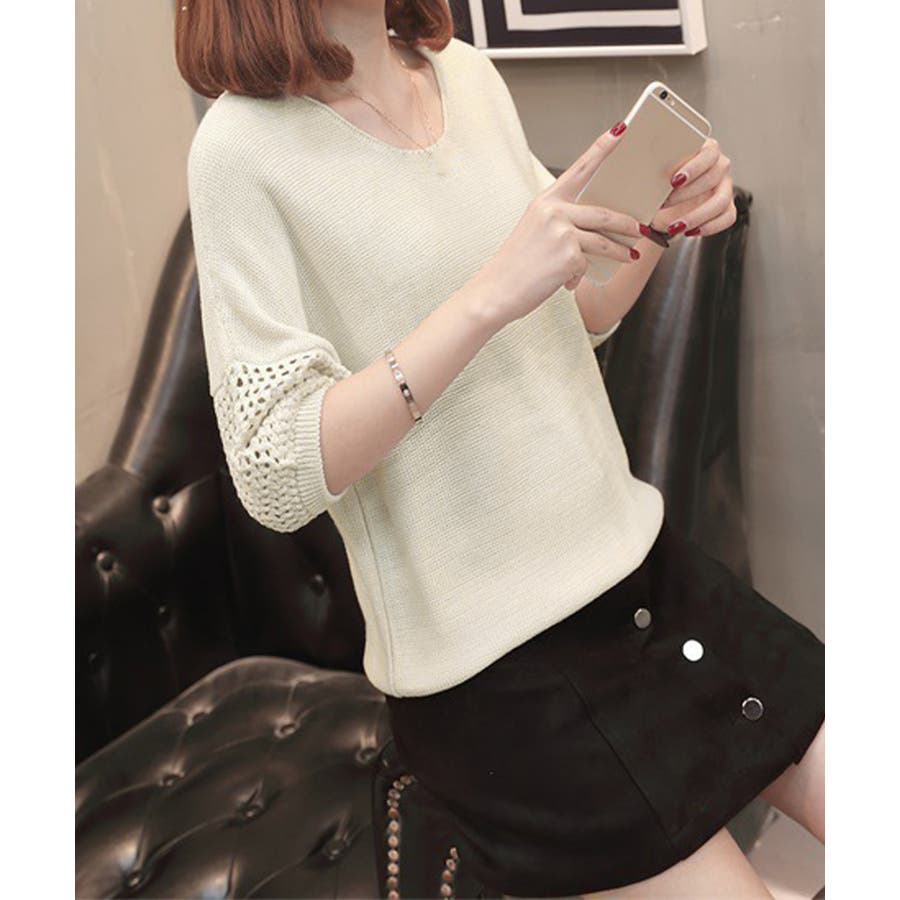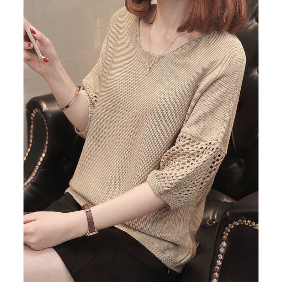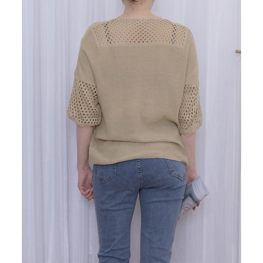 透かし編みスリーブがポイントの、涼しげな半袖ニットトップス