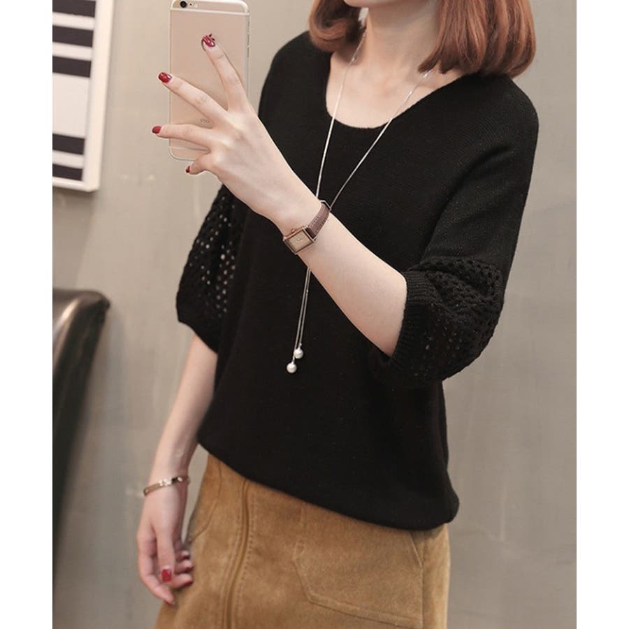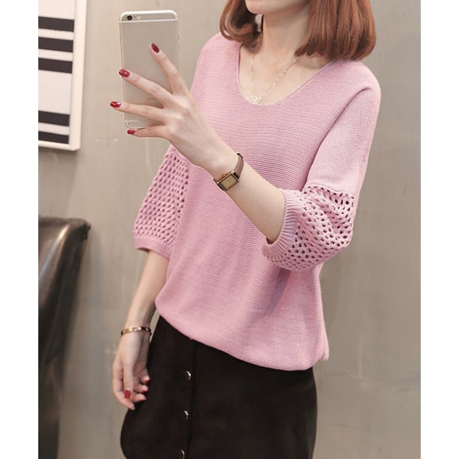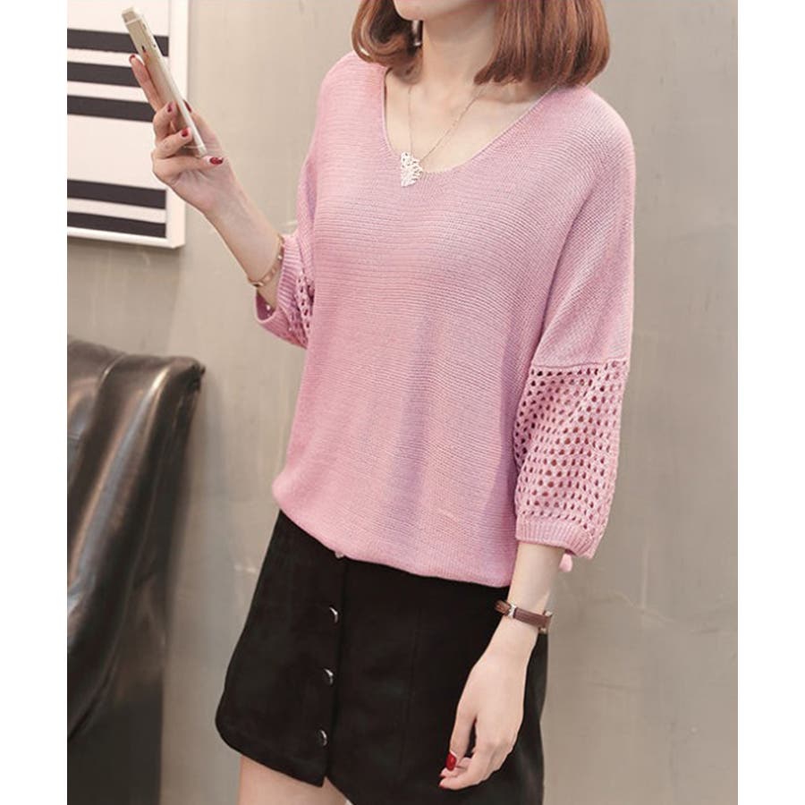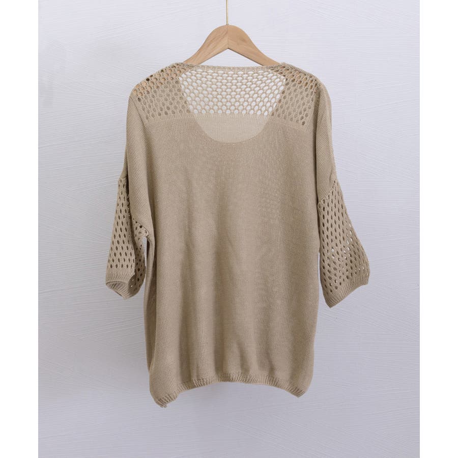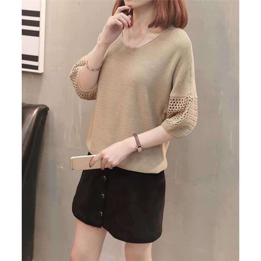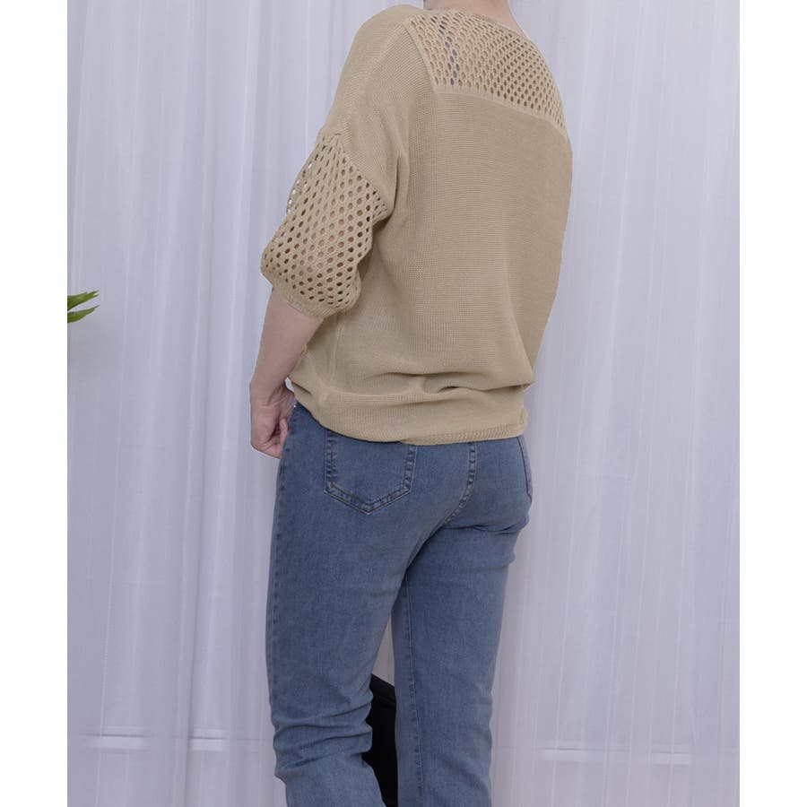 透かし編みスリーブがポイントの、涼しげな半袖ニットトップス