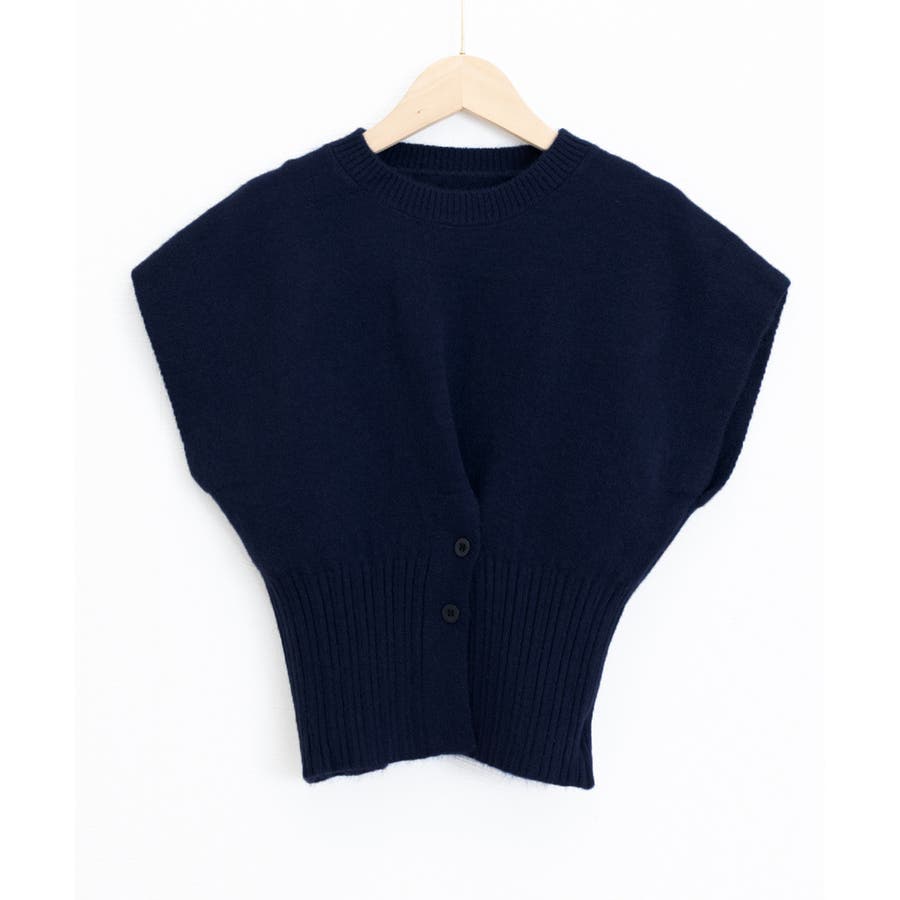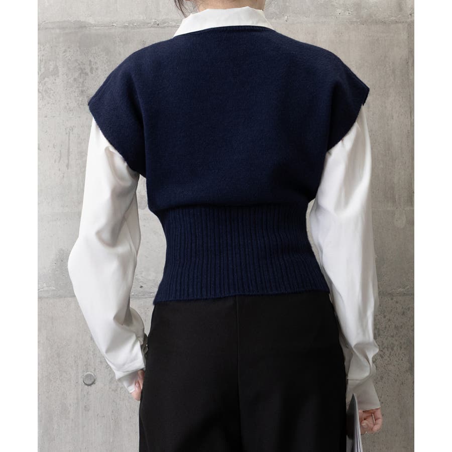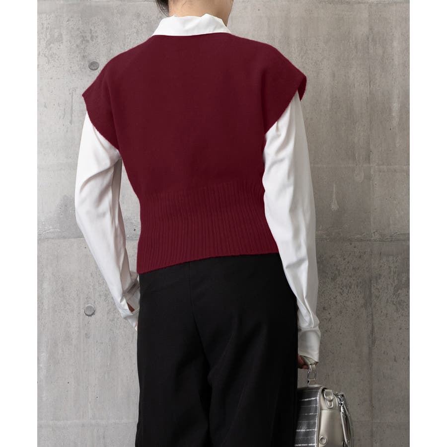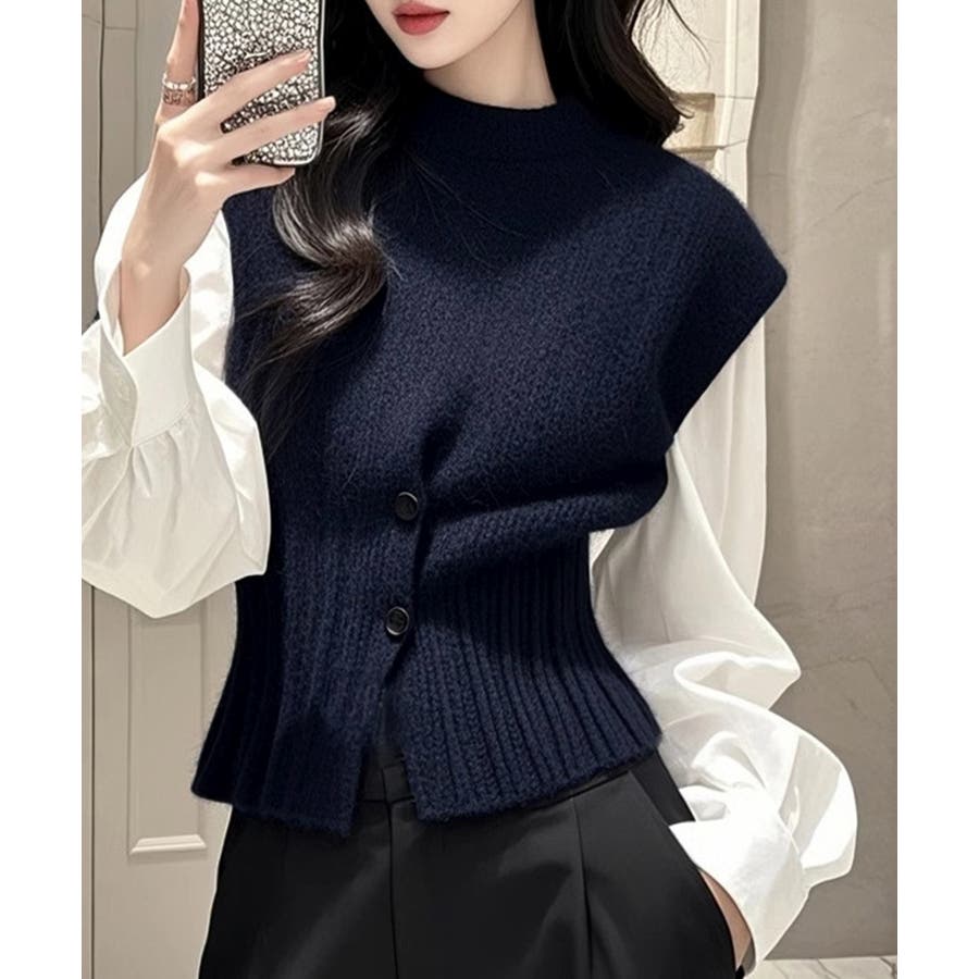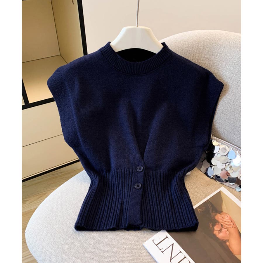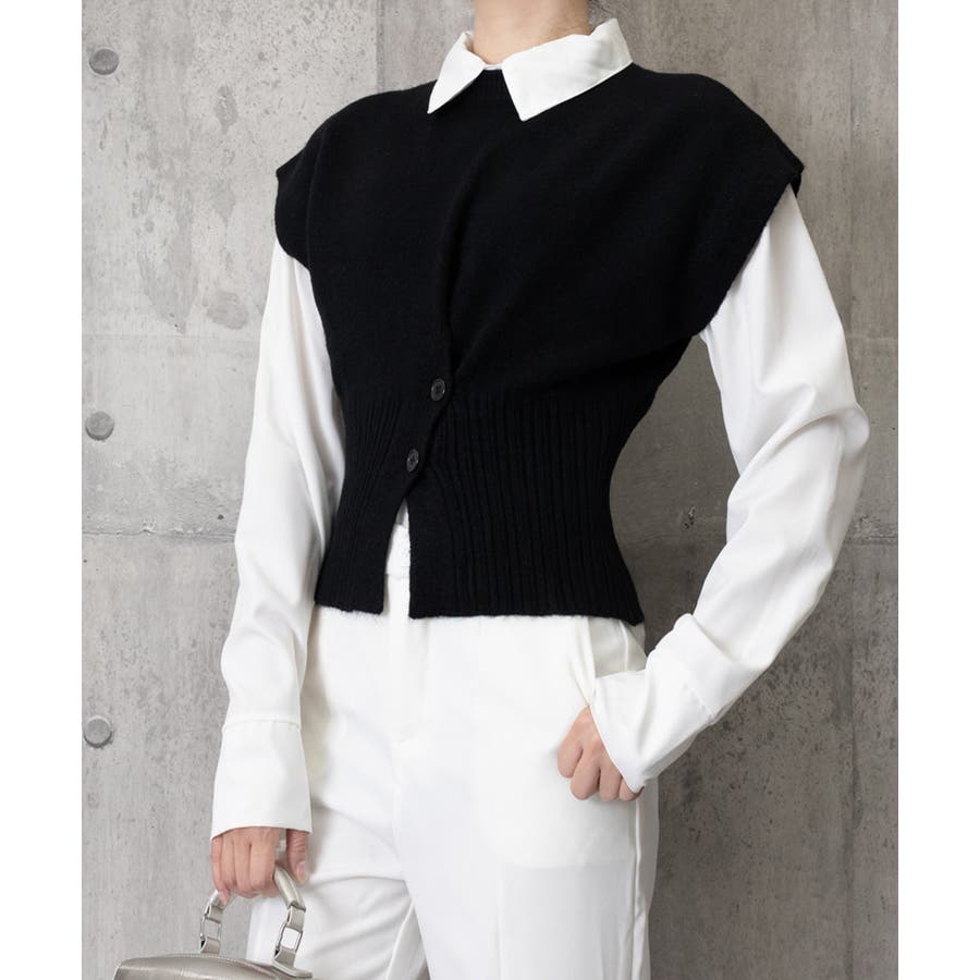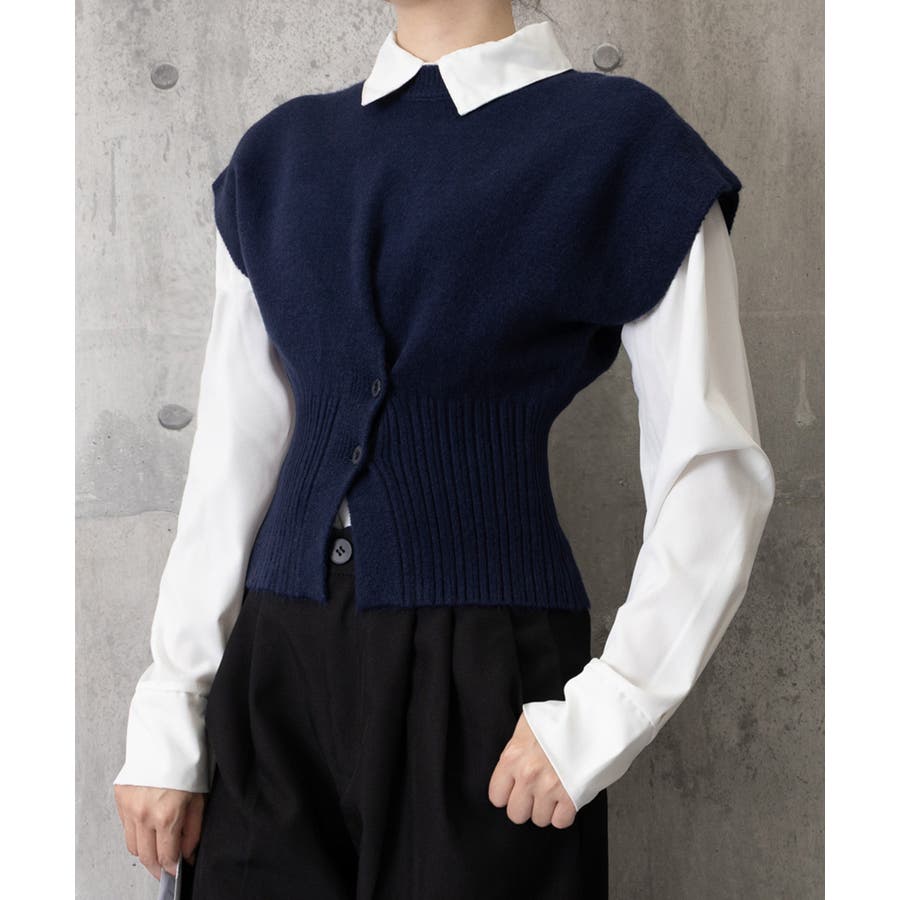 リブ切り替えとフロントボタンがアクセントになった上品なニットベスト。