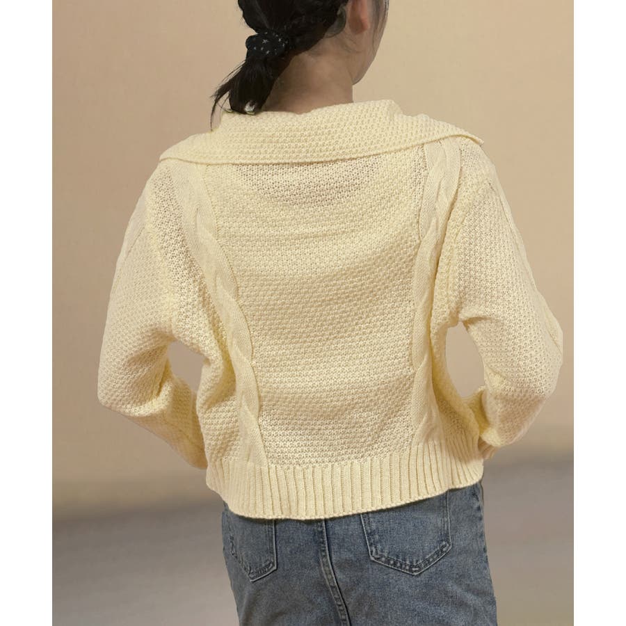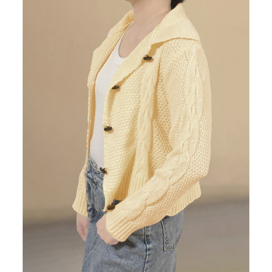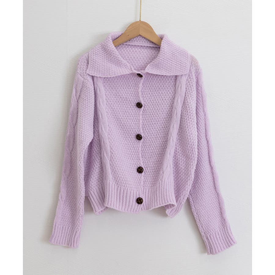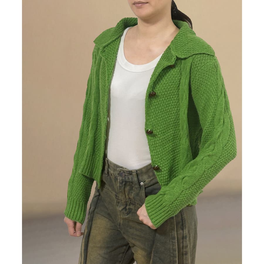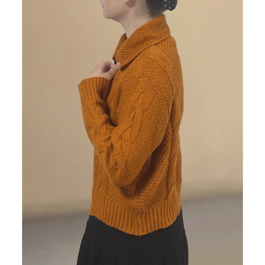 ざっくりとしたケーブル編みと立体感のあるビッグカラーが華やかさを添えるショート丈ニットカーディガン。
