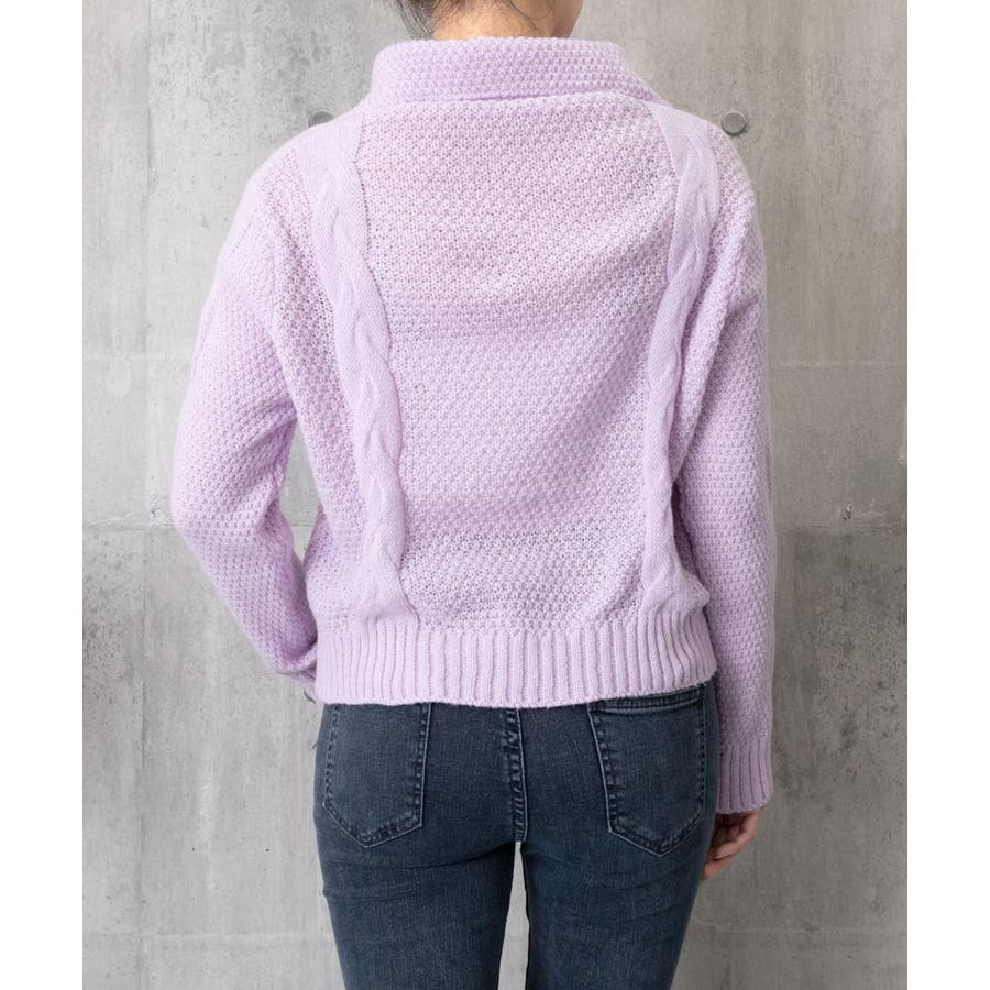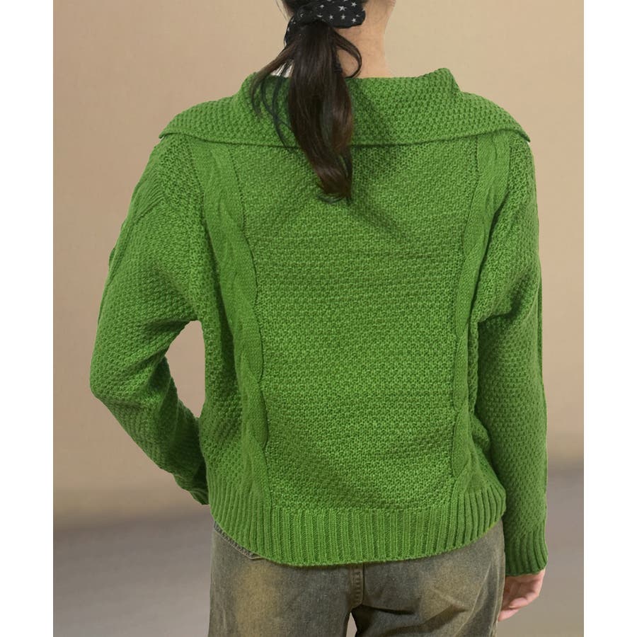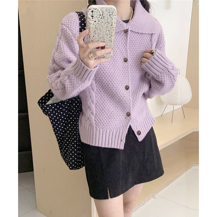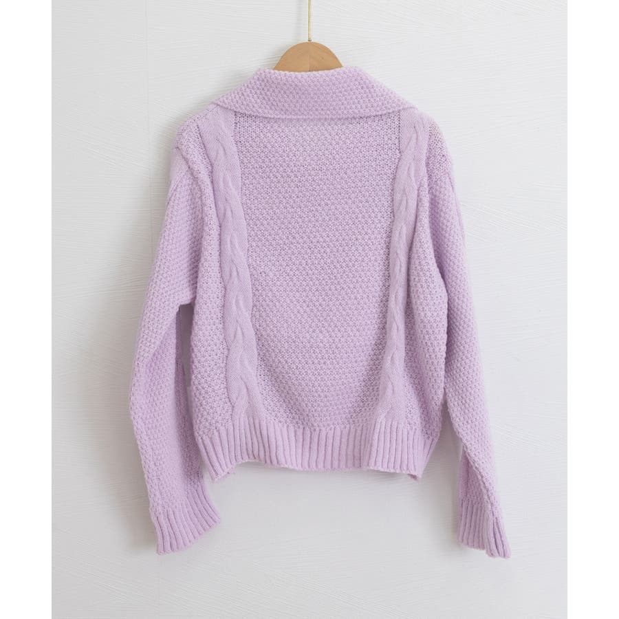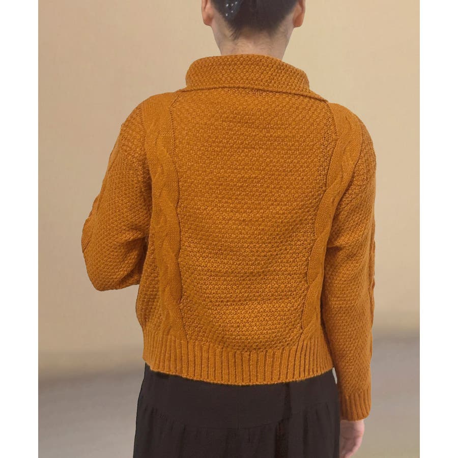 ざっくりとしたケーブル編みと立体感のあるビッグカラーが華やかさを添えるショート丈ニットカーディガン。