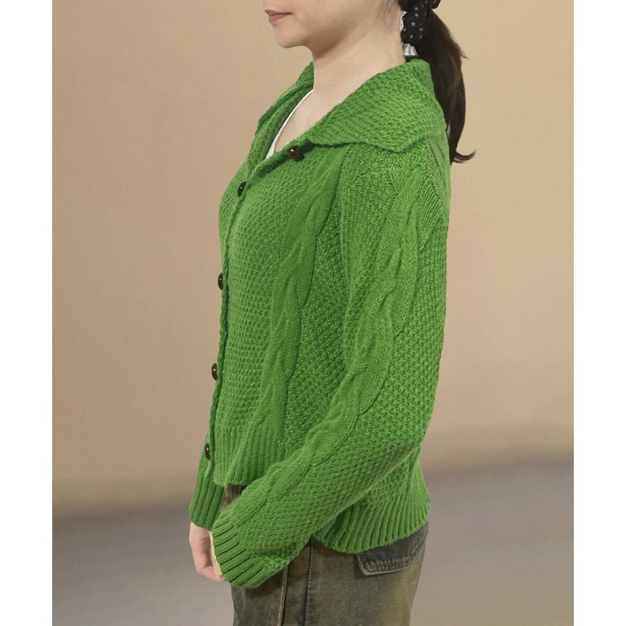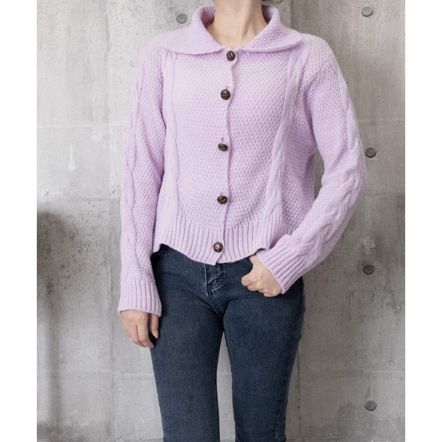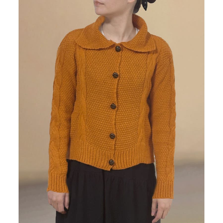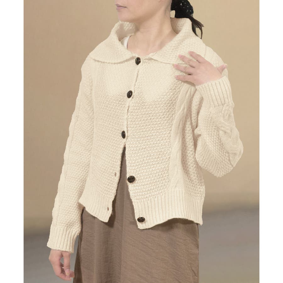 ケーブル編みニットカーディガン ビッグ襟