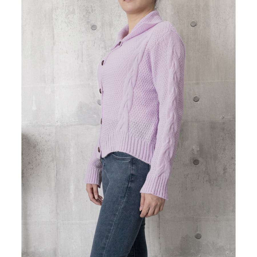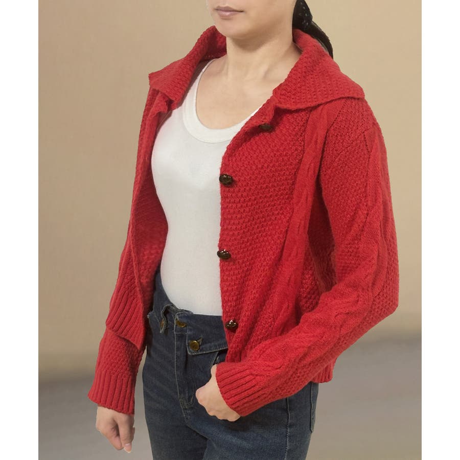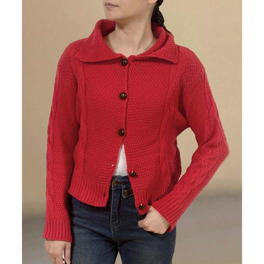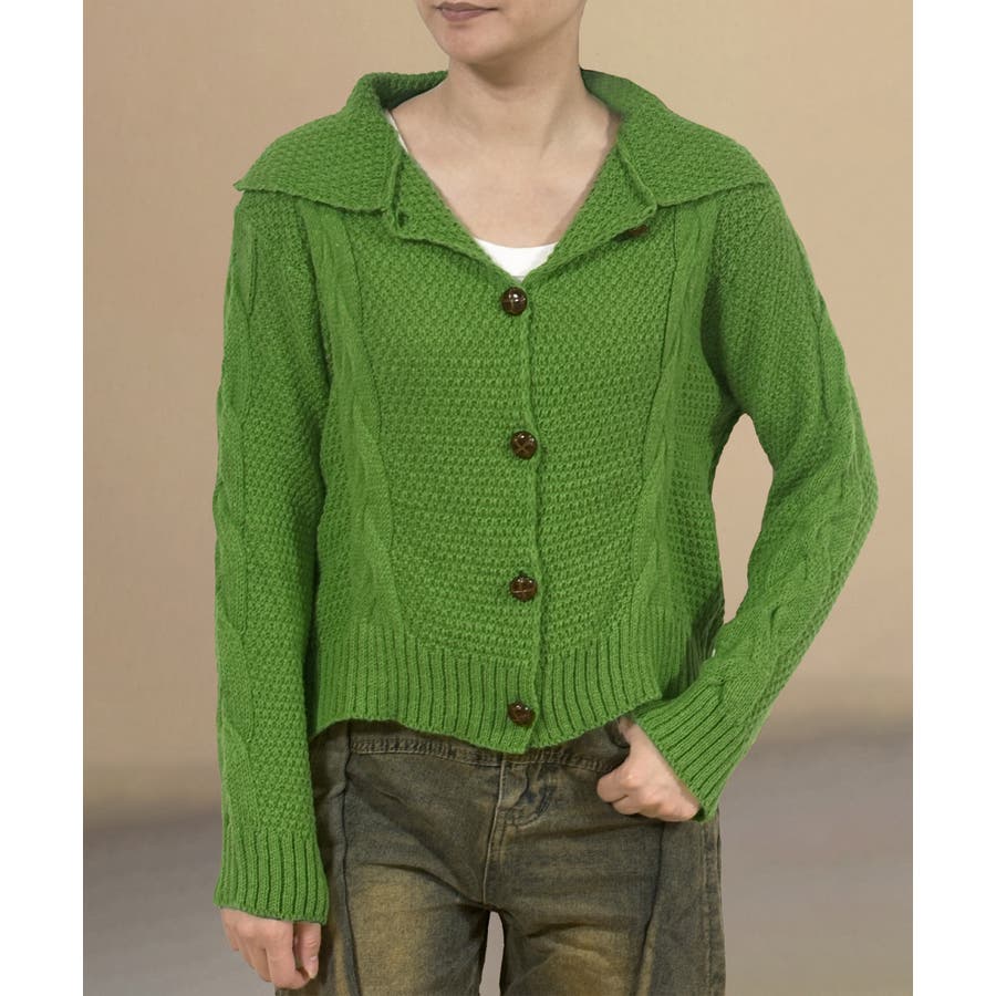 ケーブル編みニットカーディガン ビッグ襟
