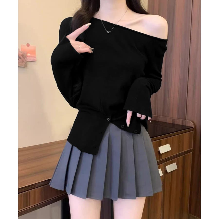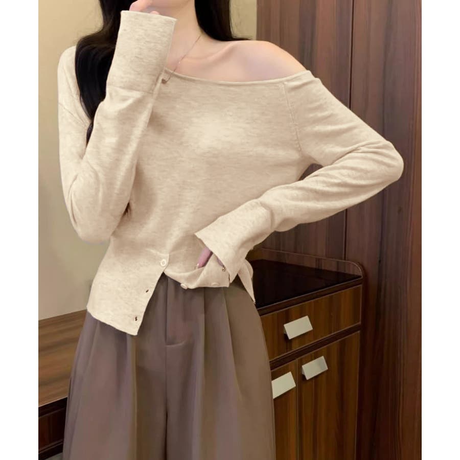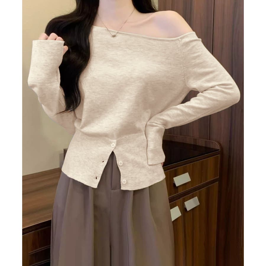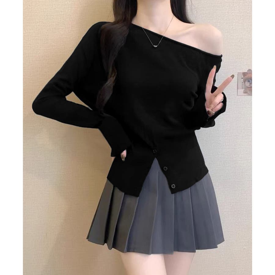 ワンショルダーニットトップス裾ボタン秋服
