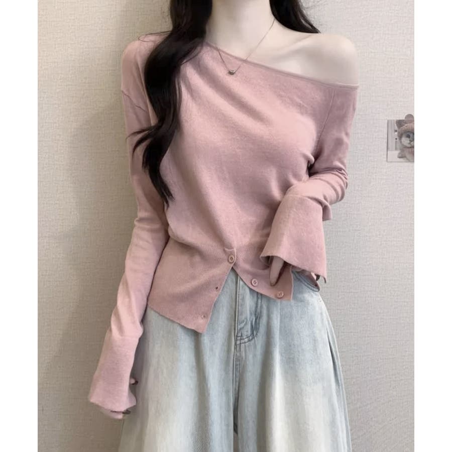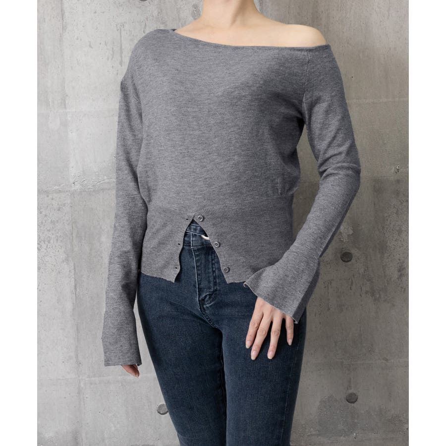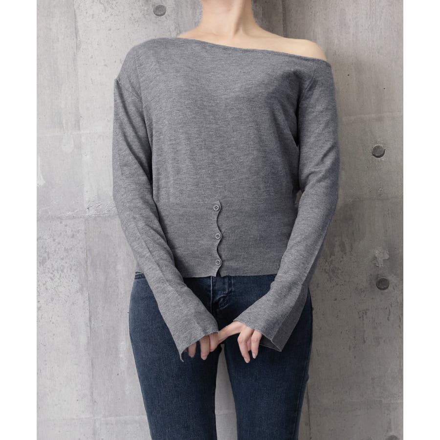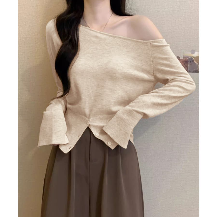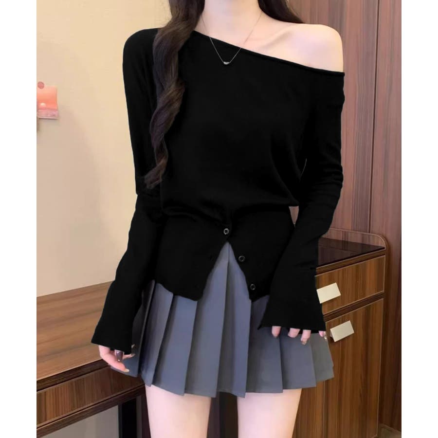 ワンショルダーニットトップス裾ボタン秋服